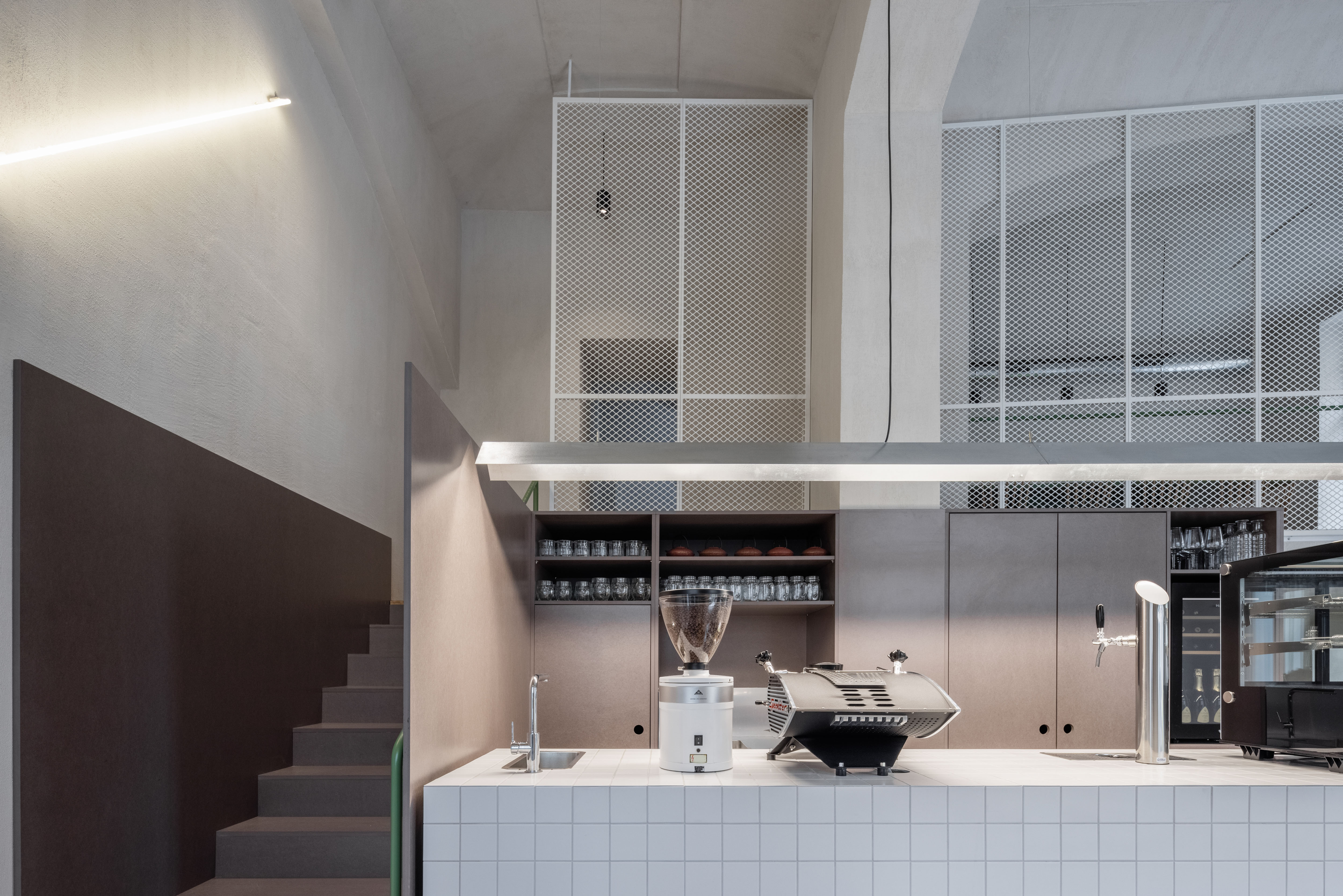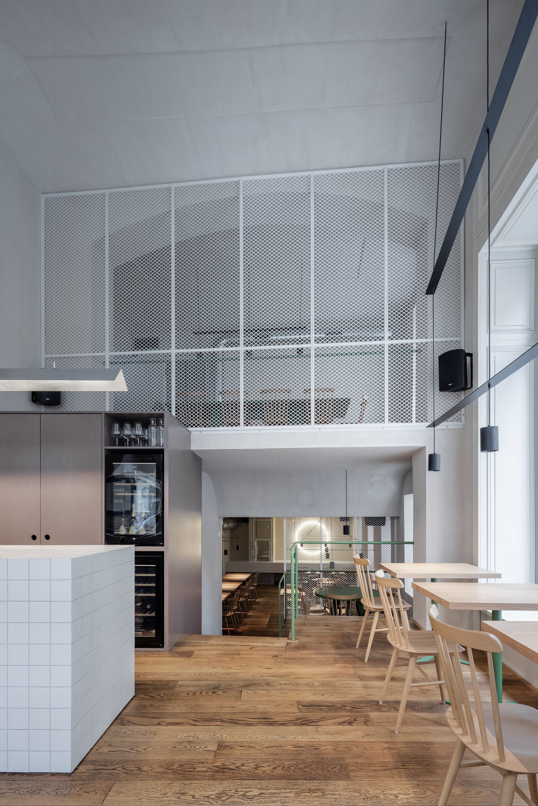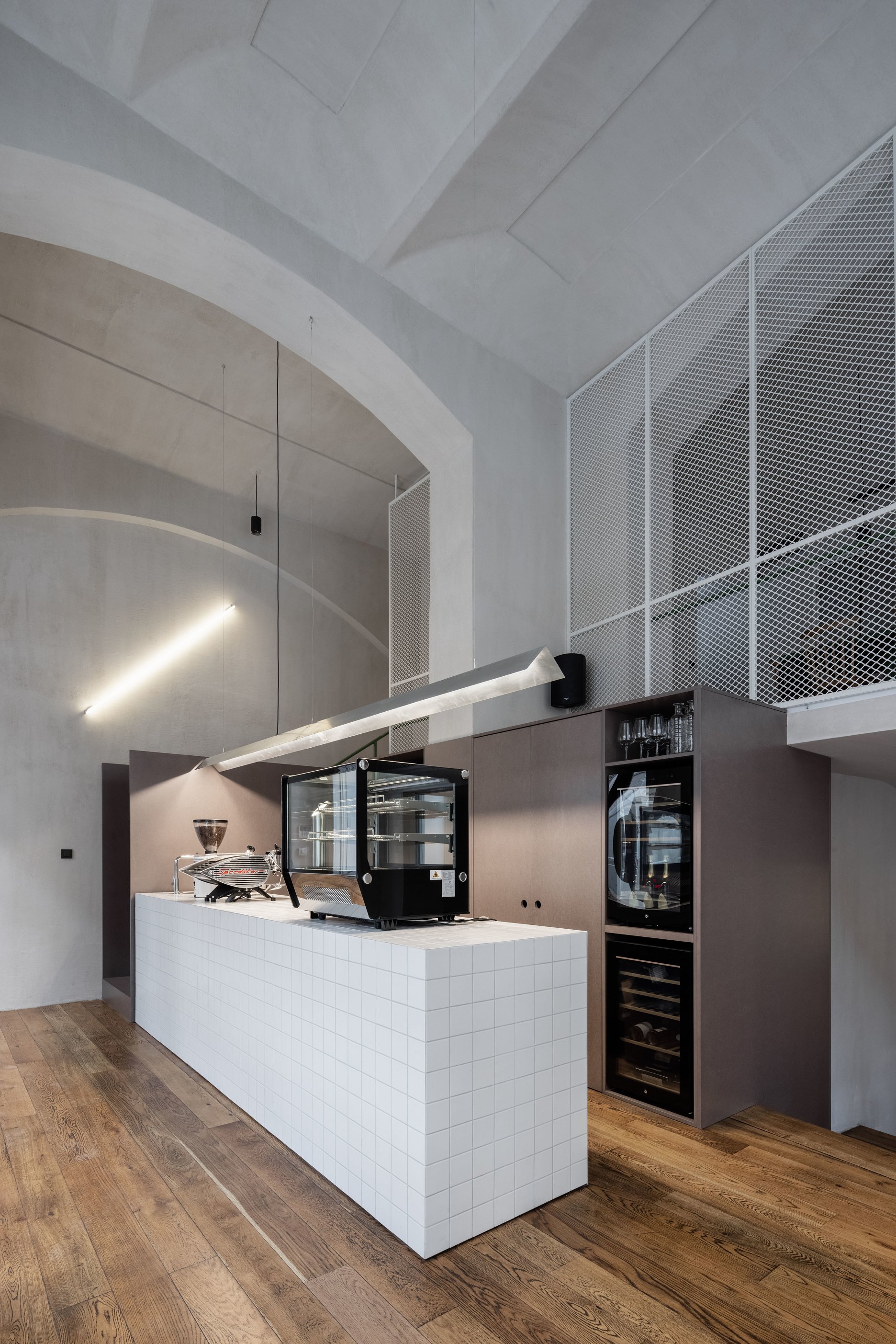 Klenutý priestor, delený na viacero výškových úrovní, je vizuálne zjednotený a doplnený o solitérne prvky. Vstup do reštauračnej časti akcentuje box zo sivej mdf dosky, ktorý zároveň vytvára kulisu pre barový pult s bielym obkladom. Tmavý stolársky prvok zakrýva nerovnosti priestoru a integruje potrebné zázemie, vrátane schodiska vedúceho do privátnejšej časti reštaurácie a kuchyne. Celú kompozíciu dopĺňa výrazné svietidlo z ohýbaného pozinkovaného plechu nad barom.