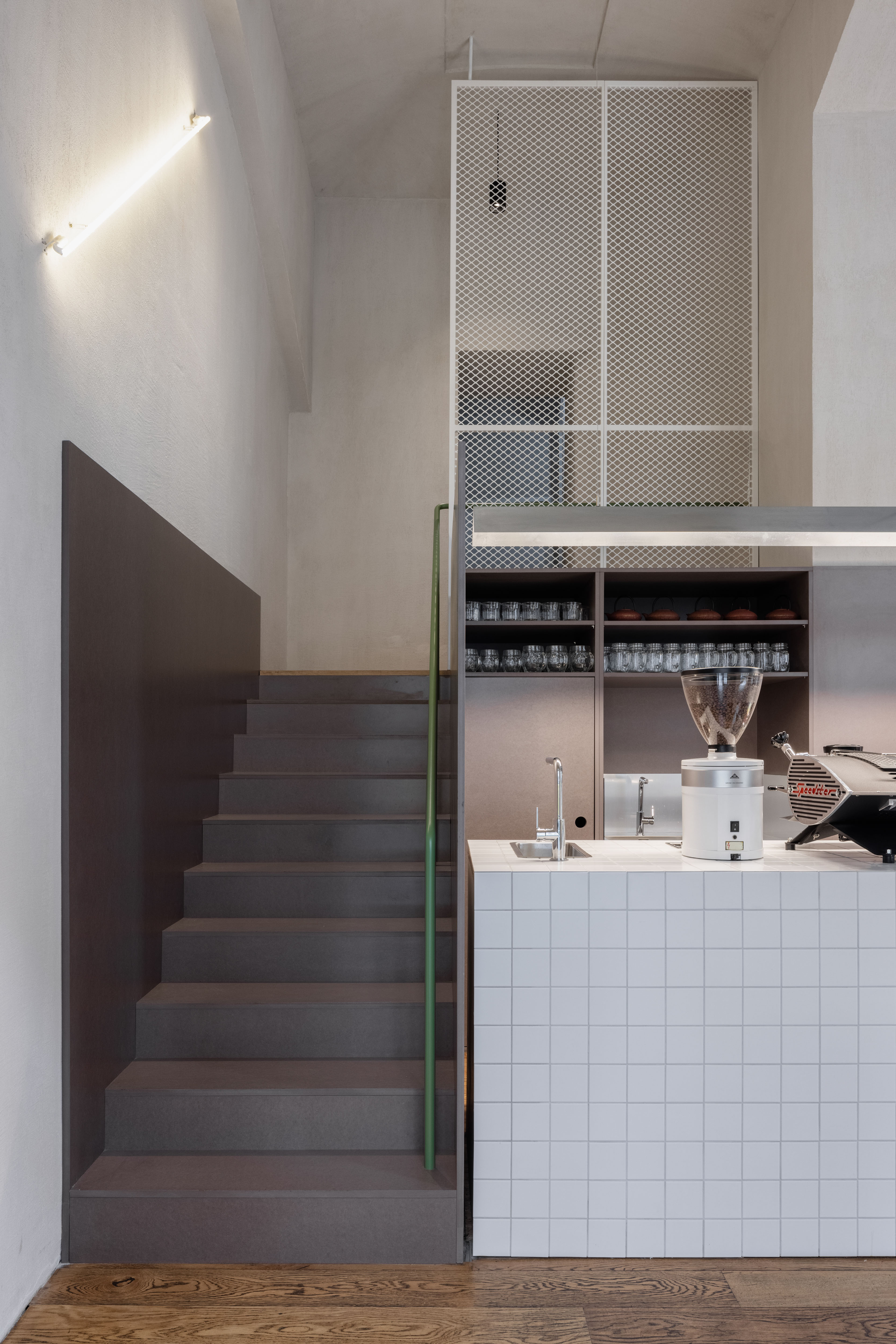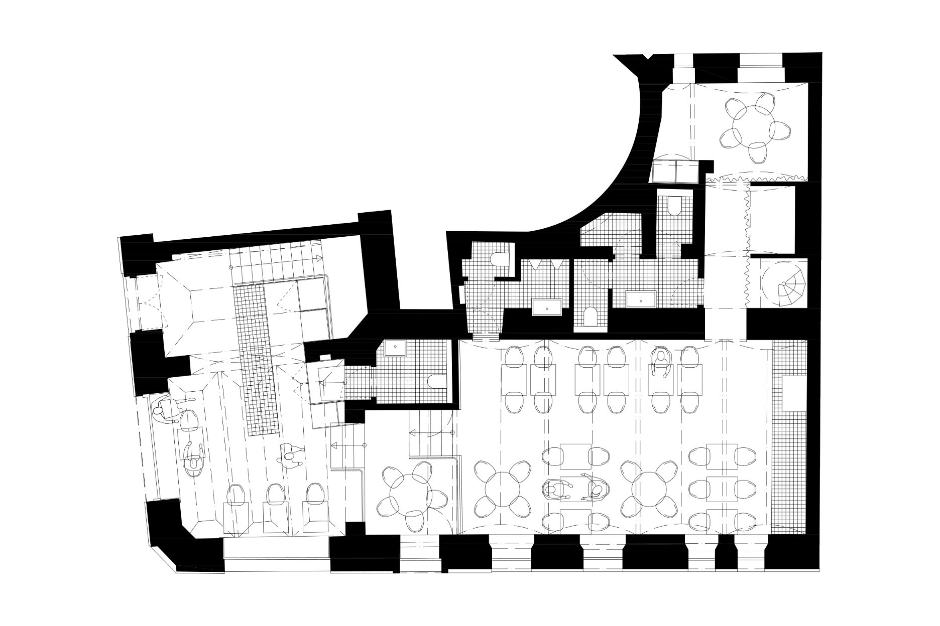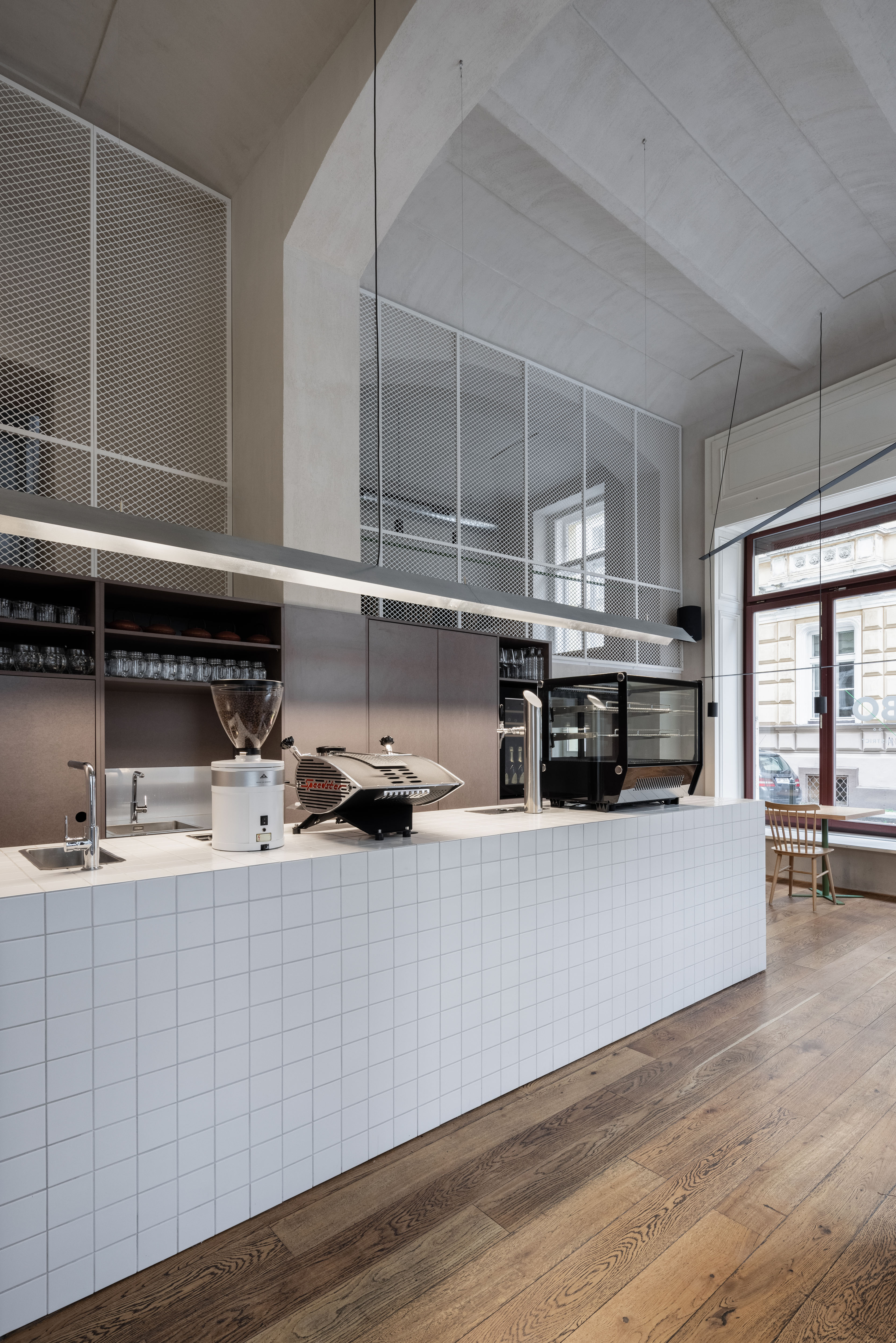 Klenutý priestor, delený na viacero výškových úrovní, je vizuálne zjednotený a doplnený o solitérne prvky. Vstup do reštauračnej časti akcentuje box zo sivej mdf dosky, ktorý zároveň vytvára kulisu pre barový pult s bielym obkladom. Tmavý stolársky prvok zakrýva nerovnosti priestoru a integruje potrebné zázemie, vrátane schodiska vedúceho do privátnejšej časti reštaurácie a kuchyne. Celú kompozíciu dopĺňa výrazné svietidlo z ohýbaného pozinkovaného plechu nad barom.