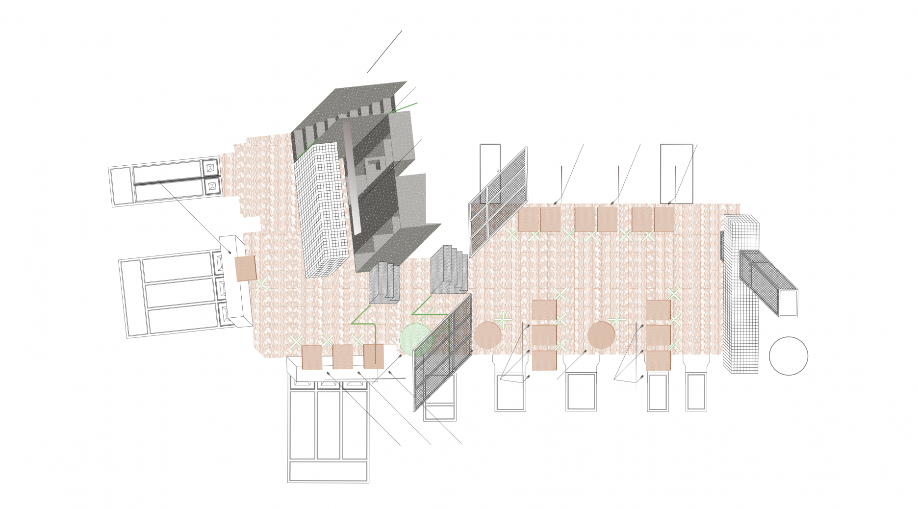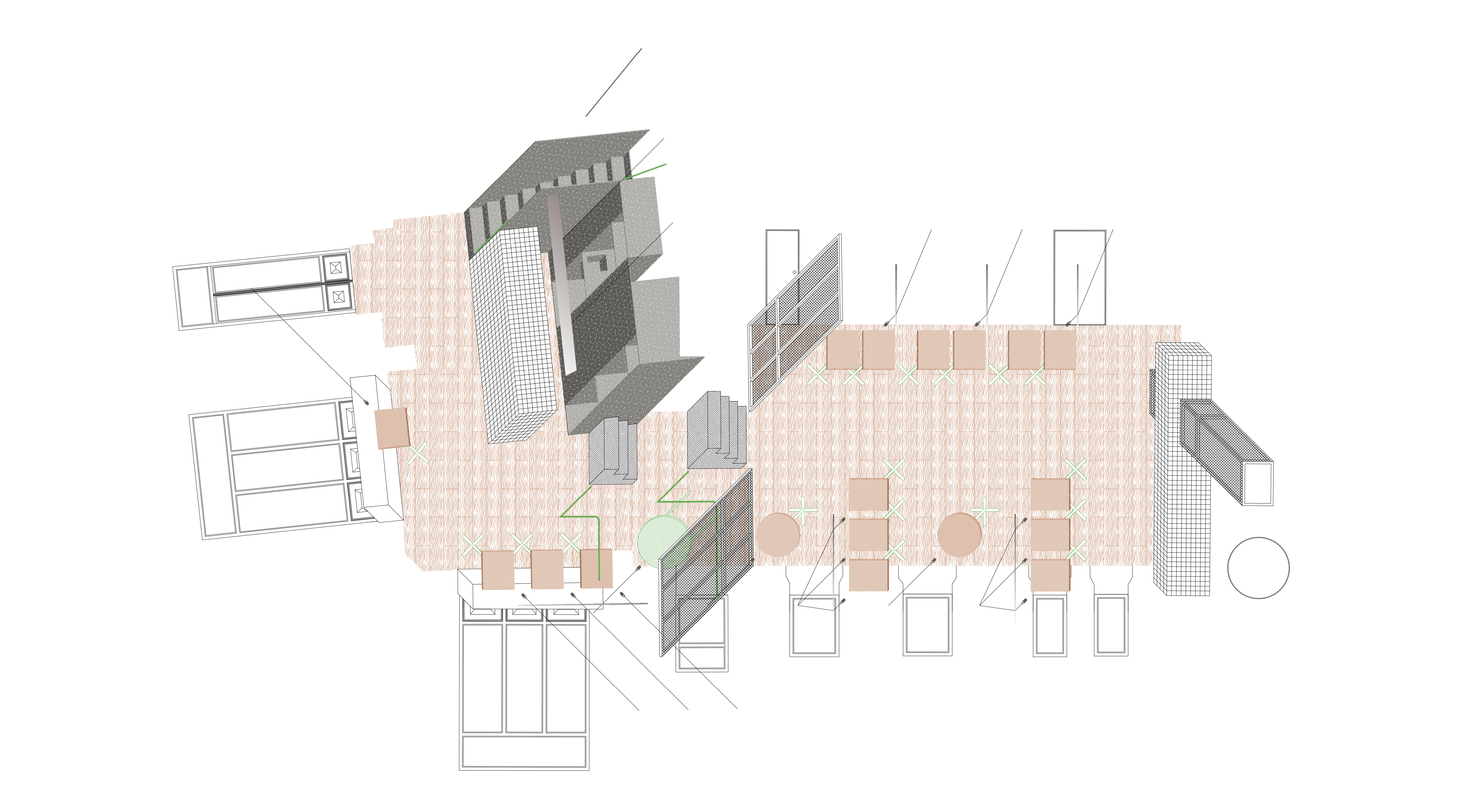 Zjednocujúcim prvkom v interiéri je opakujúca sa rámová konštrukcia z bieleho ťahokovu. "Jemná štruktúra vytvára v priestore zóny intimity, no stále zachováva transparentnosť a priehľady,” vysvetľujú svoj zámer autori. Komplementárnym detailom sú tenké zelené oceľové zábradlia.