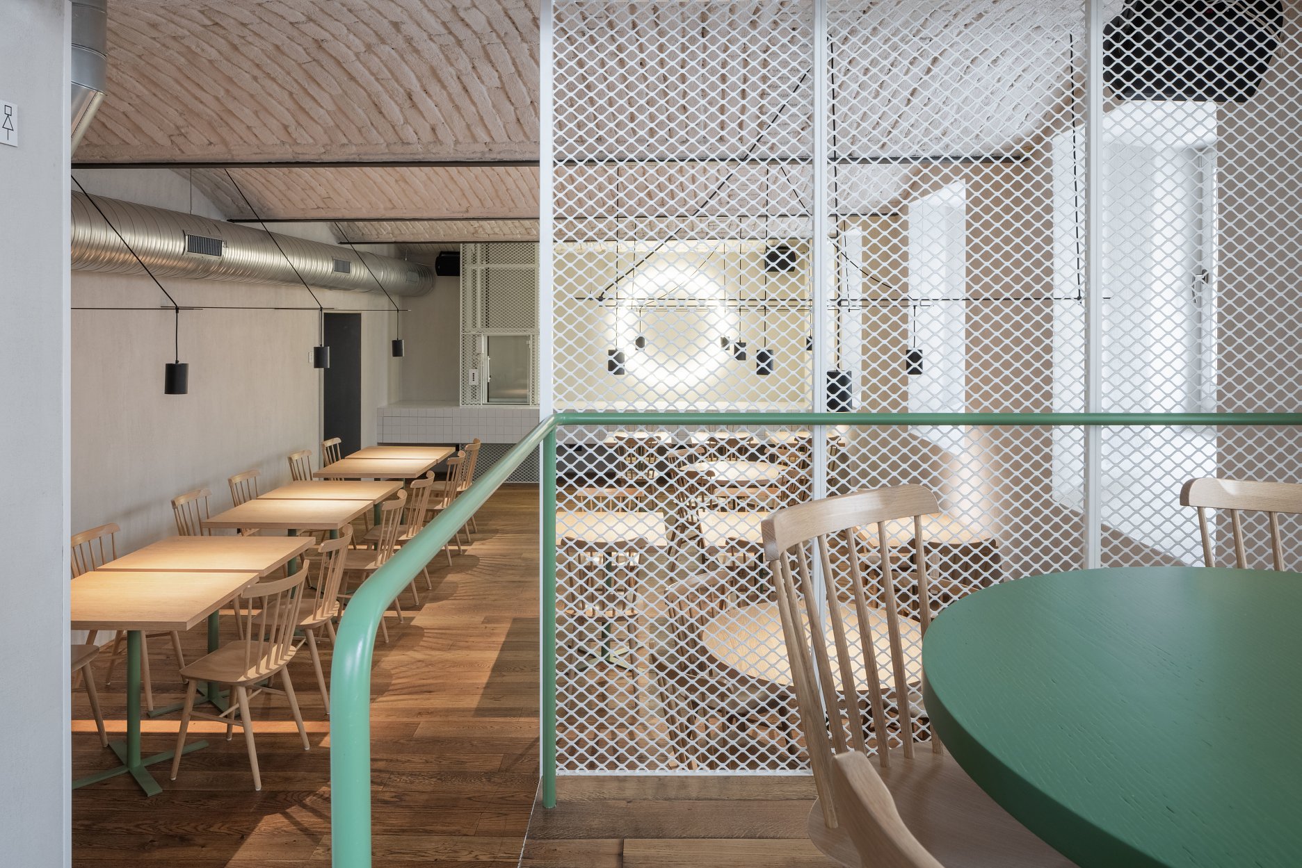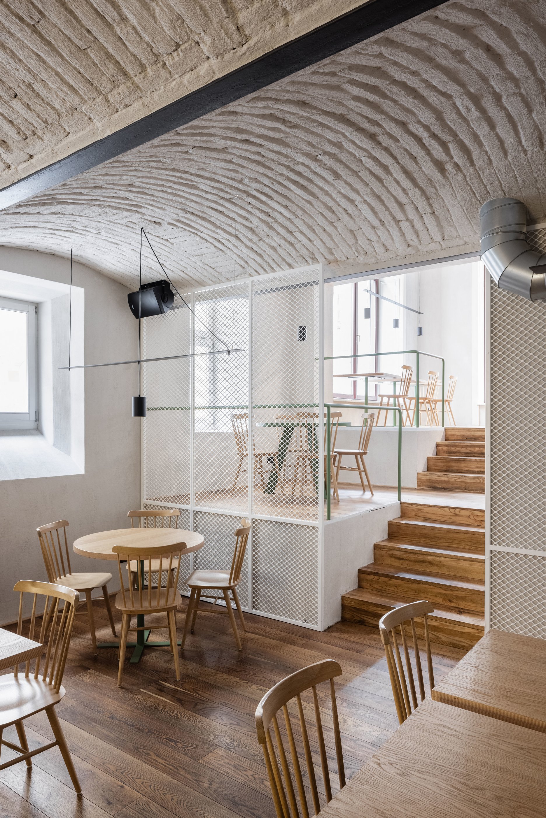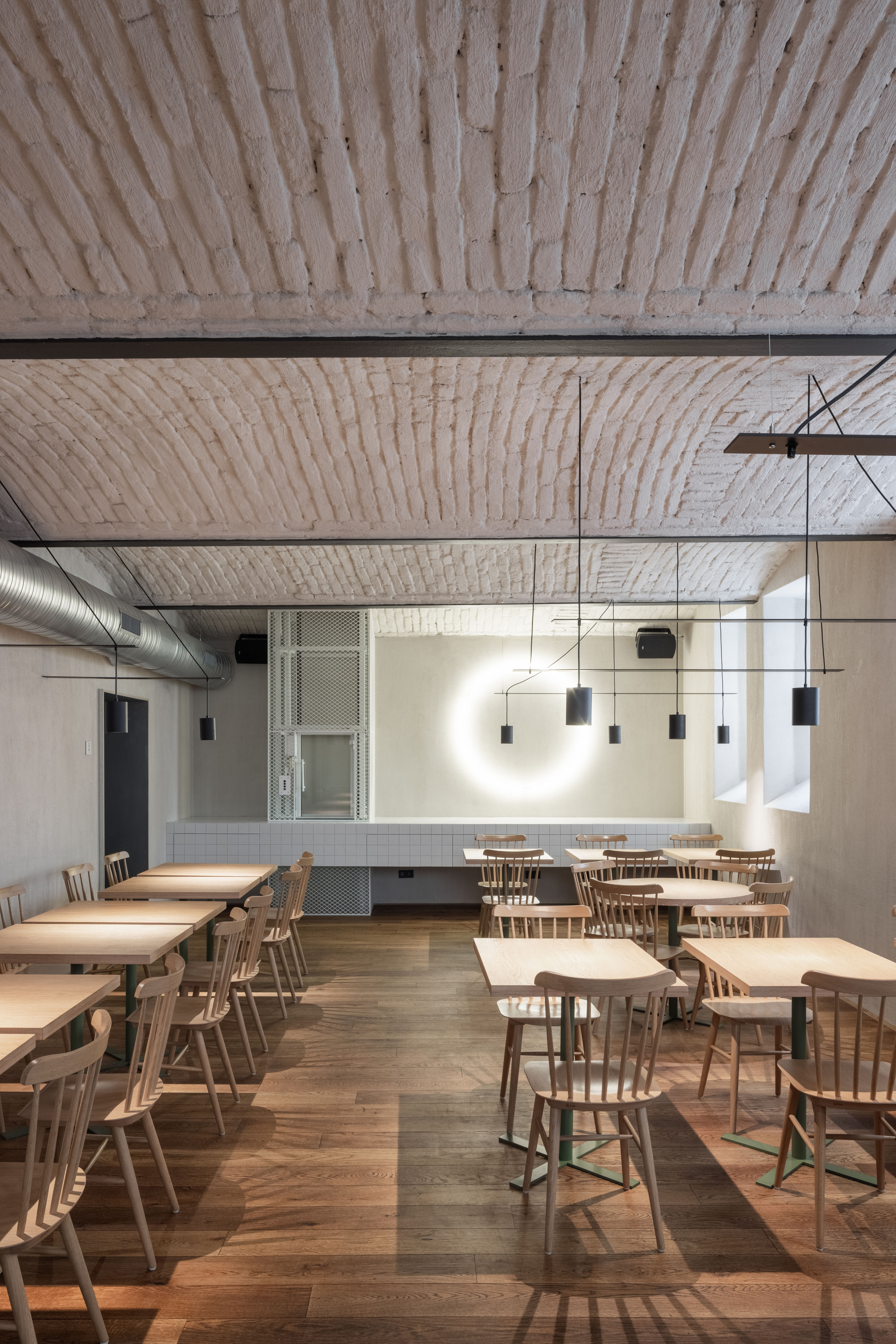 Steny a klenuté stropy zjednotila nová svetlá omietka, ktorá vnáša do interiéru jemnú textúru. Kontrastne k svetlému interiéru pôsobí tmavé zázemie s toaletami. Vložený mobiliár je jednoduchý. Stoly z bukovej preglejky, so zelenými kovovými nohami, dopĺňajú masívne dubové stoličky.