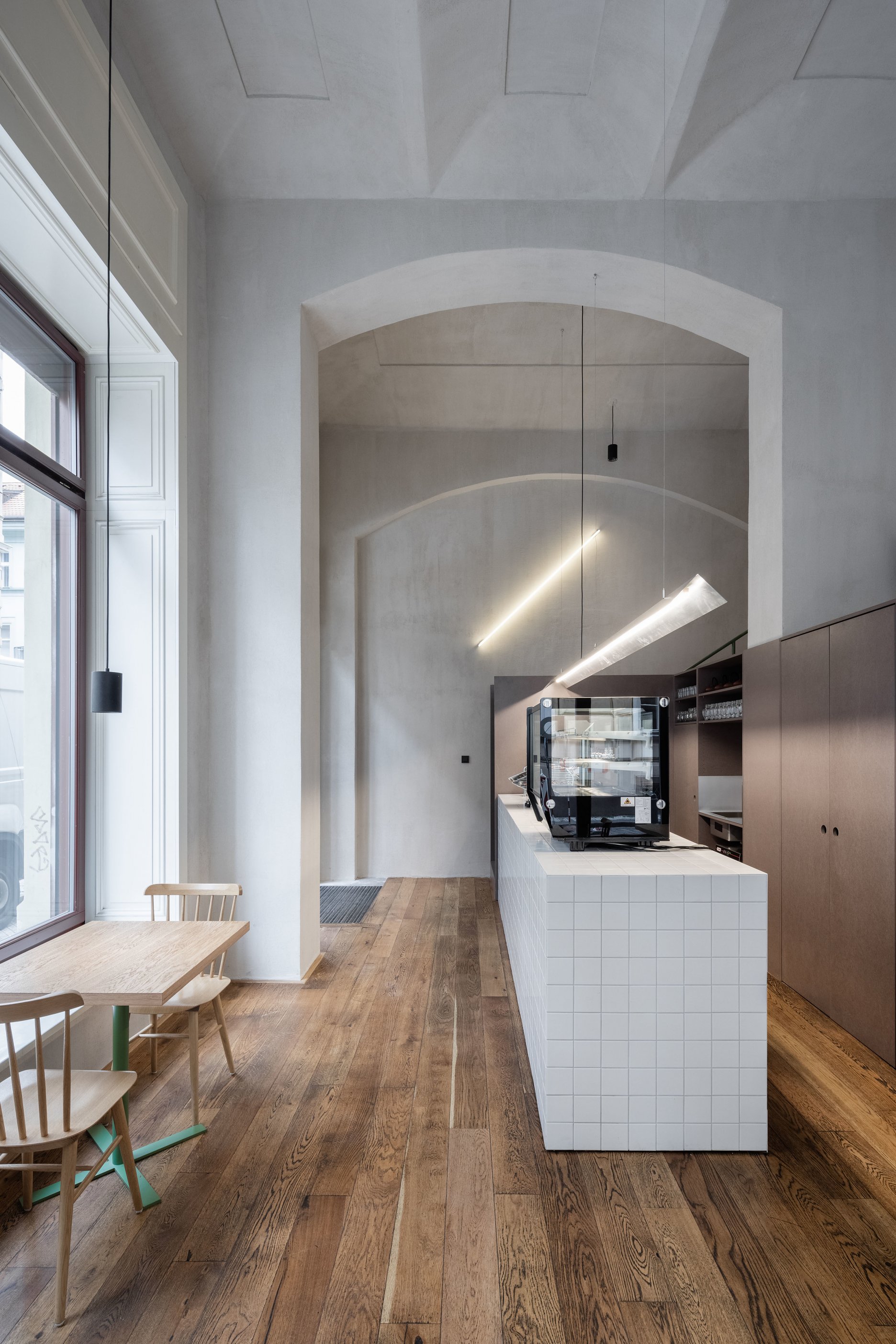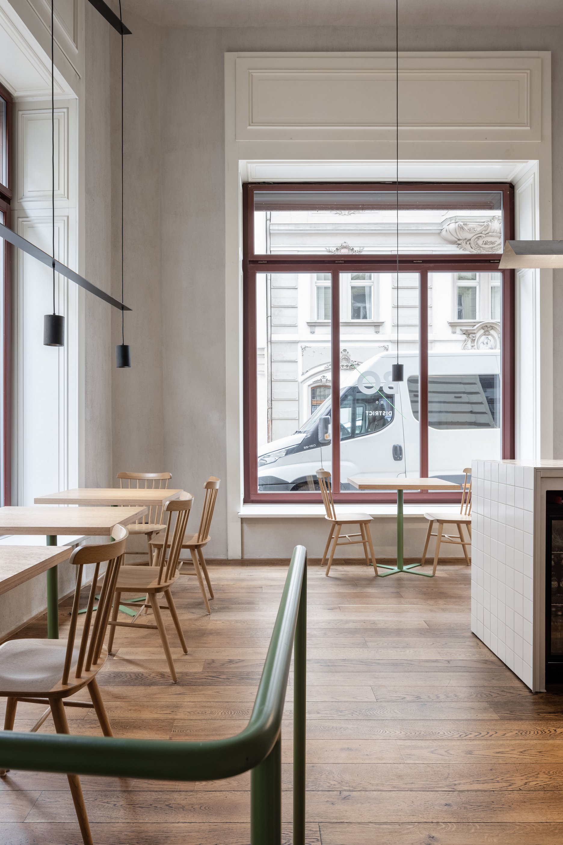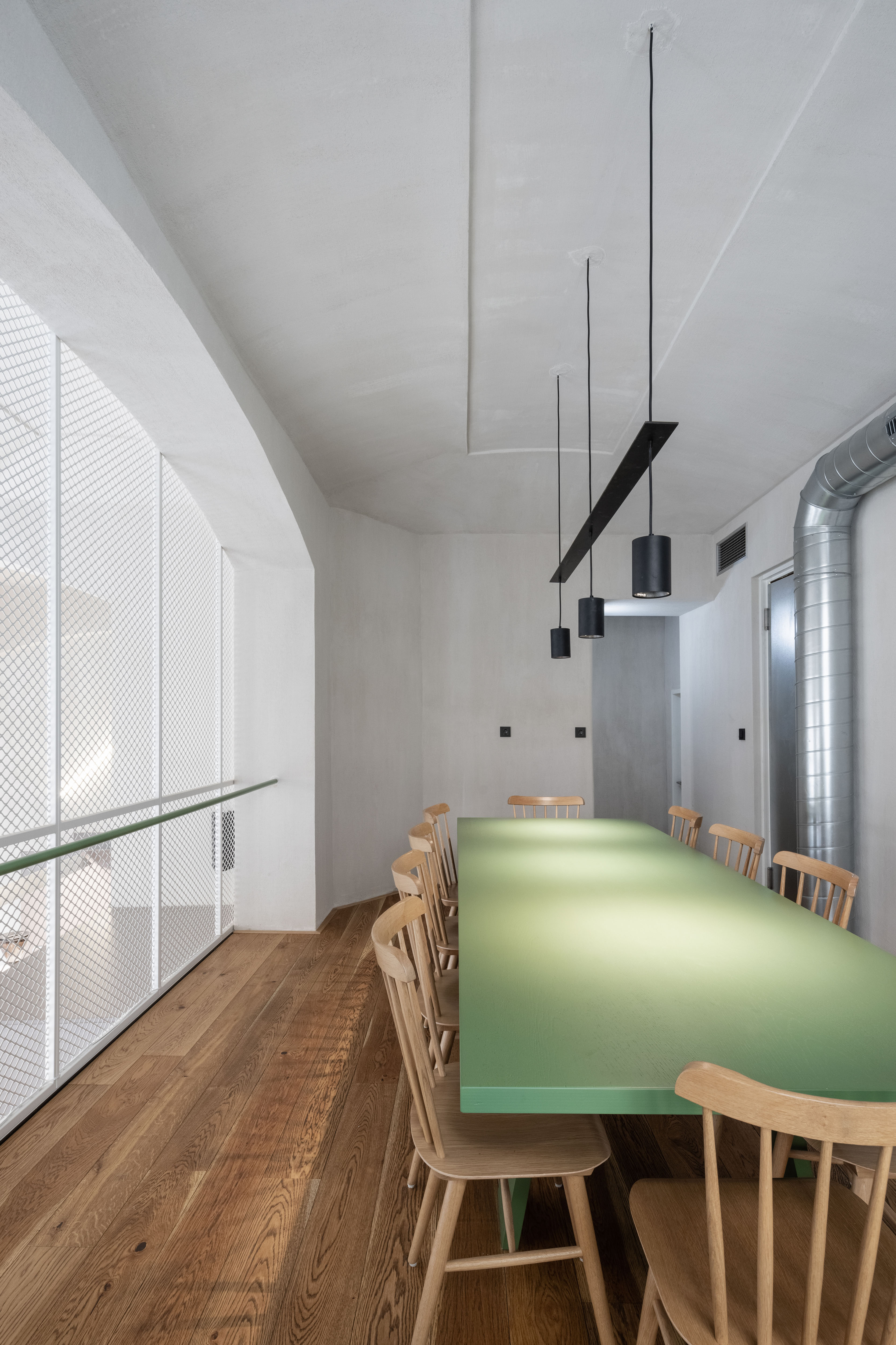 Steny a klenuté stropy zjednotila nová svetlá omietka, ktorá vnáša do interiéru jemnú textúru. Kontrastne k svetlému interiéru pôsobí tmavé zázemie s toaletami. Vložený mobiliár je jednoduchý. Stoly z bukovej preglejky, so zelenými kovovými nohami, dopĺňajú masívne dubové stoličky.