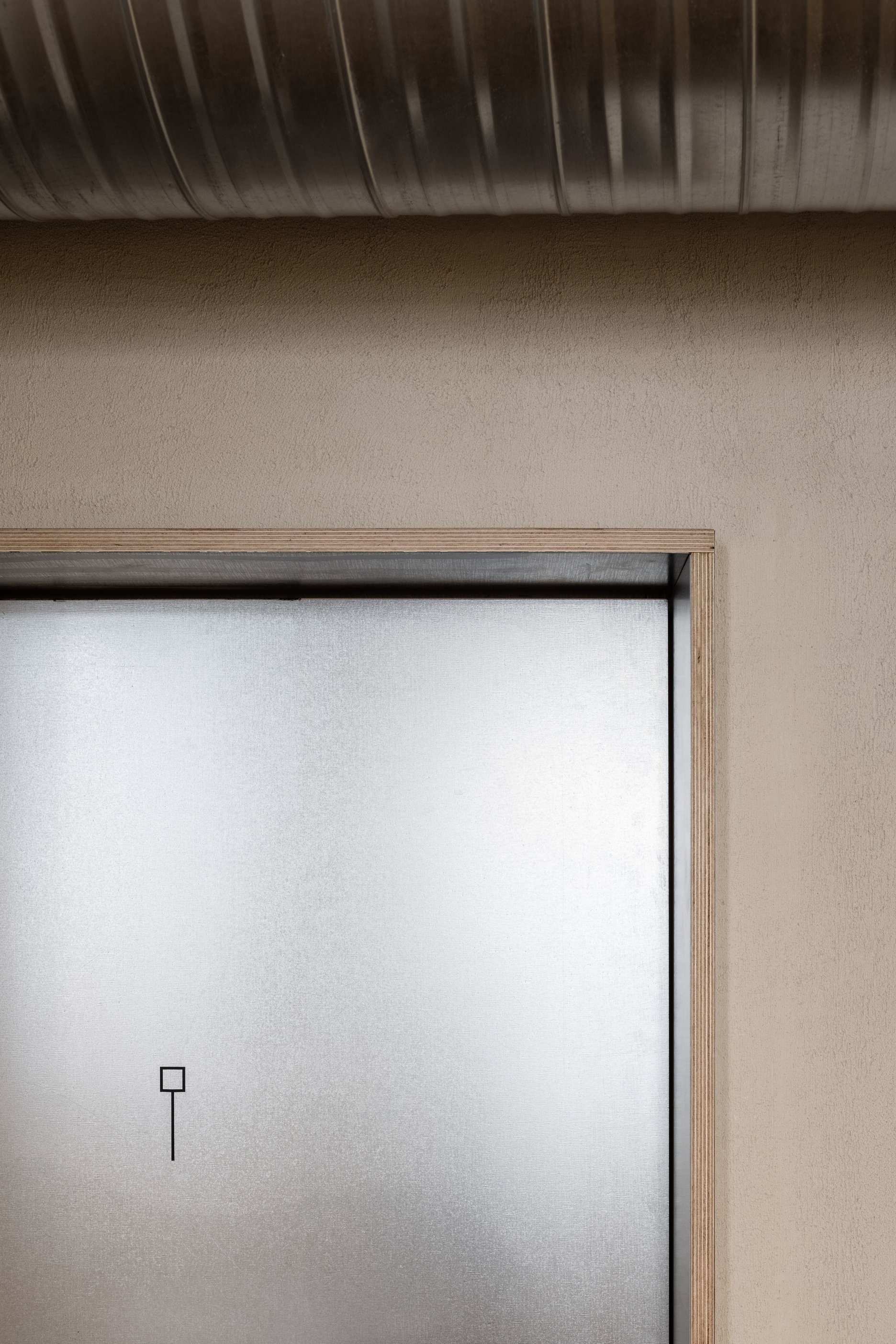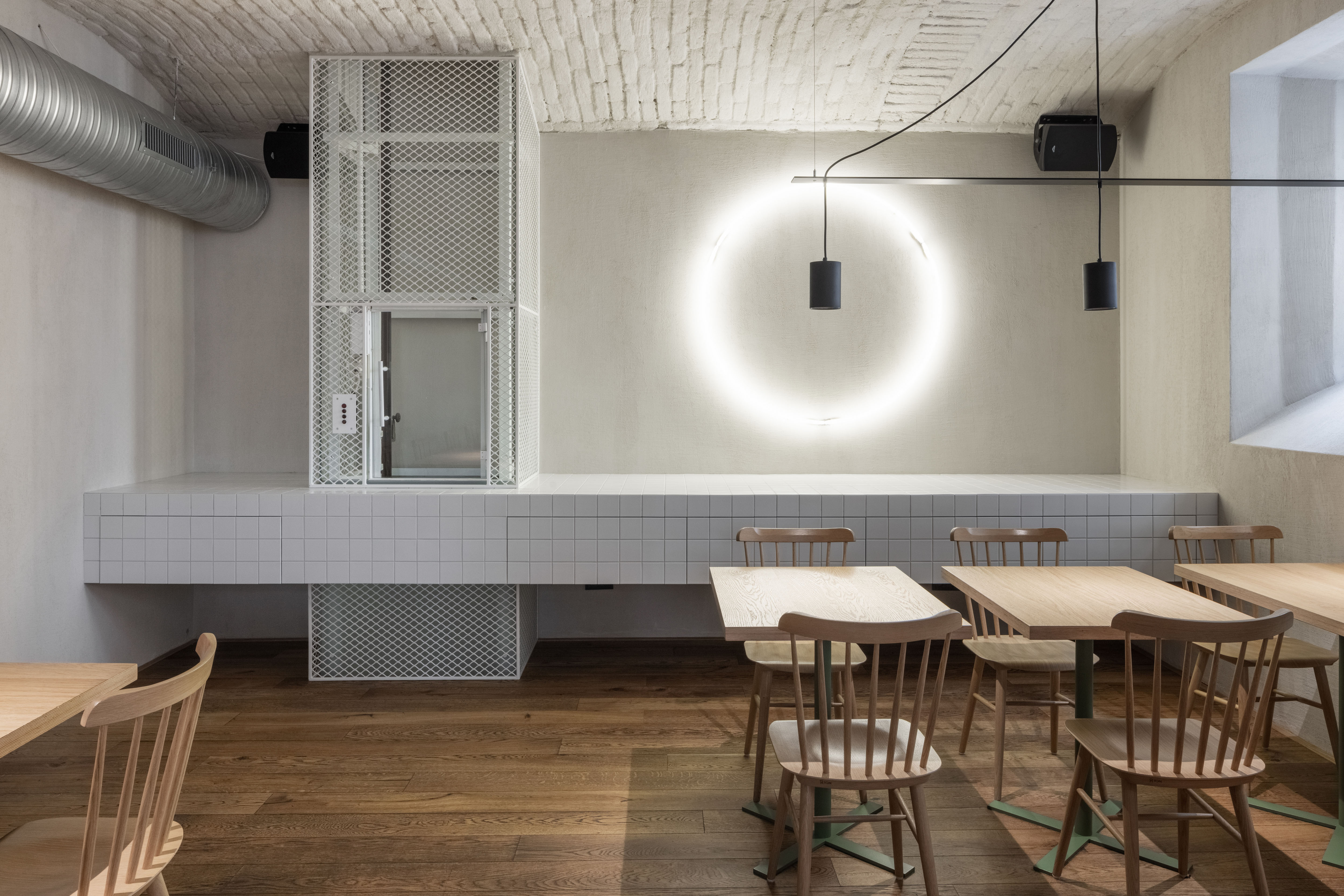 V spodnej časti bistra architekti zachovali pôvodný gastro výťah, ktorý zároveň obalili do zhodného bieleho ťahokovu. Na výťah nadväzuje sekundárny pult s bielym obkladom.