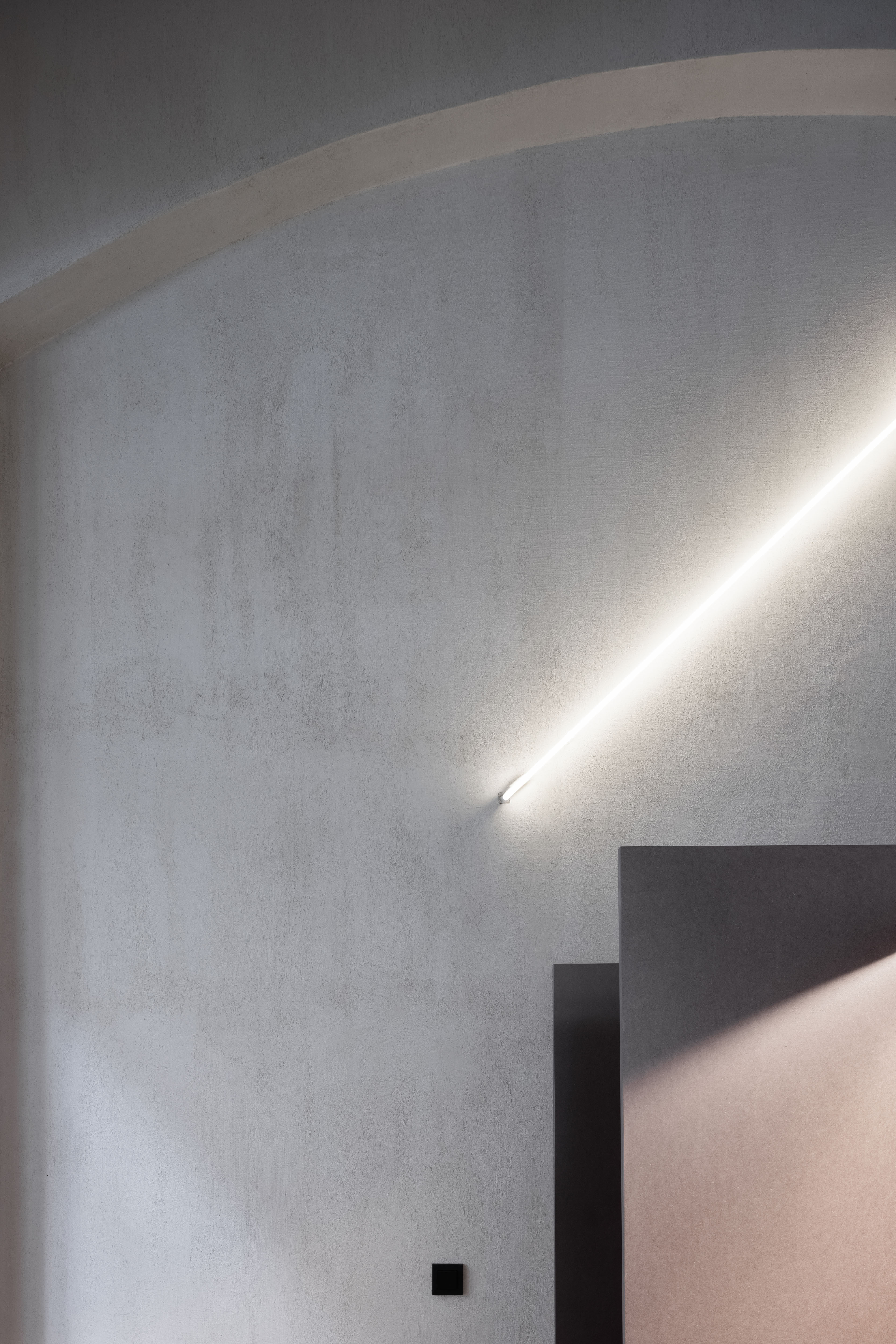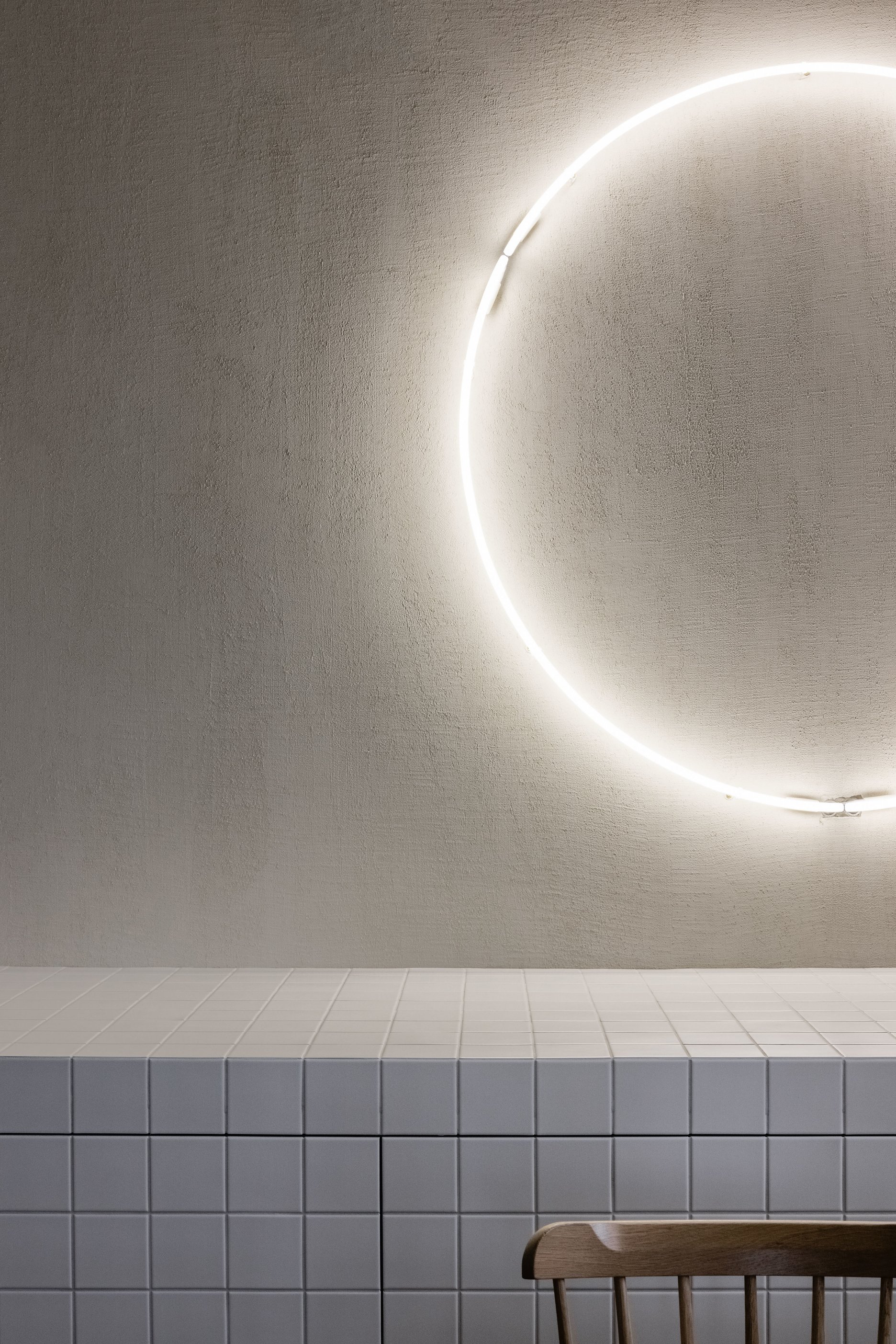 Neoddeliteľnú súčasť architektonického riešenia tvorí osvetlenie. Bodové svetlá, nasmerované na stoly, spája oceľová pásovina do priestorových prvkov. Dopĺňa ich dvojica neónov - línia a kruh, ktoré dotvárajú vizuálnu identitu priestoru. Svetlá sa stávajú dôležitou ingredienciou dokresľujúcou atmosféru reštaurácie a scénu pre stolovanie.