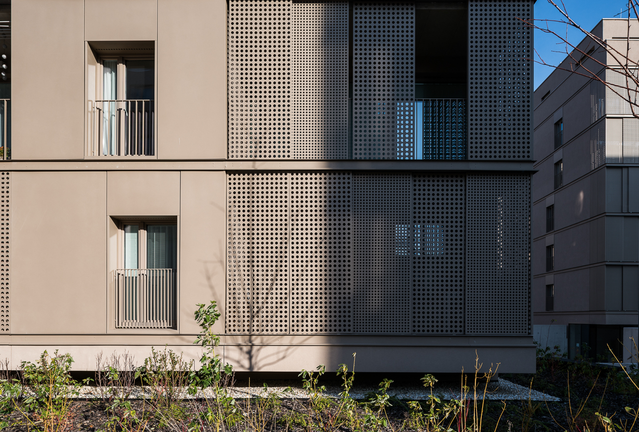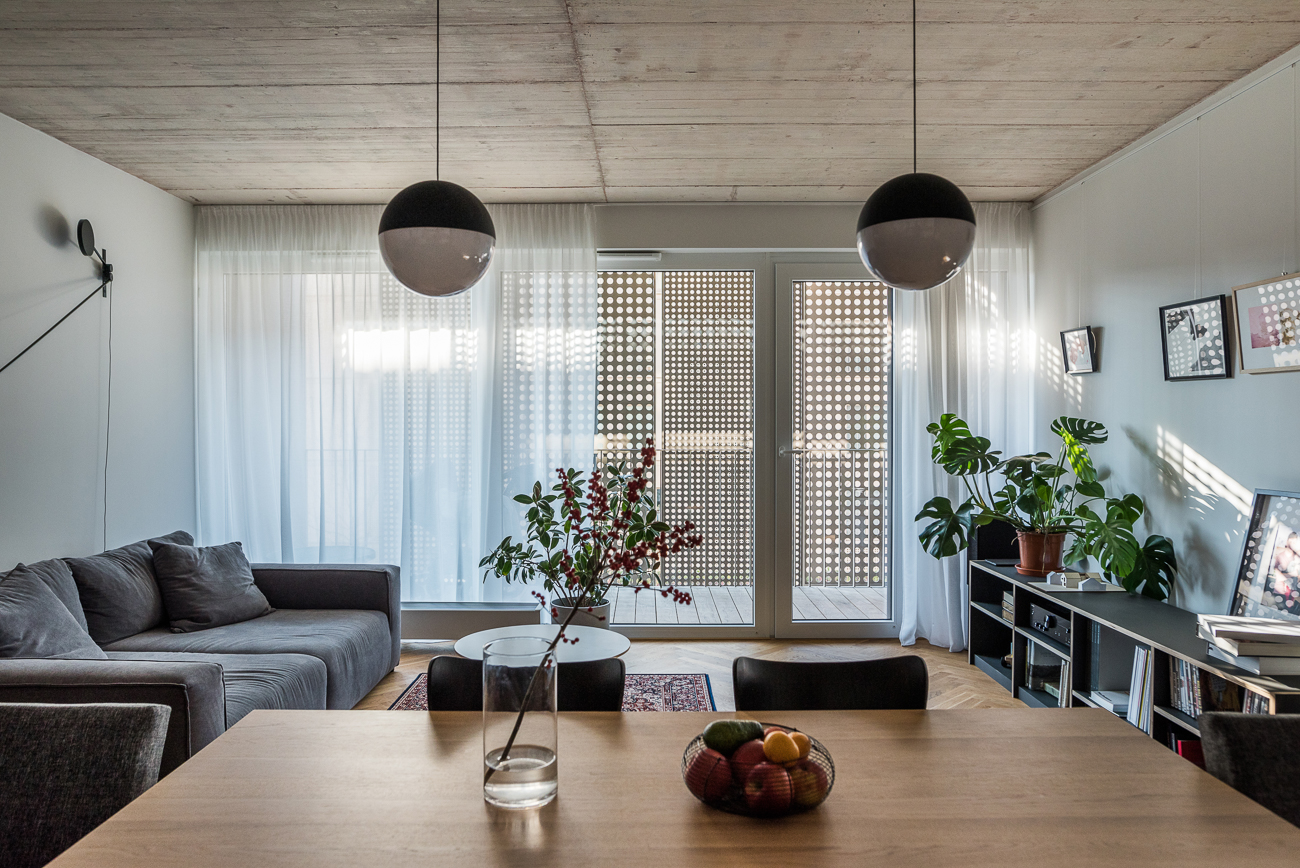 Racionalita urbanistického riešenia prechádza aj do architektúry. Jednoduché monochromatické plochy fasád sú plasticky členené systémom posuvného tienenia, ktorý vnáša do interiéru bytov zaujímavú premennú. Konštrukčný systém stavby a monolitické stropy sa takisto prepísali do výslednej podoby bytu. Architekt sa rozhodol v hlavnom obytnom priestore pre odhalenie prirodzenej textúry materiálu.