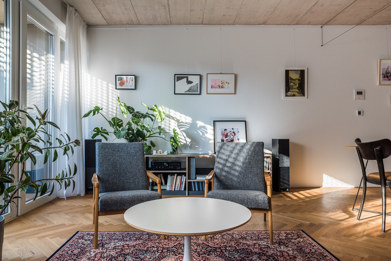 Byt je rozdelený na tri logické funkčné zóny - centrálnu časť s obslužným charakterom, kde je chodba, kúpeľňa, toaleta a úložné priestory vo forme vloženého dreveného boxu; ďalej na dennú časť s obývačkou, kuchyňou a lodžiou a nočnú časť so spálňou a detskou izbou. Materiály stropov a podláh v byte, ich farebnosť a štruktúra, toto „prirodzené“ členenie bytu nasledujú a vizuálne podporujú. V dennej časti sú použité „surové“ povrchy - masívne drevo s výraznou kresbou a odhalený betónový strop. V obslužnej zóne je to vizuálne jemnejšia liata epoxid-cementová podlaha a betónový strop natretý na čierno. Najuhladenejšie sú izby, kde sú použité vlnené koberce a omietnuté biele stropy. Charakter podláh a stropov sa mení podľa zóny, pričom rovnaký materiál stien tieto zóny vizuálne prepája. Tam, kde si to prevádzka žiada (kuchyňa, kúpeľňa) je povrch stien ukončený matným bielym (v kúpeľni sivým) polyuretánovým náterom; dvere sú biele, osadené do skrytej zárubne.