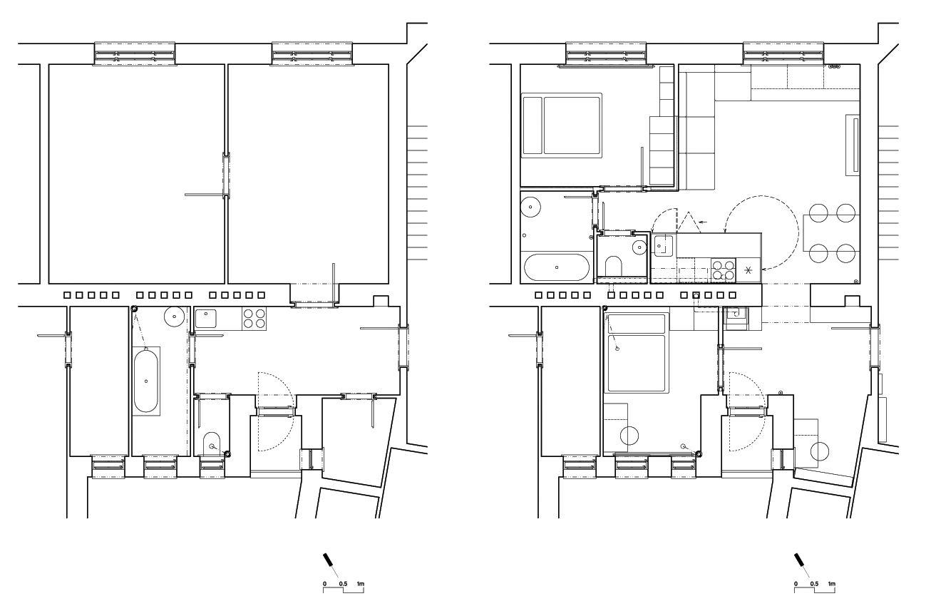V novej dispozícii bola vstupná časť otvorená, zrušená komora vstup prevzdušnila, miesto polovičnej kuchyne sú v hale plnohodnotné úložné priestory. Tam kde bolo wc a kúpelňa sme pekne vpratali druhú izbu. Odstránením deliacej priečky bývalého obytného priestoru sa dispozícia otvorila a my sme ju mohli nastaviť nanovo. Otvorený obývací priestor je priestranný, spojený s jedálenským kútom a uzatvárateľným objektom kuchyne. Bývalá obrovská spálňa bola zmenšená a pekne sa tam zmestilo samostatné wc a komfortná kúpelňa. Mission accomplished. Z dvoj izbového bol troj.