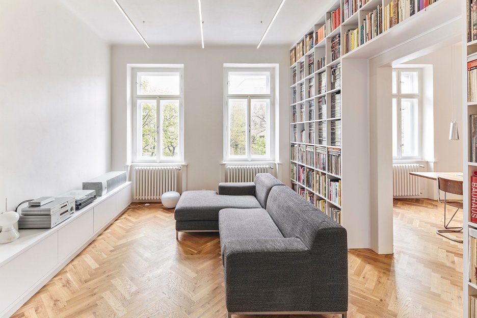 Obytný priestor a kuchyňa smerujú do ulice, k priľahlému parku. Spálňa rodičov a detská izba sú situované v “kľudnej” časti bytu orientovanej do vnútrobloku. Obývacia izba je oddelená od kuchyne priečkou s pôvodnými obložkami. Celú stenu lemuje rozsiahla knižnica. Pozdĺž protiľahlej steny je umiestnená komoda, ktorá slúži ako úložný priestor a zároveň ako “sokel” pre menšie sochy a umelecké predmety. Zo sedačky je možné sledovať projekciu premietanú na bielu stenu. Osvetlenie miestnosti zabezpečujú tri línie LED svetiel.