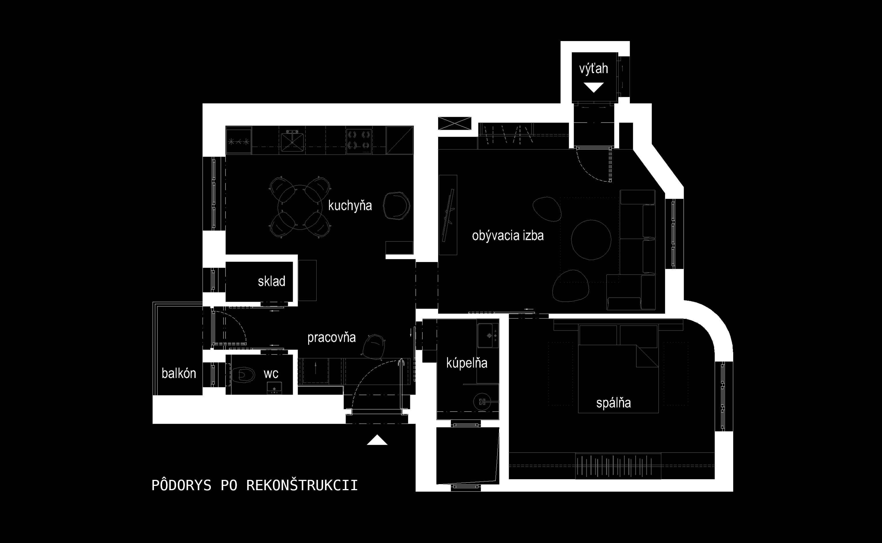 Priestranný interiér s podlažnou plochou 70 m2 a netradičnou dispozíciou sa nachádza v lukratívnom historickom centre Bratislavy. S ohľadom na účel využitia, keďže byt je určený na prenájom, bola od začiatku kladená požiadavka hlavne na funkčnosť a jednoduchosť priestoru ako aj jednotlivých nábytkov.