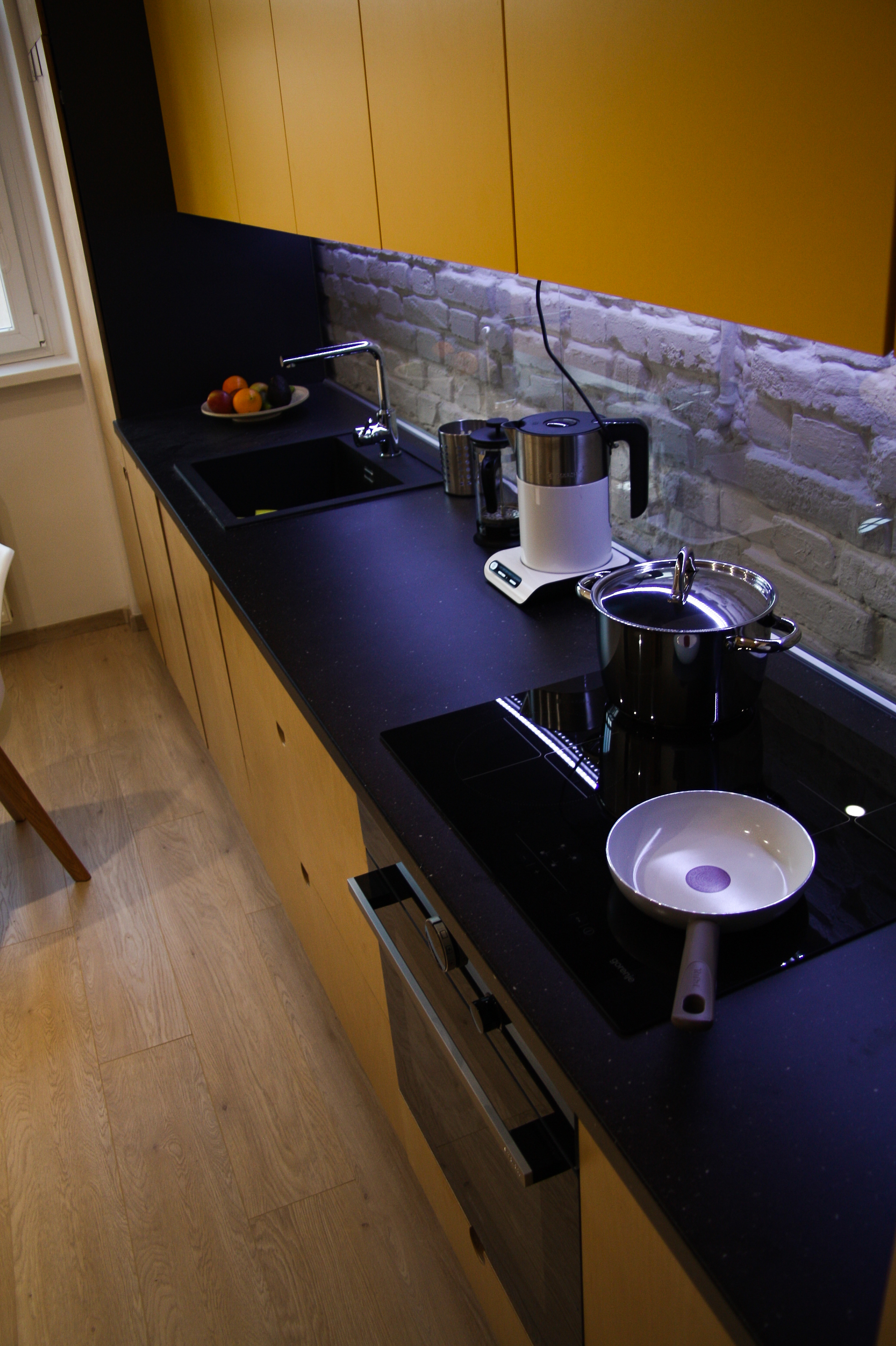 V materiálovom riešení prevláda stolárska preglejka, doplnená čiernou tabuľovou farbou, autentickou tehlovou stenou a ako akcent žltá laminovaná doska. V kuchyni sme tiež priznali pôvodnú tehlovú stenu a povýšili ju na nasvietenú industriálnu prezentáciu za čírym sklom.