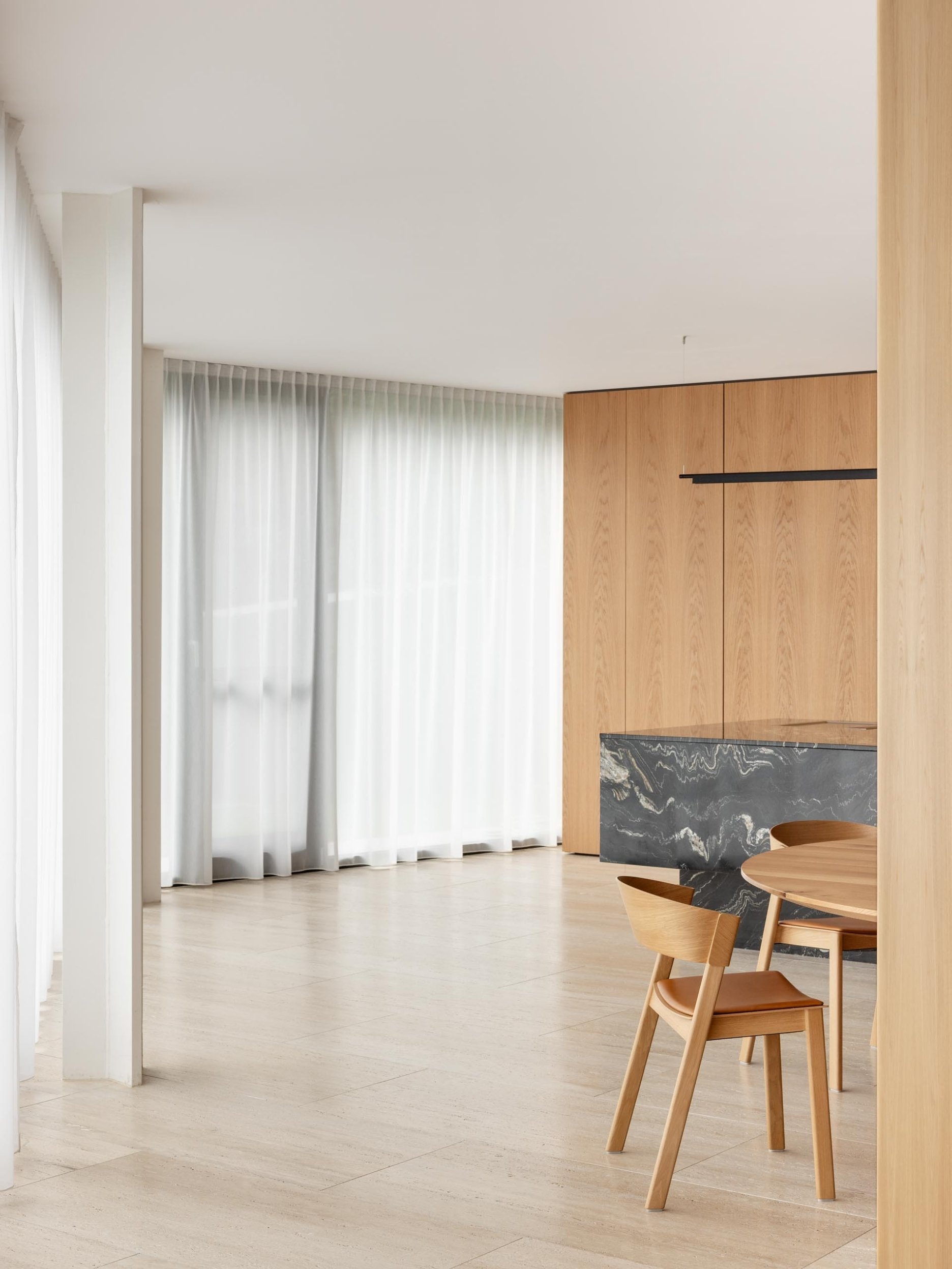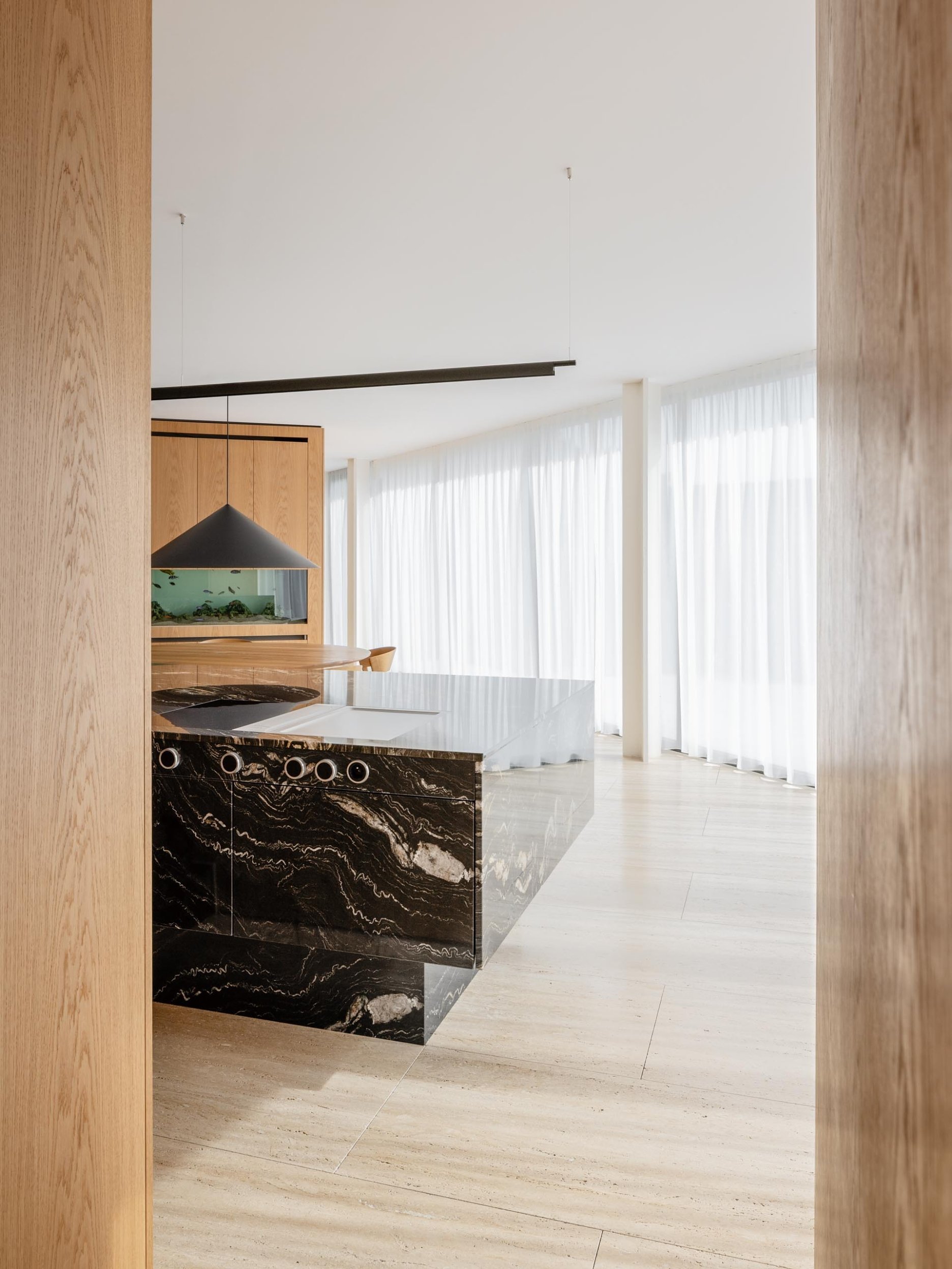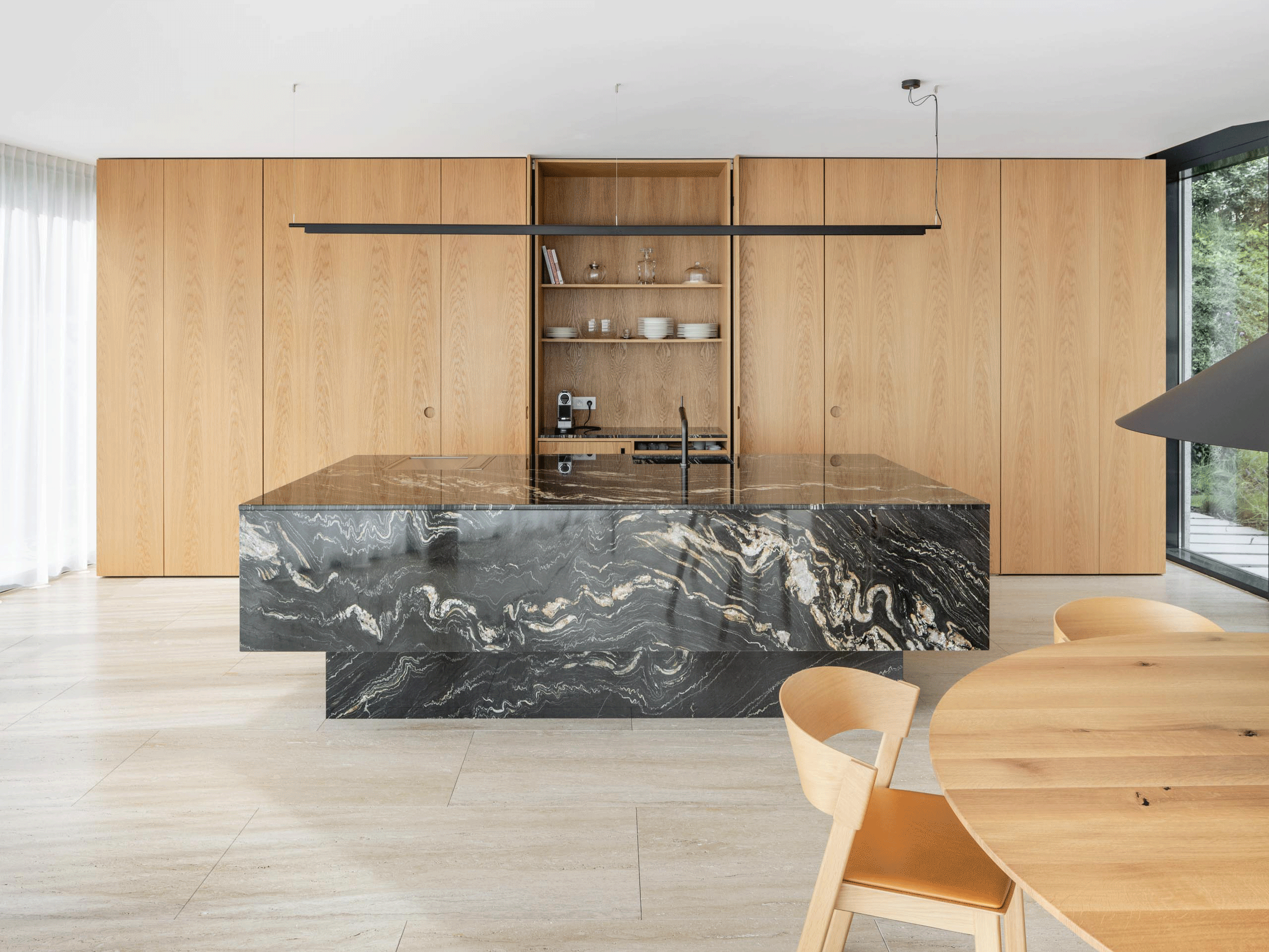 Riešenie nadväzuje na pôvodný priestorový koncept, ktorého vzťah s exteriérom posilňujú logické úpravy terénu a exteriéru. Architekti pracujú s nábytkovým delením otvoreného priestoru, precízne zhotoveného na mieru realizácie a solídnou materialitou s rozsiahlym využitím prírodného kameňa a masívneho dreva.