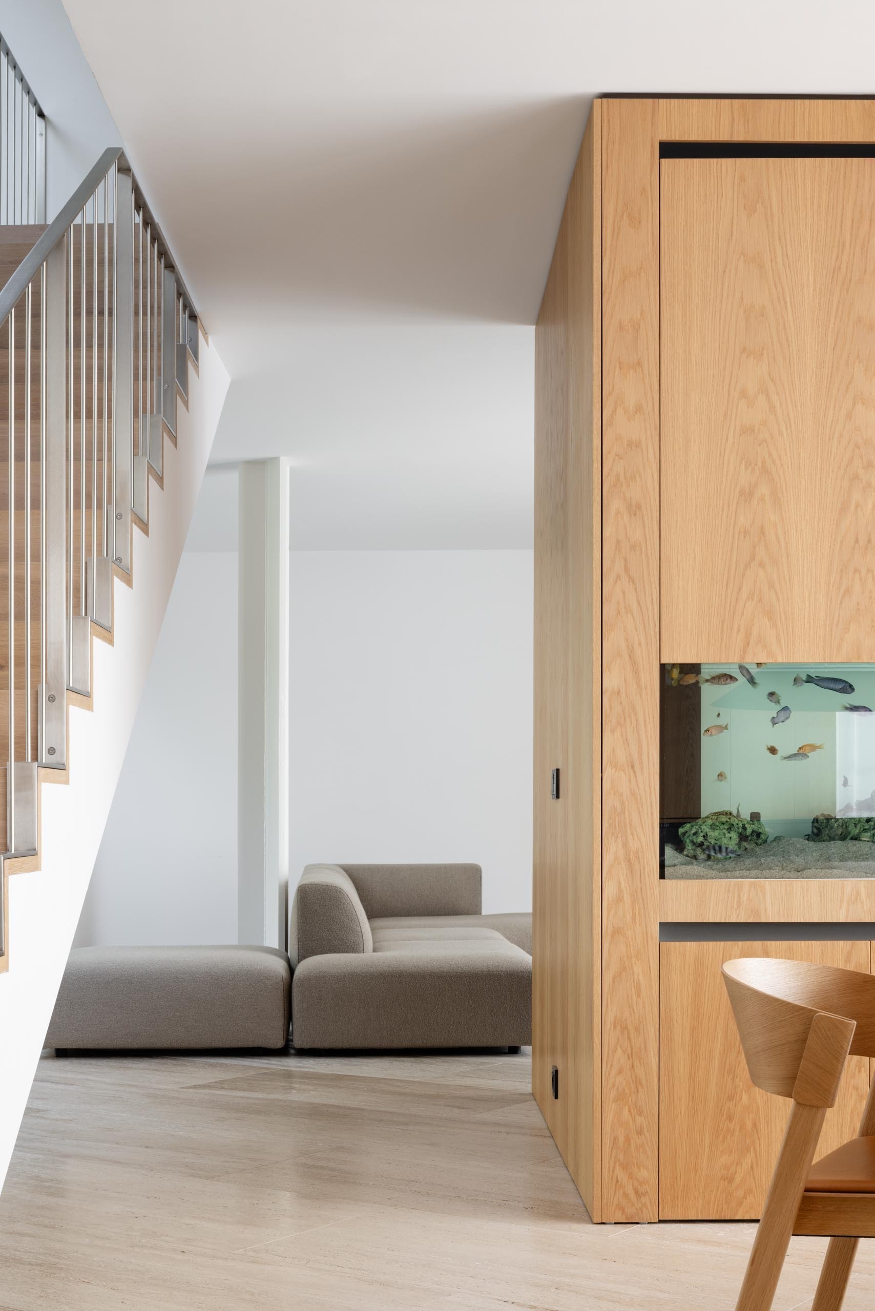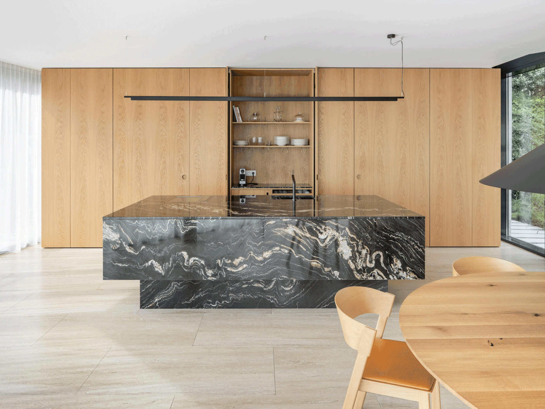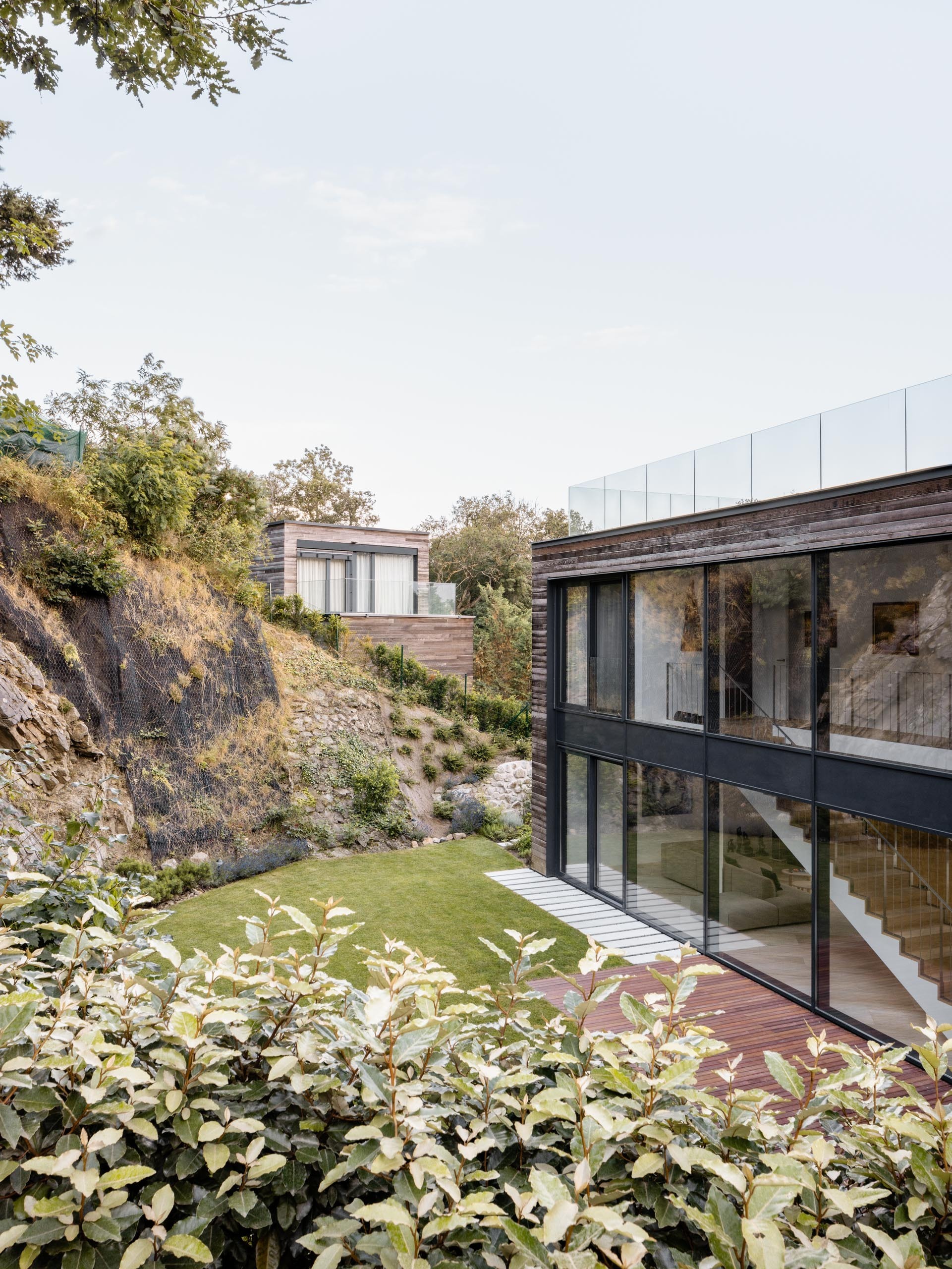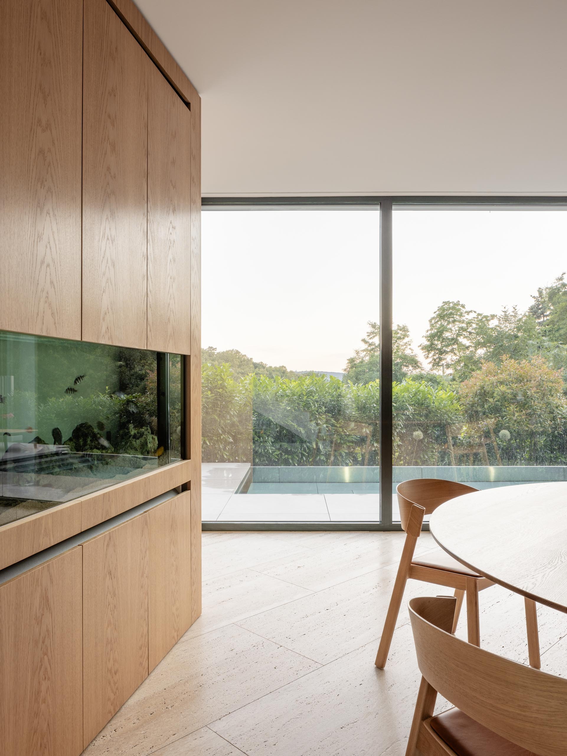 Na prízemí pracujeme s otvoreným priestorom hlavnej dennej časti, do ktorého sú vložené nábytkové komponenty v dubovej dyhe. Vďaka nim sa priestor zjednocuje a ukľudňuje. Priestor obývacej izby s presklenými stenami pocitovo prepájame s oboma záhradami. Každá má svoju charakteristickú atmosféru, záhrada za domom je intímna, vďaka skalnému masívu sa priestor uzatvára. Záhrada pred domom sa otvára do okolia a sprostredkováva výhľady do okolitého prostredia. Je tu situovaný aj spomínaný bazén.