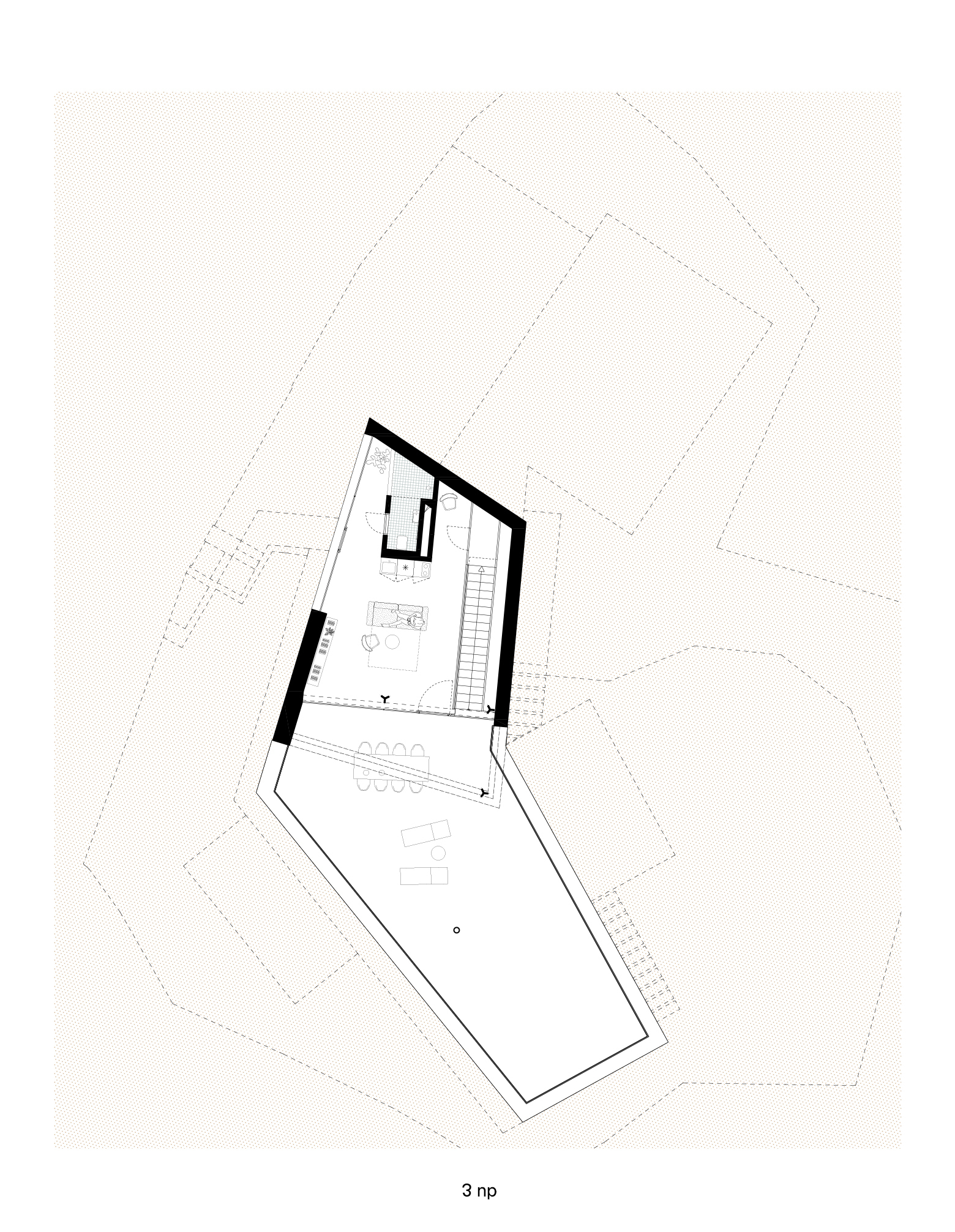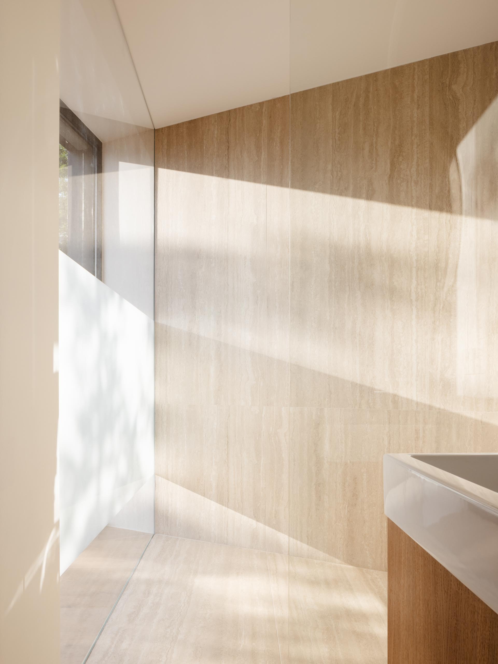 Tretie podlažie tvorí samostatnú funkčnú jednotku pre hostí. Novovytvorené kúpeľňa spolu s kuchynkou zároveň dotvára malé zázemie aj pre strešnú terasu. Pracujeme s malou paletou materiálov, ktoré sú trvácne a nadčasové. Kamenná podlaha z travertínu zjednocuje celú vstupnú úroveň.