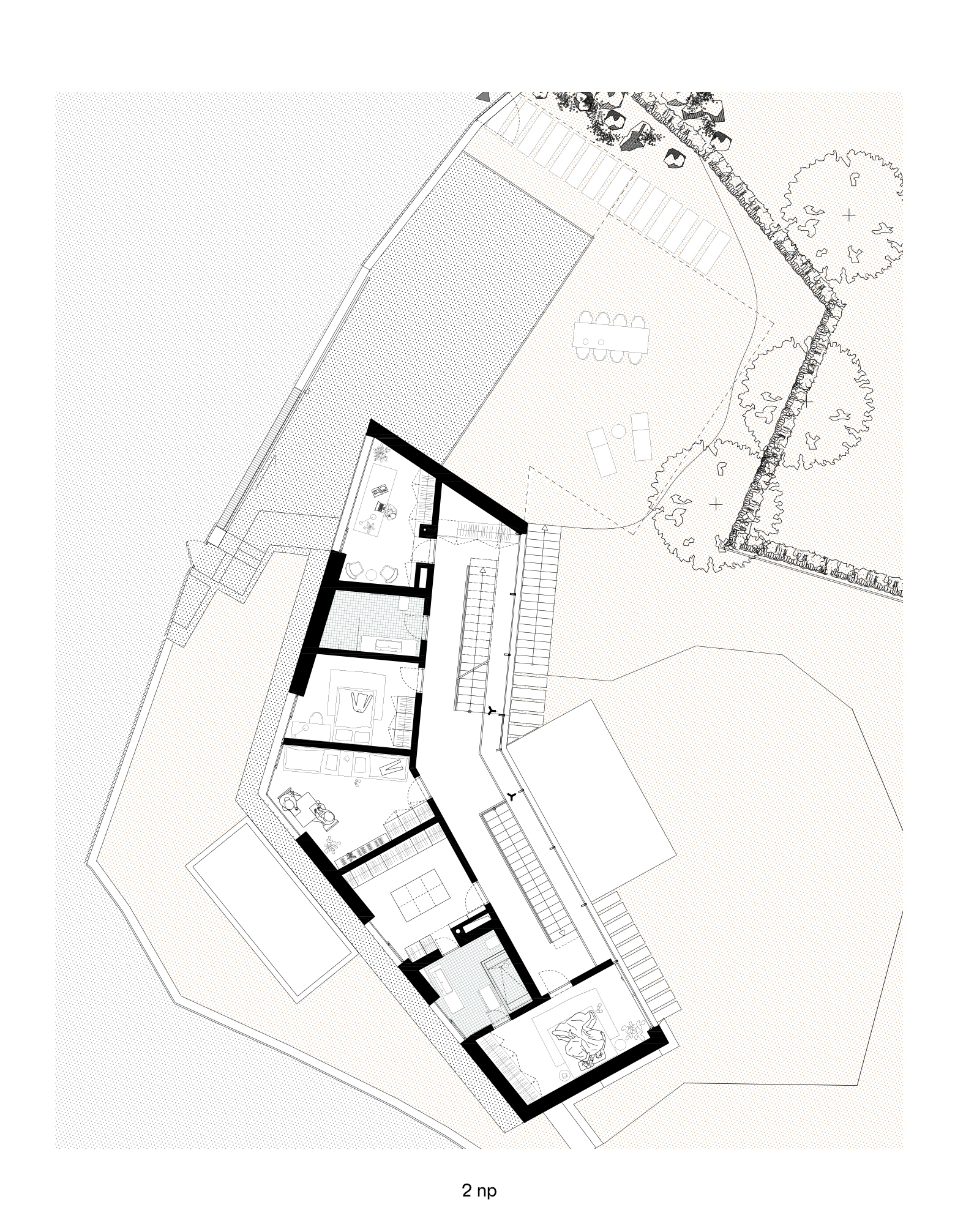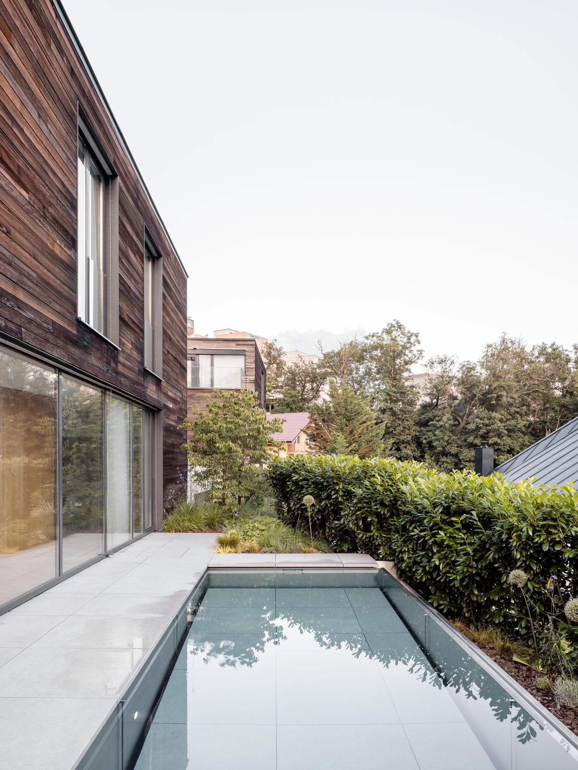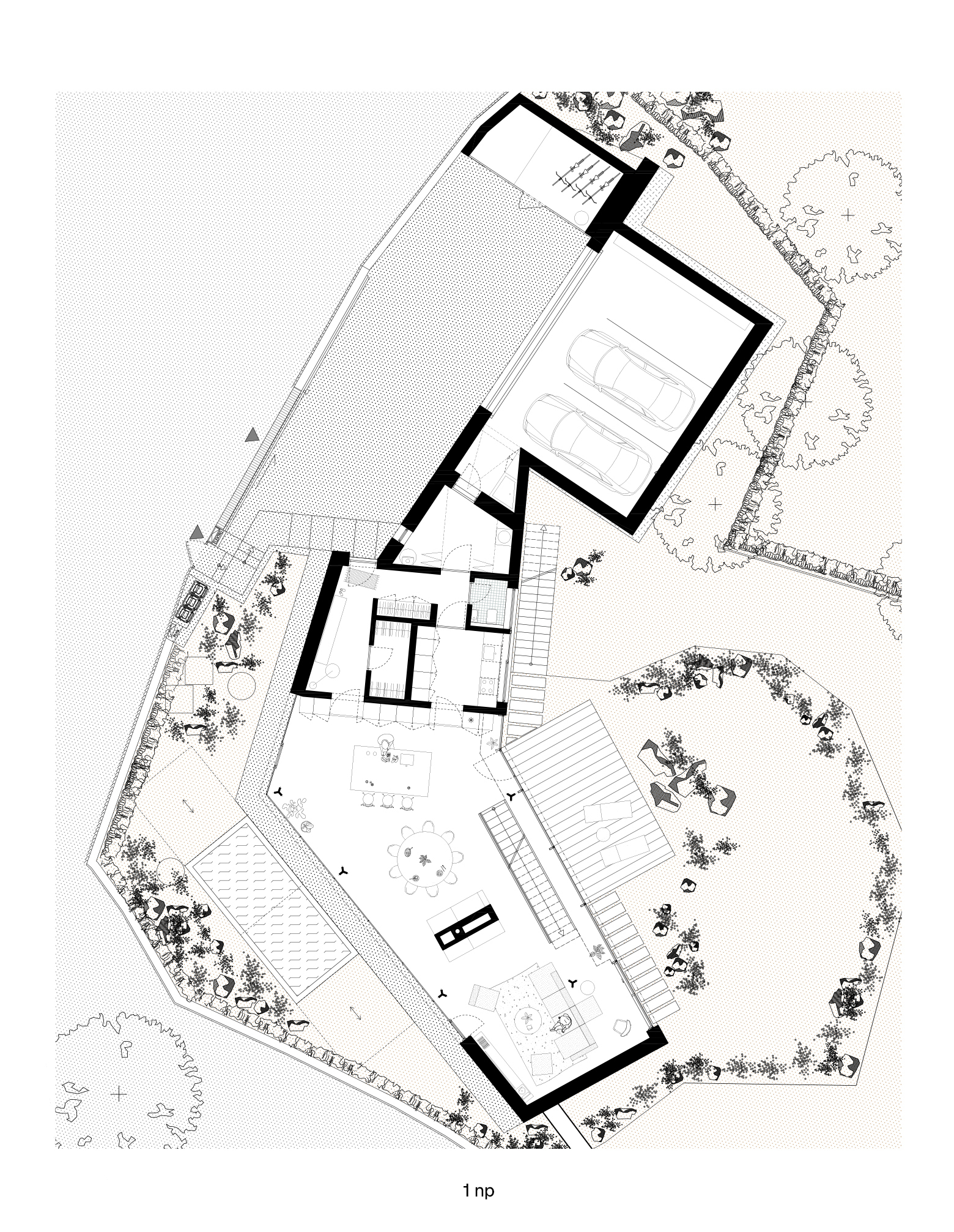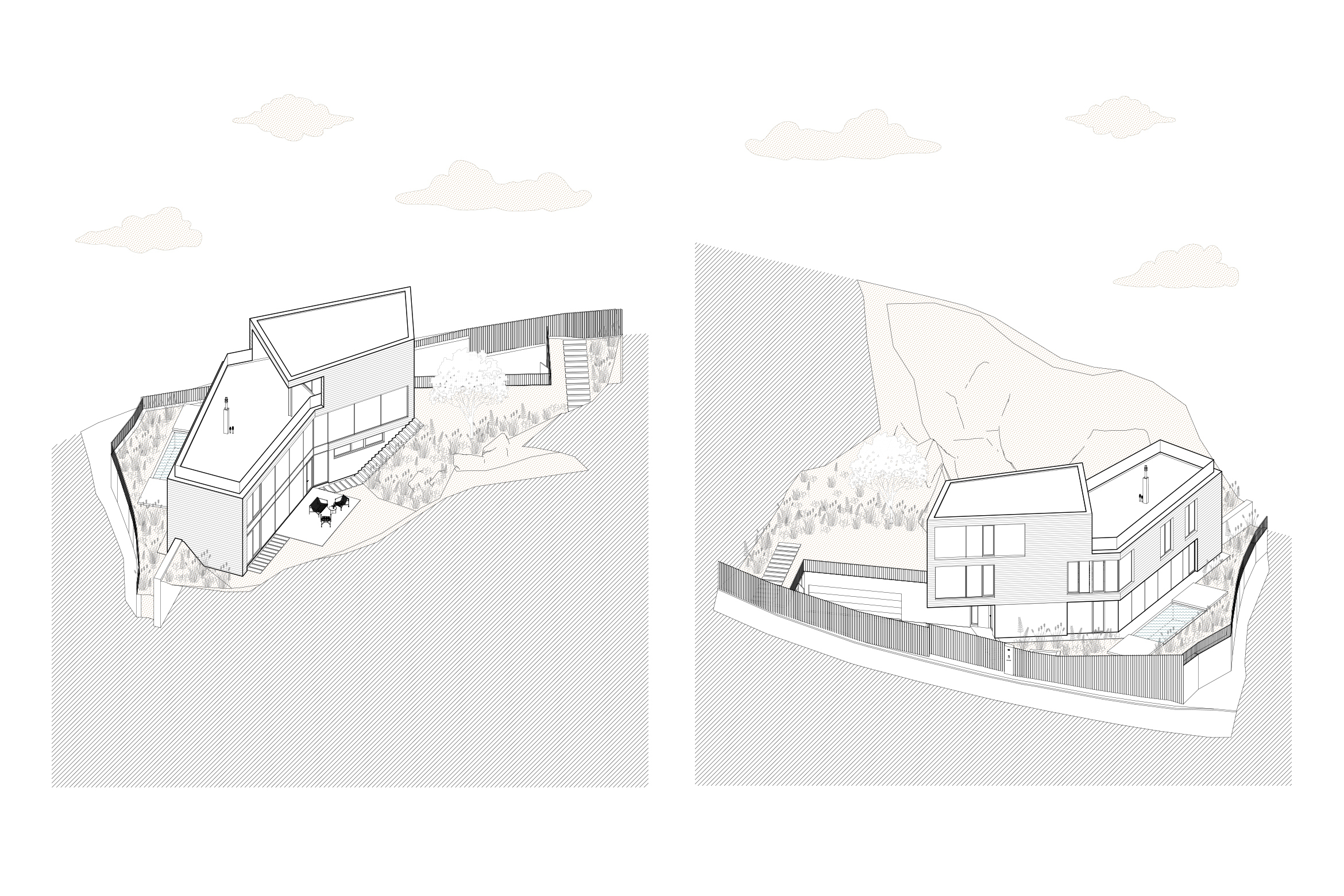 K úpravám samotného vila domu sme pristupovali citlivo, nakoľko pôvodná priestorová schéma bola veľmi logická. Využiteľné exteriérové plochy okolo domu však kvôli morfológií územia absentovali, preto sme pracovali s vyrovnaním terénu na juhozápadnej časti pozemku, kde sme osadili bazén s dvíhacím dnom, ktoré sa dá zastaviť v rovine terasy a zväčšiť tak jej výmeru, alebo zastaviť v nižšej pozícií a užívať ho ako bazén pre deti. Rovnako sa zaoberáme úpravou terénu nad garážou a otvárame tak nielen možnosť užívania tohto priestoru, ale vytvárame aj servisný, peší vstup z ulice ponad novovytvorený sklad, k zadnej časti pozemku, ktorý absentoval.