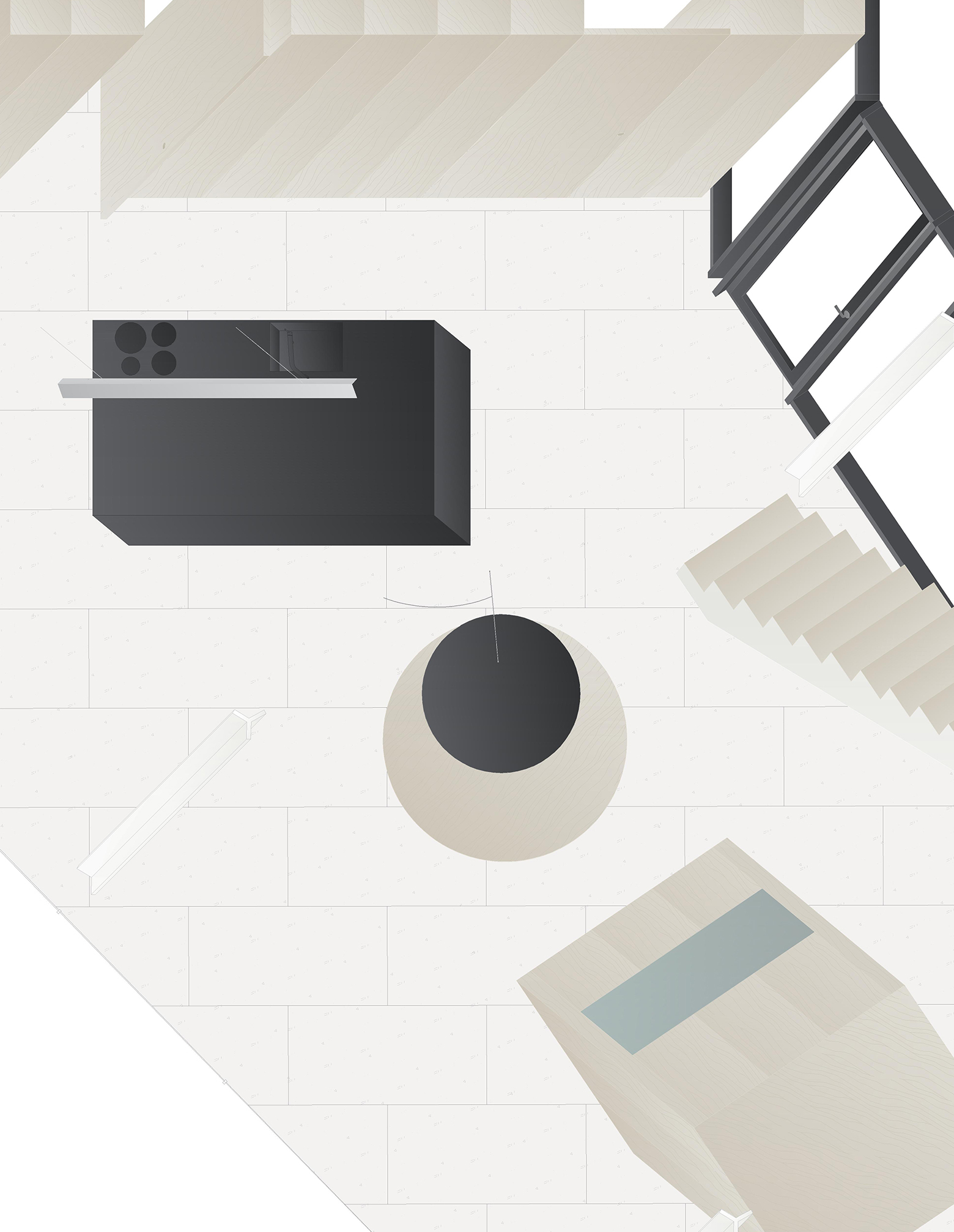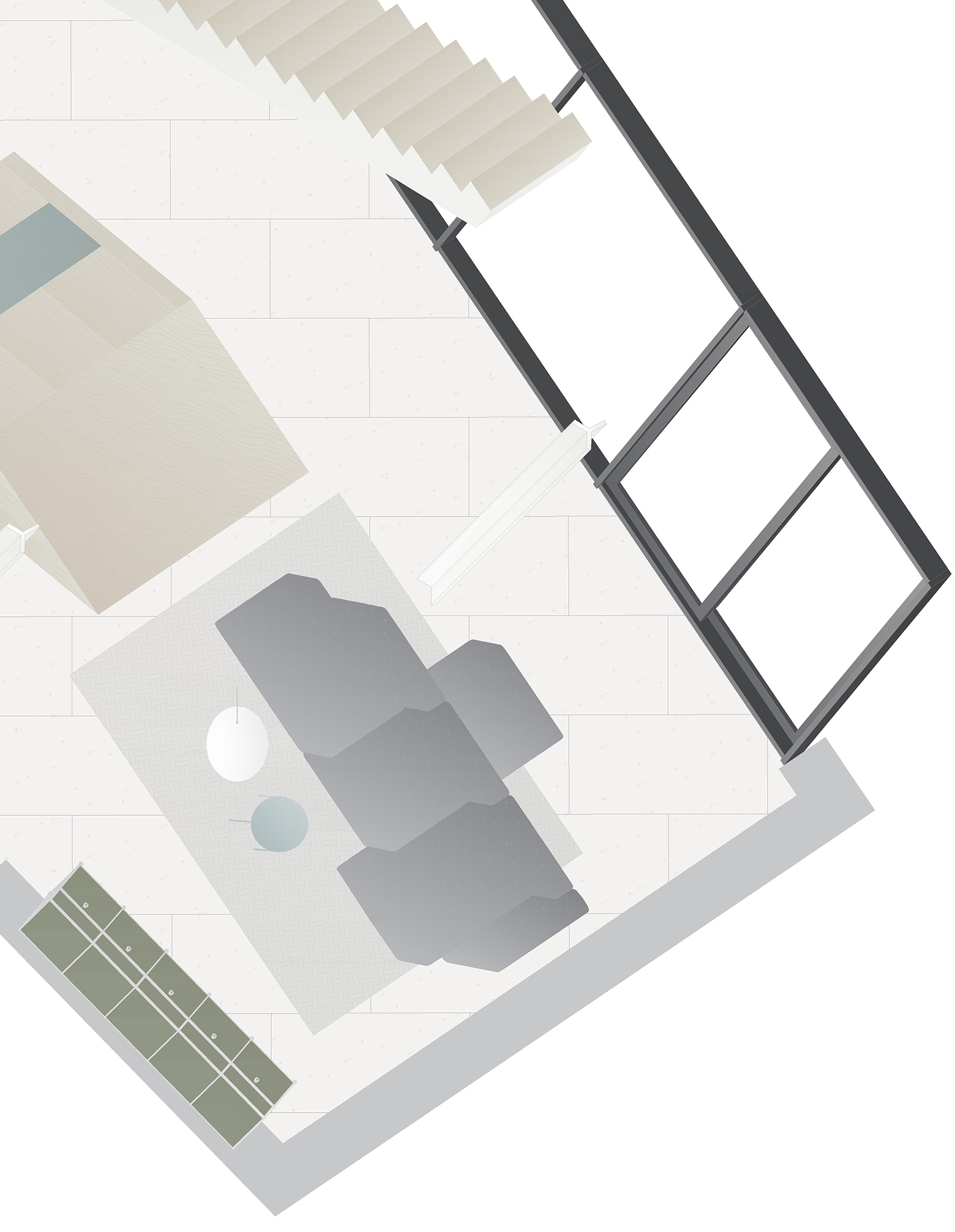 Do vnútorného členenie domu zasahujeme s minimálnymi stavebnými úpravami, pragmaticky pristupujeme k nadväznosti jednotlivých miestností a ich užívaním. Dom delíme na tri funkčné zóny naprieč podlažiami.