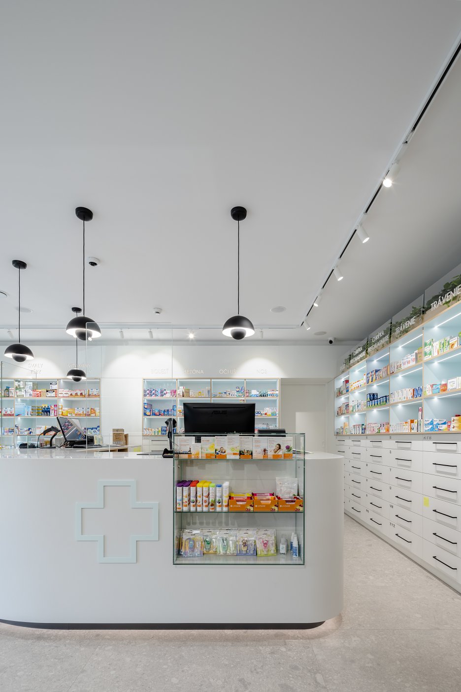 Výberom materiálov a zariadenia sme chceli dosiahnuť čistý, ale zároveň nie sterilný dojem z priestoru lekárne. Tomu napomáha aj výber rôznych typov osvetlenia, od dominantnejších visiacich nad pultom po praktické koľajnicové systémy s možnosťou variabilného osvetlenia predávaných produktov.