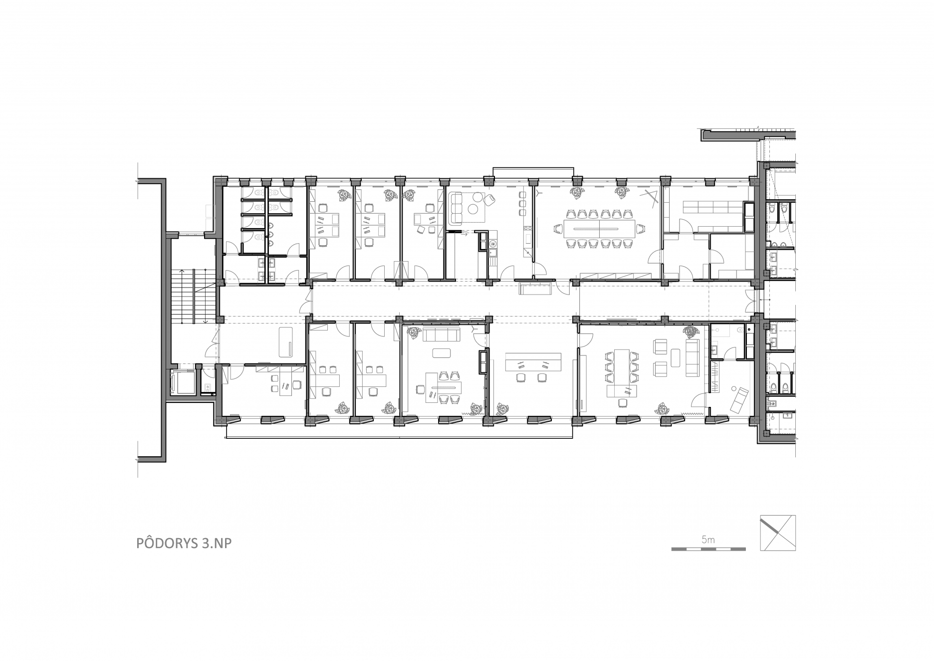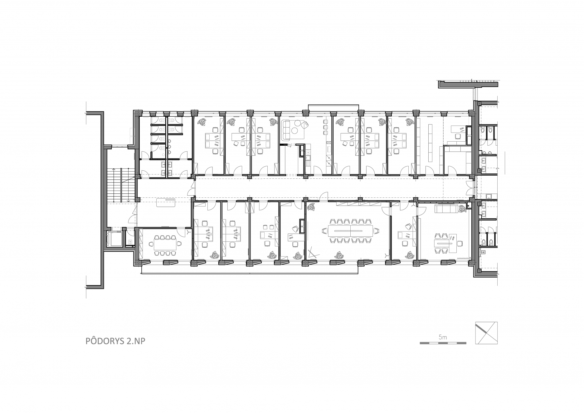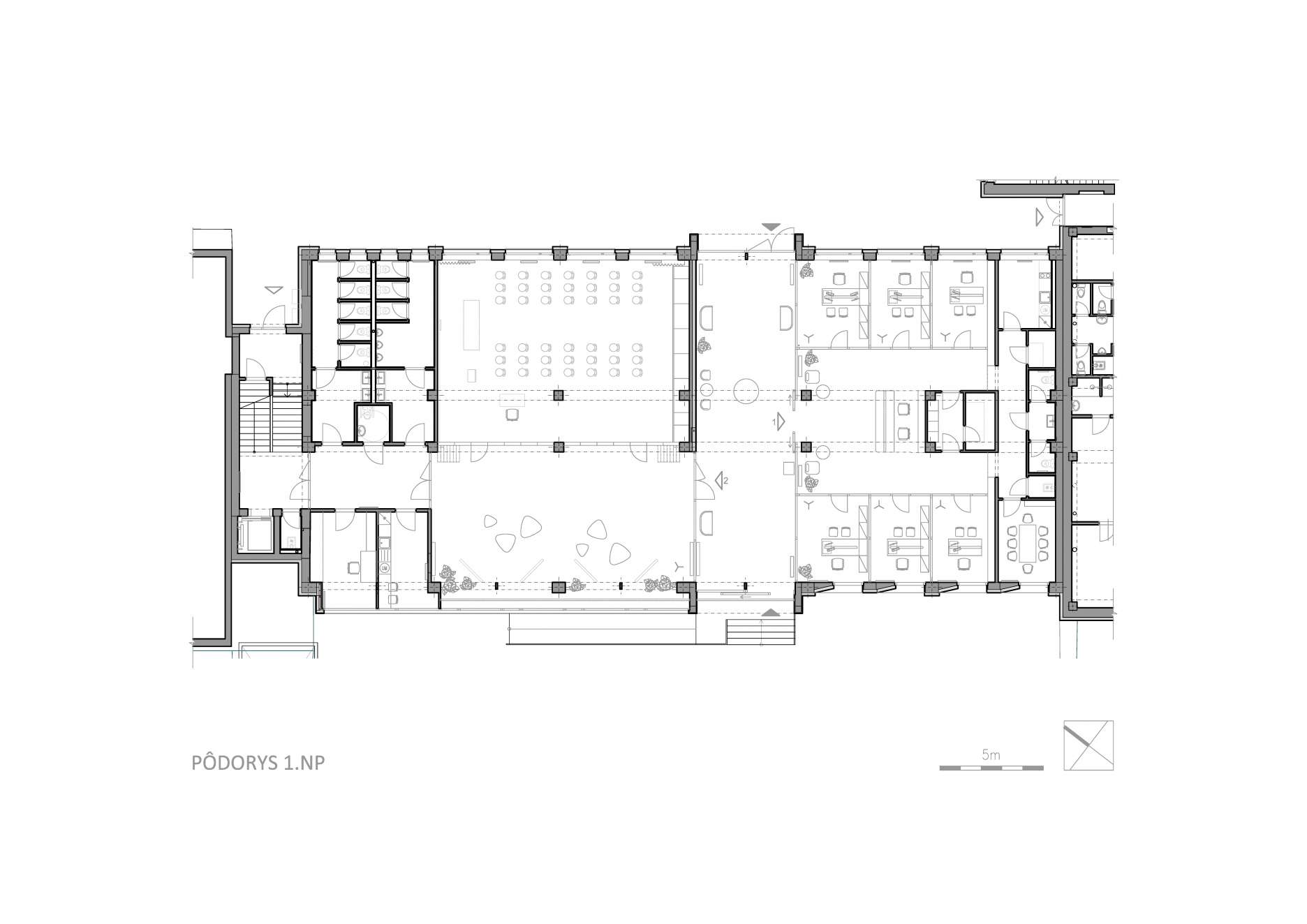 V takmer celom 1. NP sú priznané stropy s vedením technických sietí – najmä vzduchotechniky.