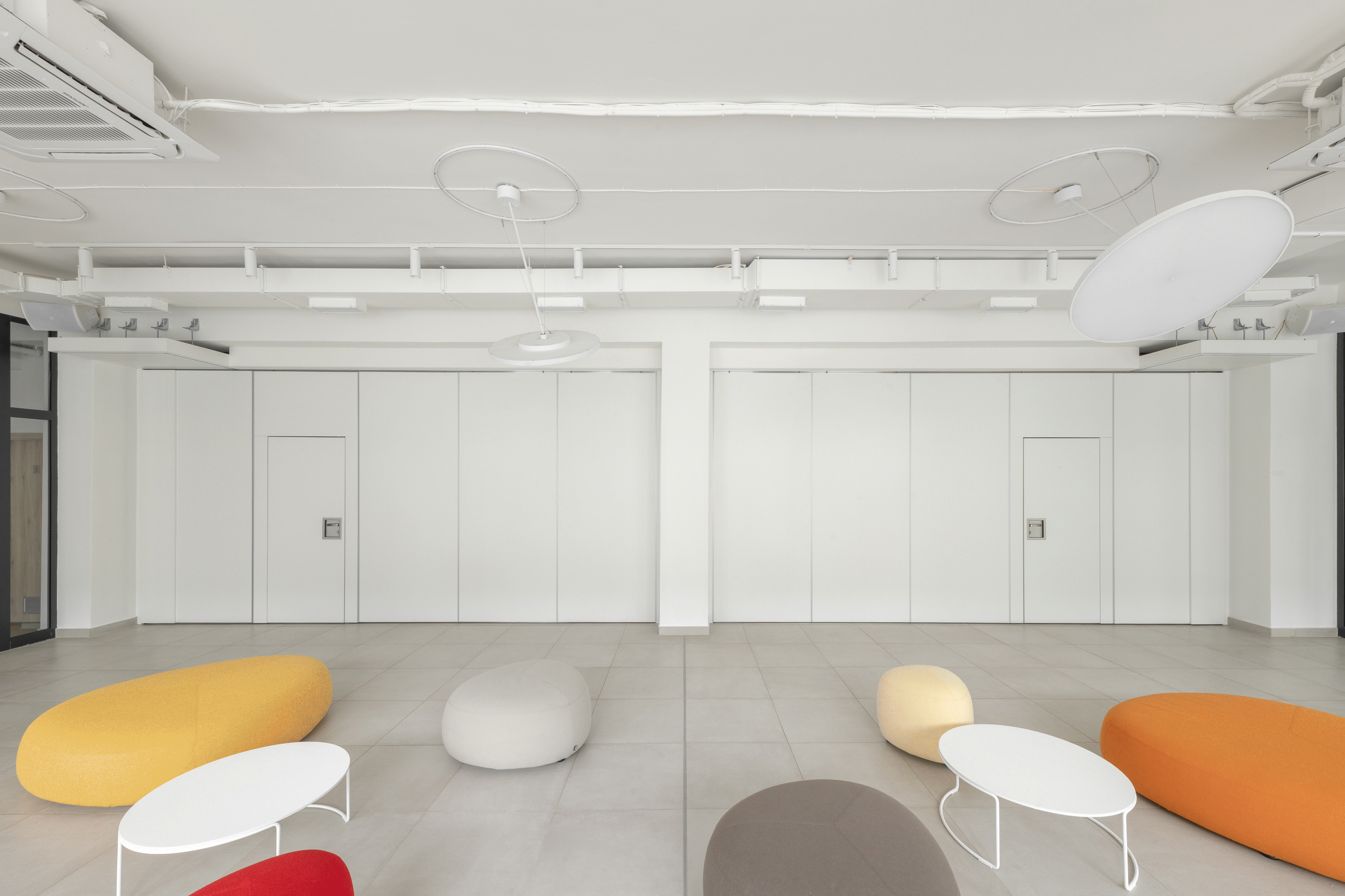 Keďže svetlé výšky miestností sú nižšie, stropy, káble a potrubia sú zjednotené nástrekom v bielej farbe, čo priestor vizuálne odľahčuje a zachováva technickú úprimnosť.