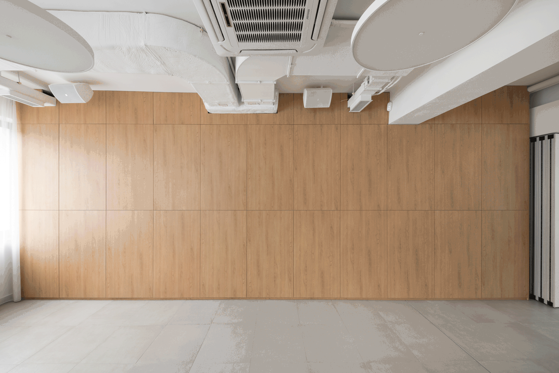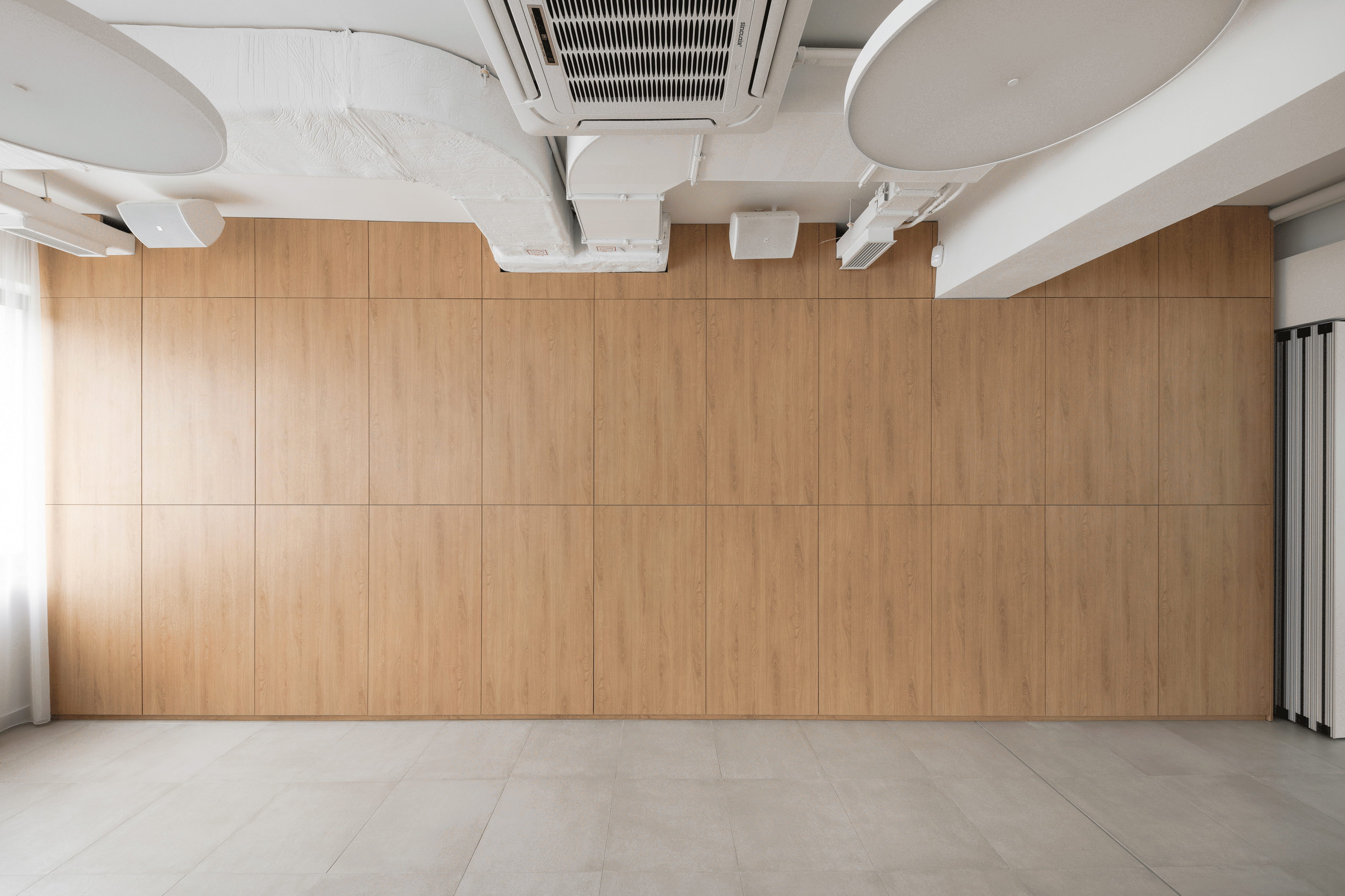 Zaujímavosťou je akustický obklad z ovčej vlny na hlavnej stene.