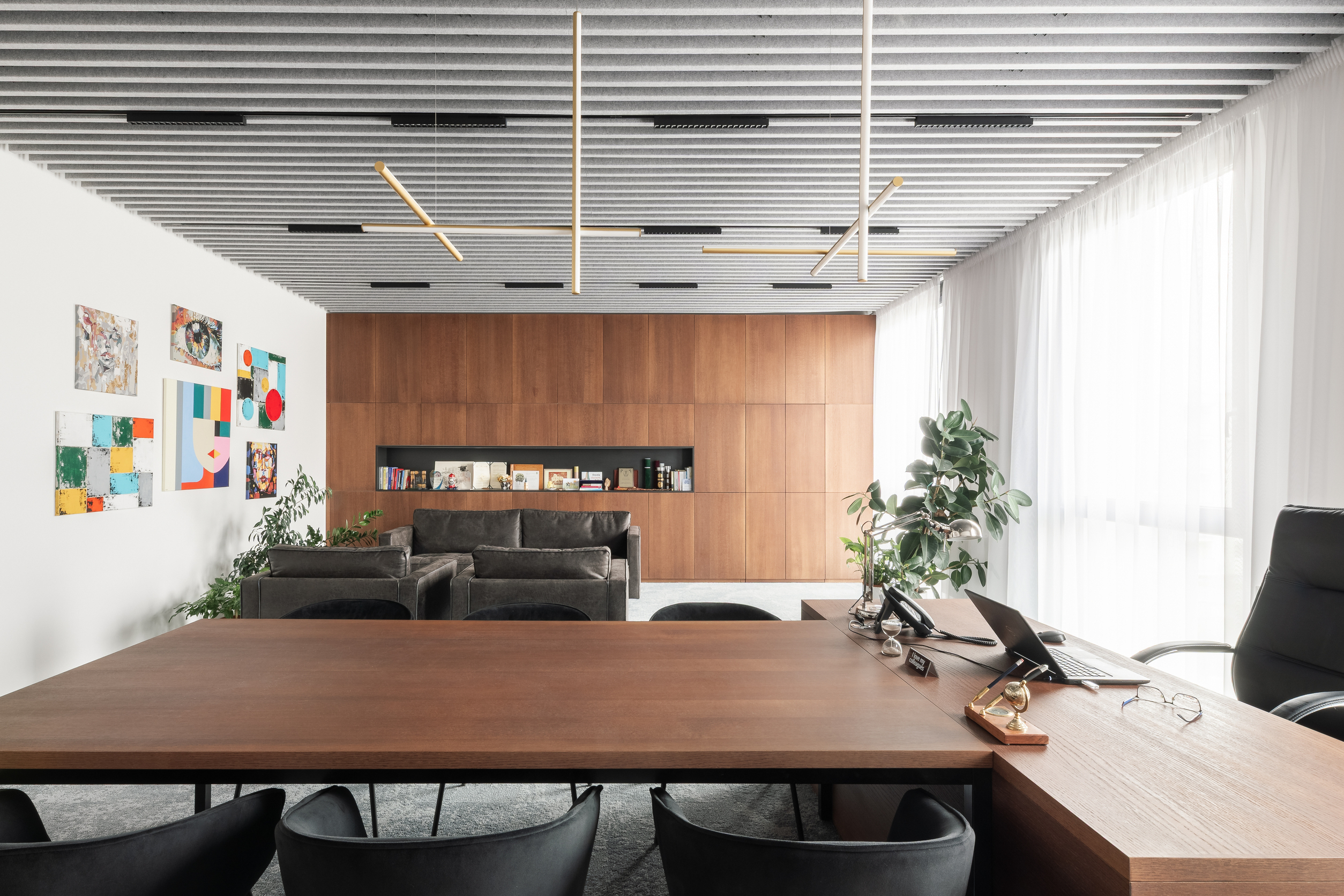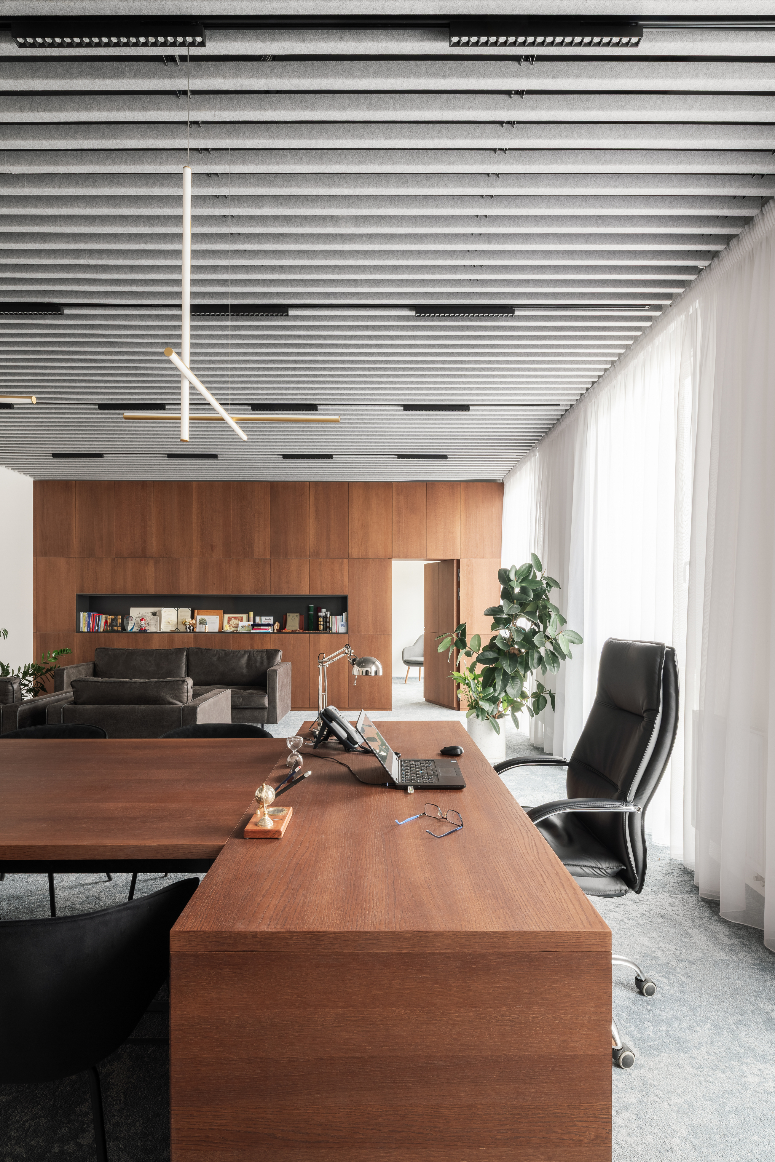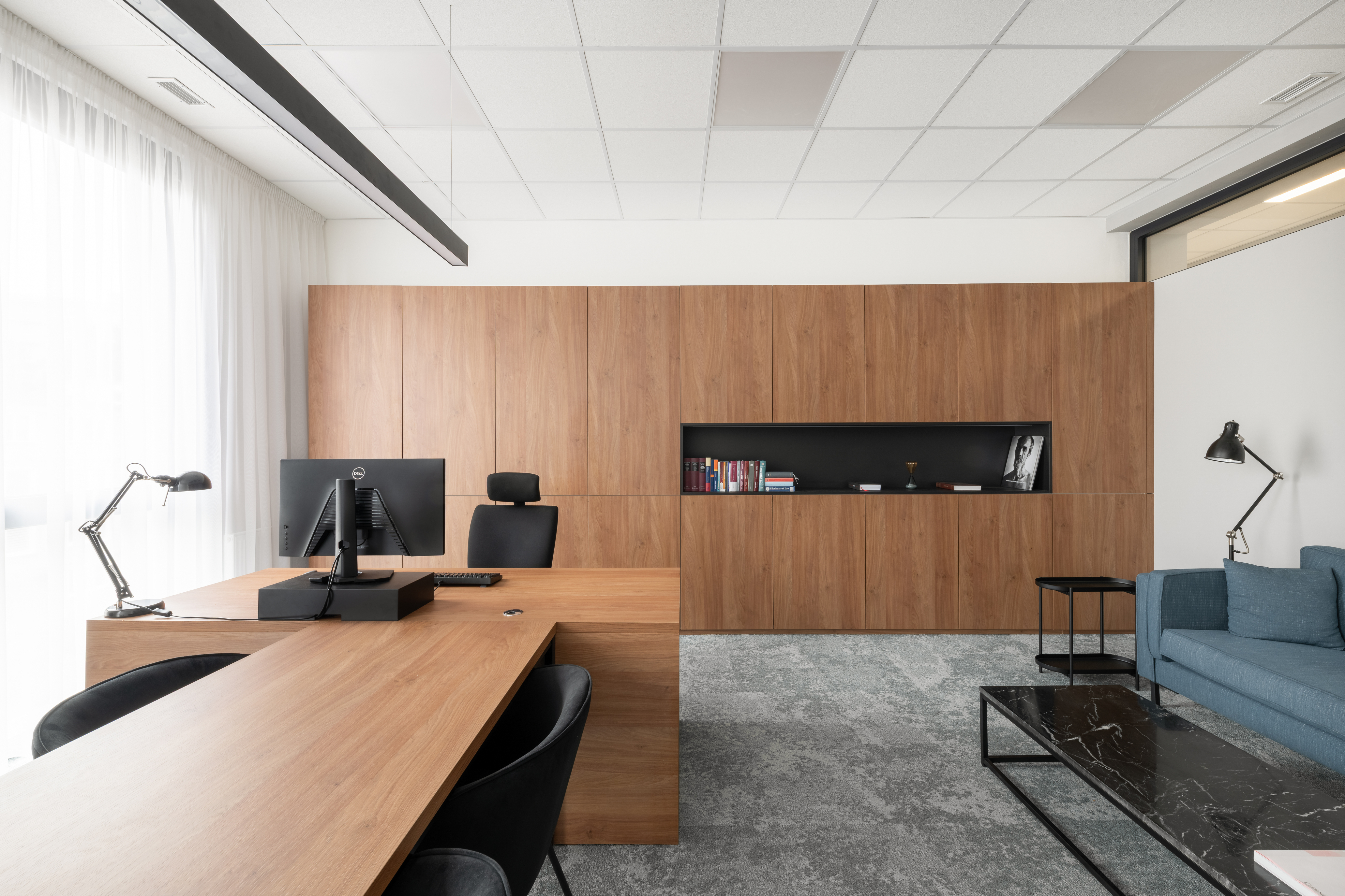 Kancelária primátora má na mieru navrhnutý interiér s lamelovým akustickým obkladom. Za skrytými dverami v nábytkovej stene sa nachádza menší šatník a kúpeľňa. Kancelárie zástupcu primátora a prednostu úradu sú rovnako realizované na mieru, zvyšné pracoviská sú vybavené typovým nábytkom. Kancelárie orientované do ulice sú tienené elektronicky ovládanými roletami.