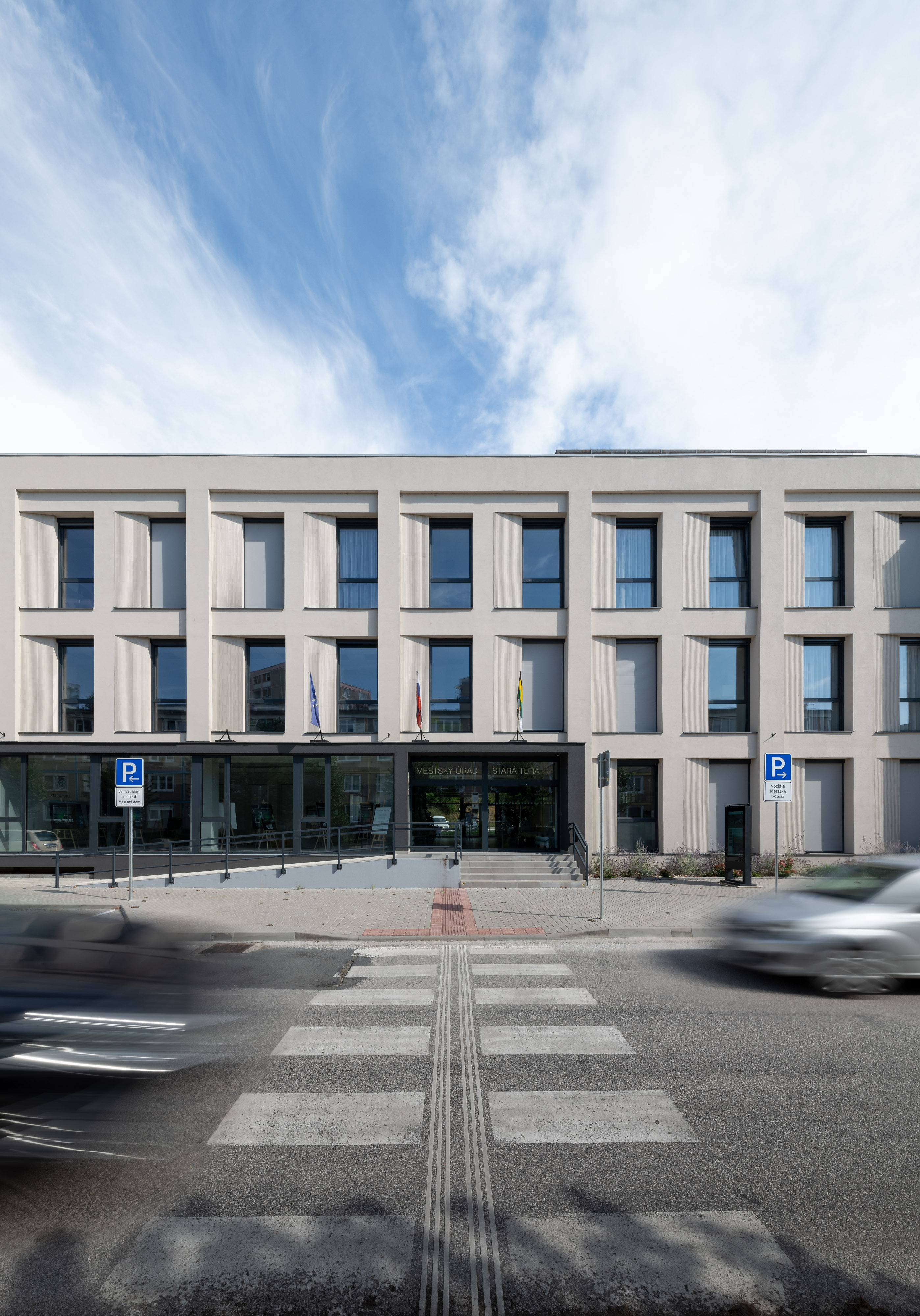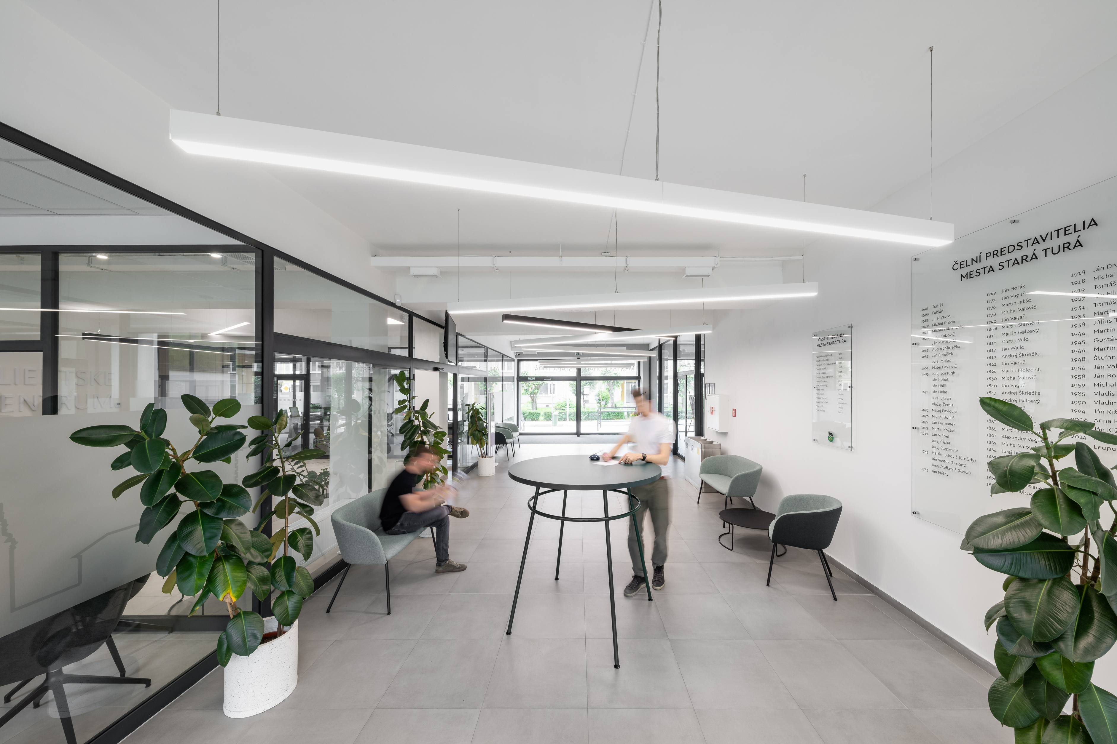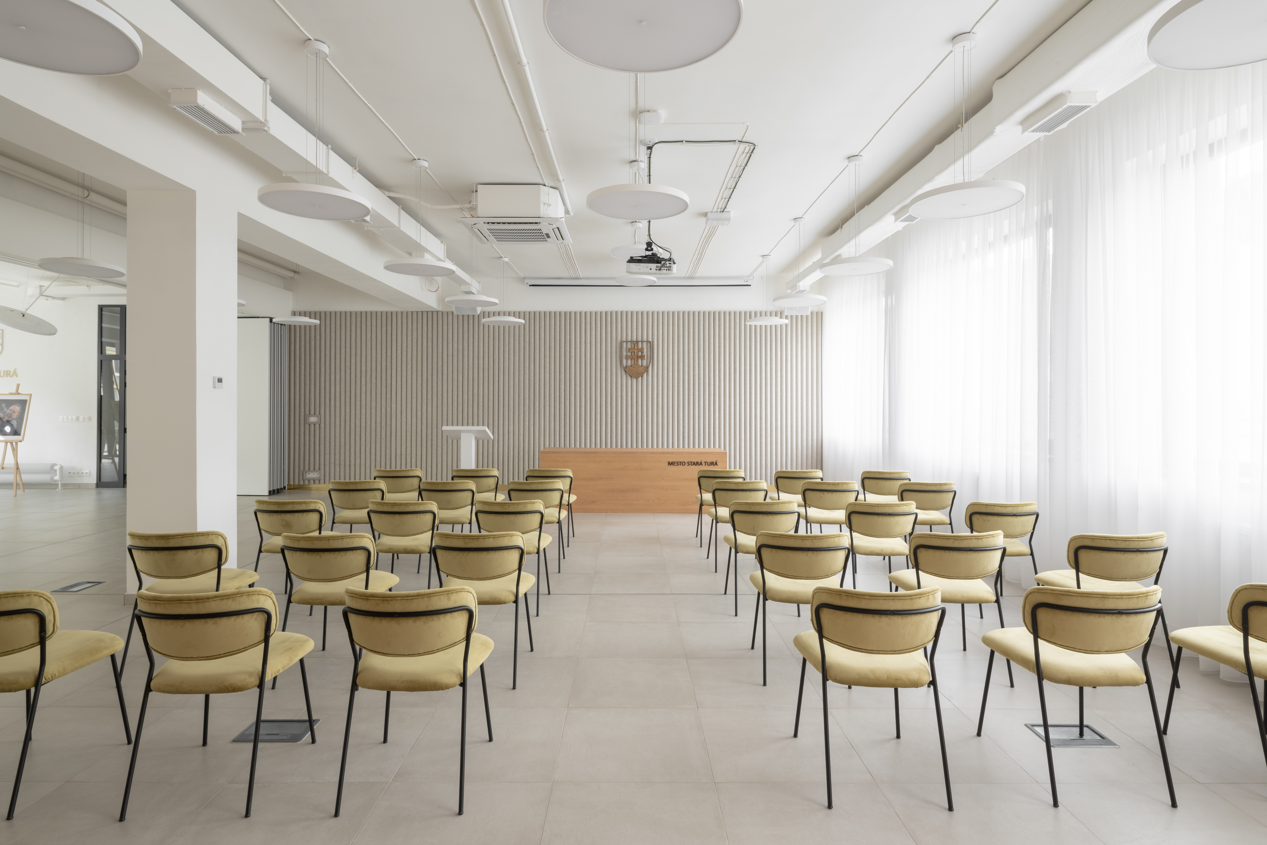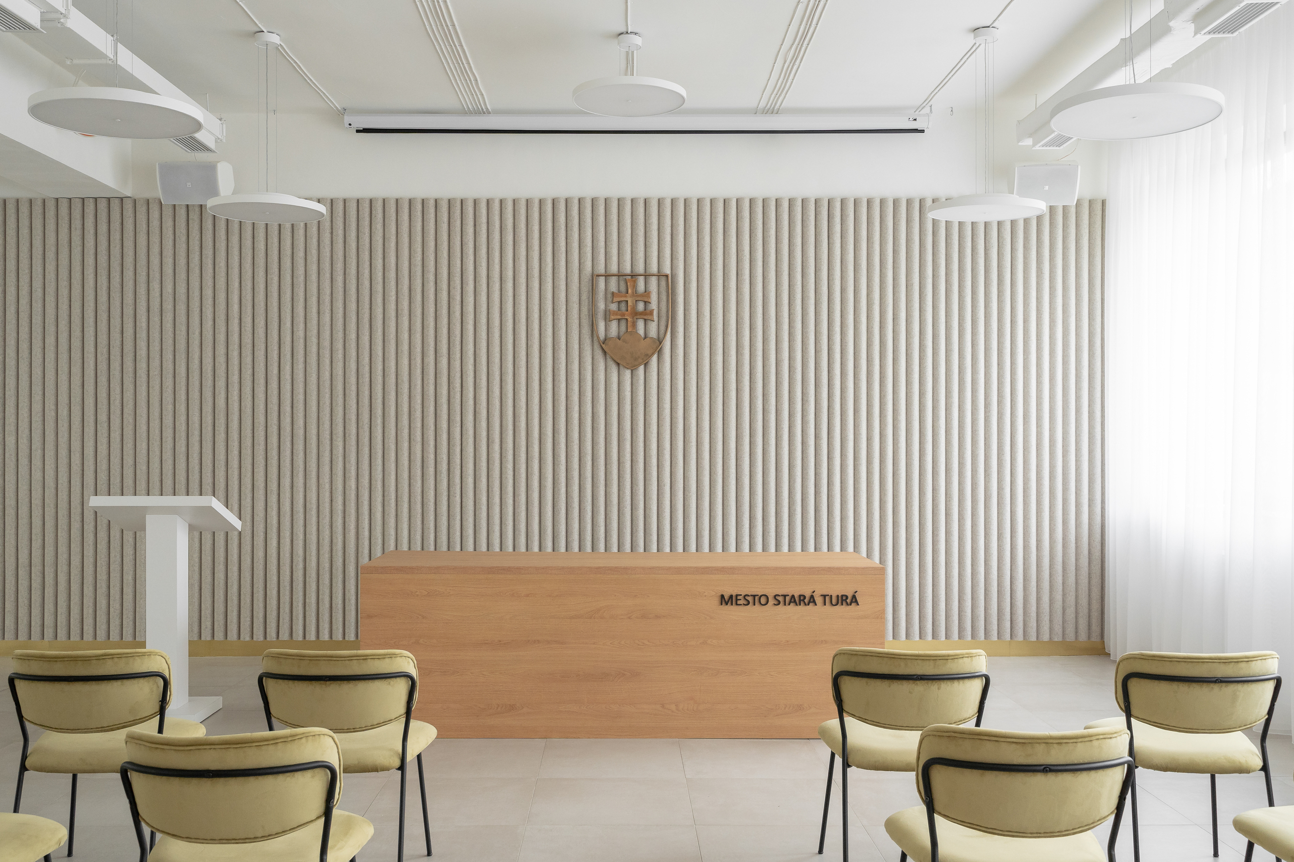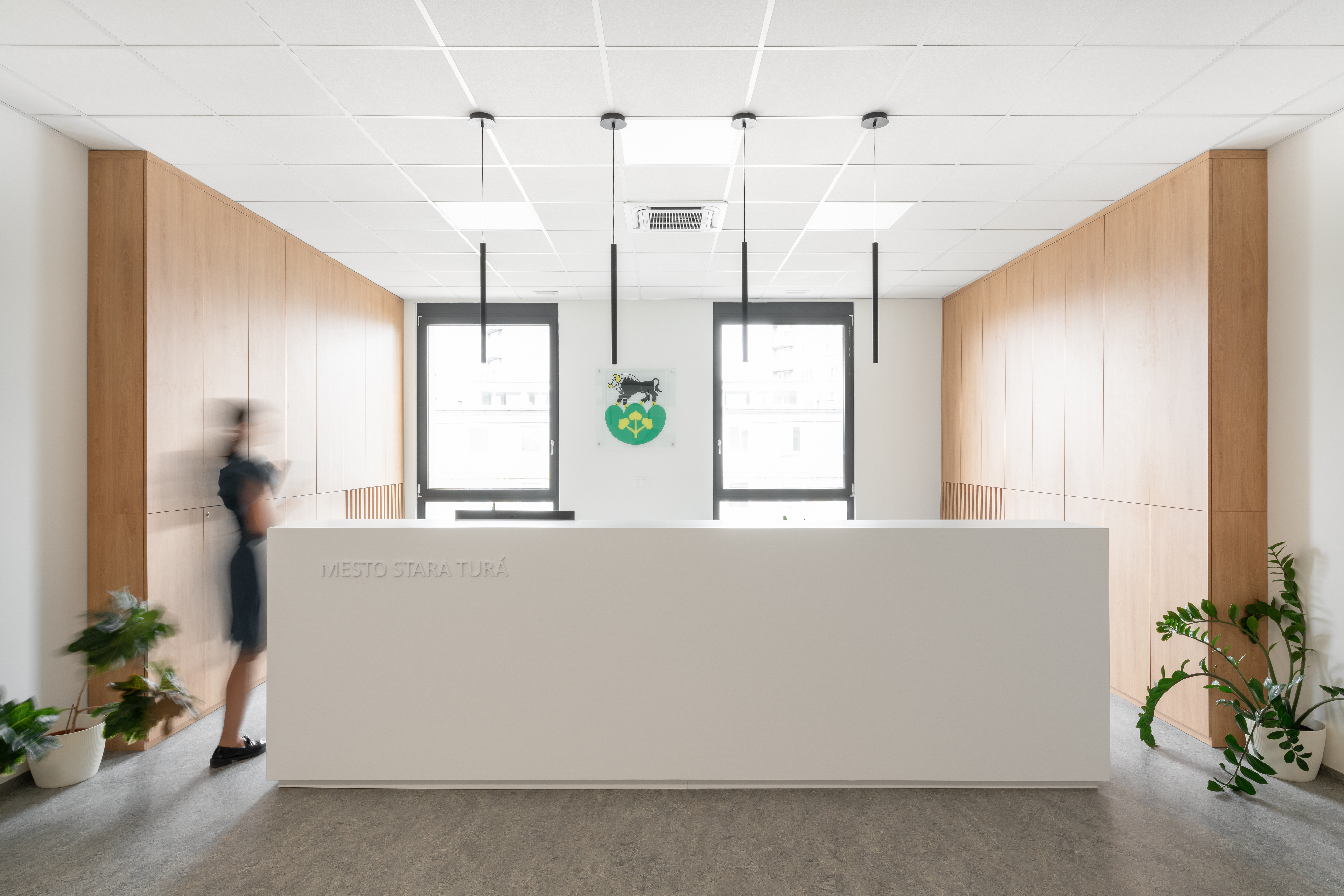 Interiér mestského úradu tvorí súčasť rozsiahleho projektu konverzie bývalej strednej priemyselnej školy na mestský úrad v Starej Turej podľa návrhu ateliéru pavlech architekti. Objekt bol dokončený v lete 2023 a dnes pod jednou strechou sústreďuje kľúčové oddelenia samosprávy i klientské centrum pre verejnosť. Projekt nadviazal na skôr zrealizovanú prestavbu novšej časti areálu na mestský dom, čím vzniklo lokálne centrum služieb na jednej adrese.