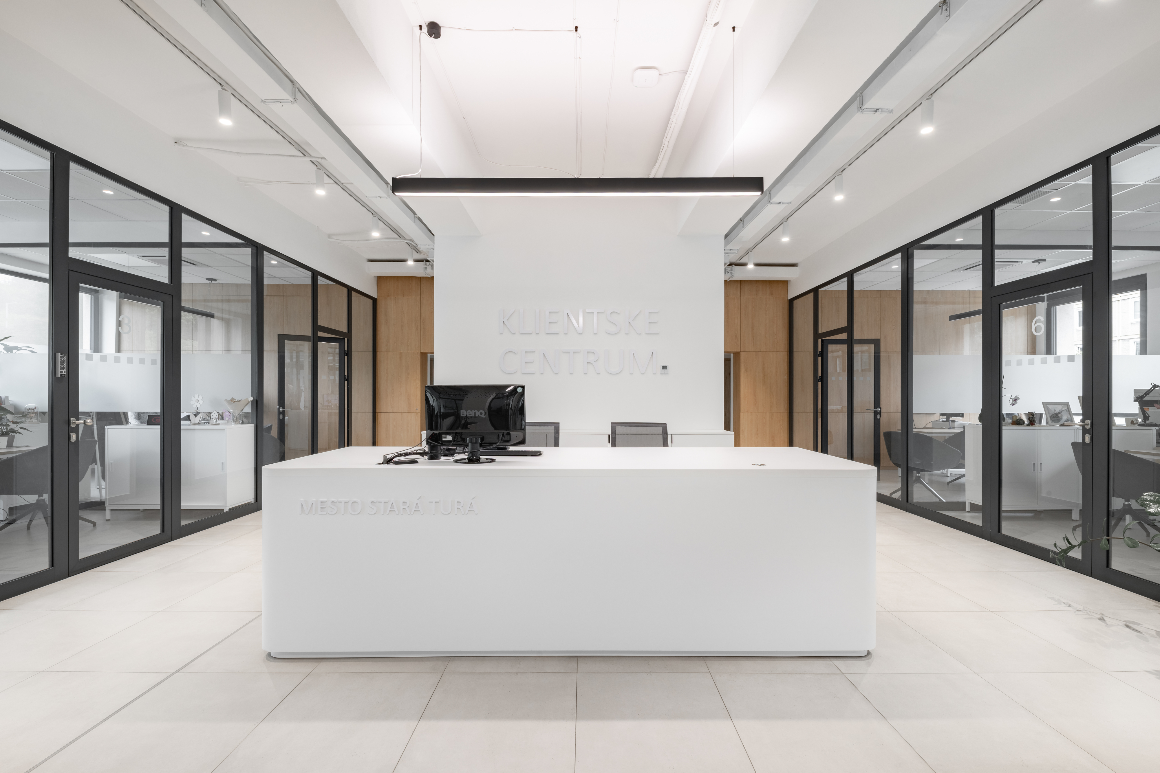 Pôvodný zámer počítal s otvoreným klientskym centrom. V priebehu realizačného projektu však investor zadanie upravil: vznikli menšie kancelárie jednotlivých oddelení, vzájomne oddelené sklenenými priečkami, aby sa zvýšila mierna akustická intimita. Ťažisko dispozície tvorí recepčný pult, za ktorým sa nachádza zázemie klientskeho centra – toalety, kuchynka, serverovňa a menšia zasadacia miestnosť.
