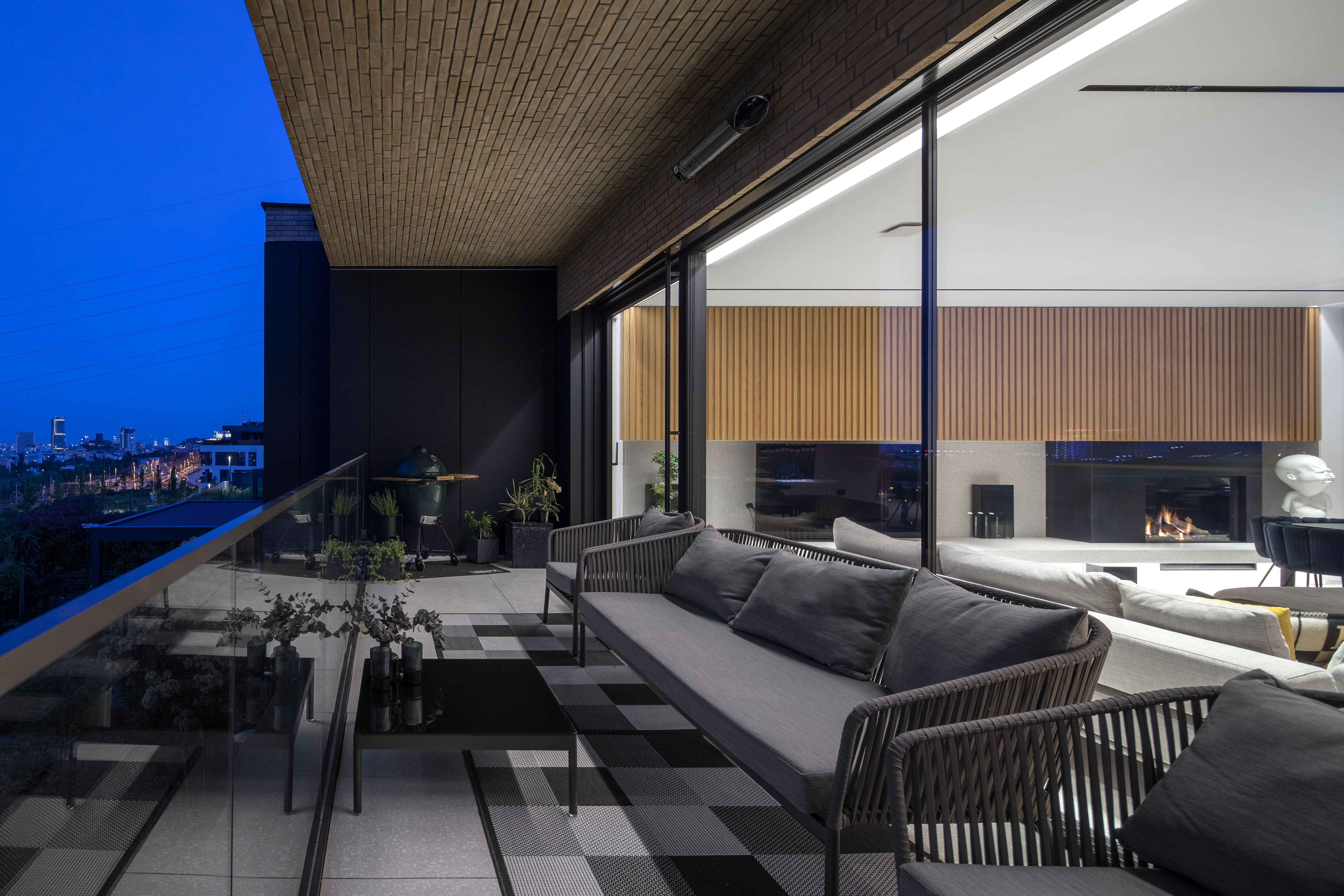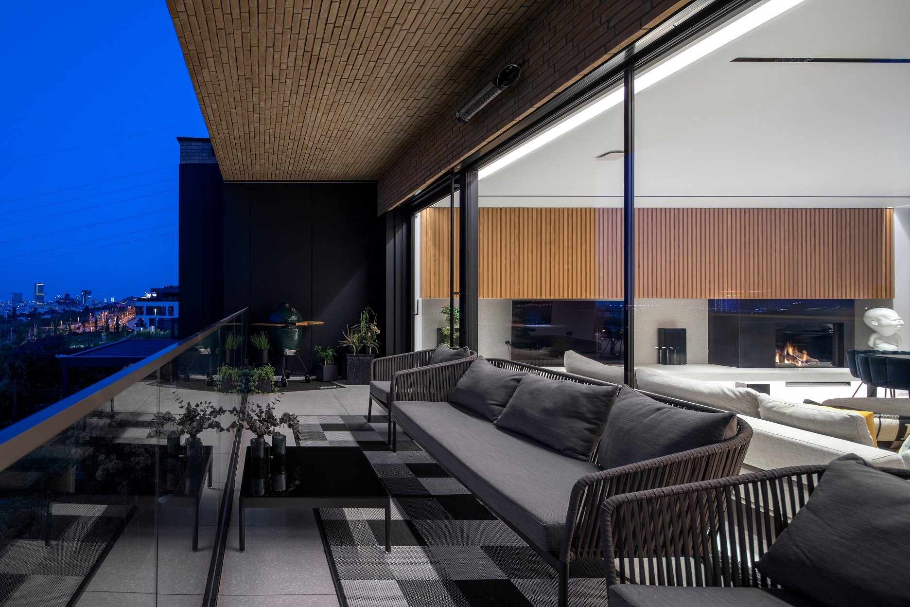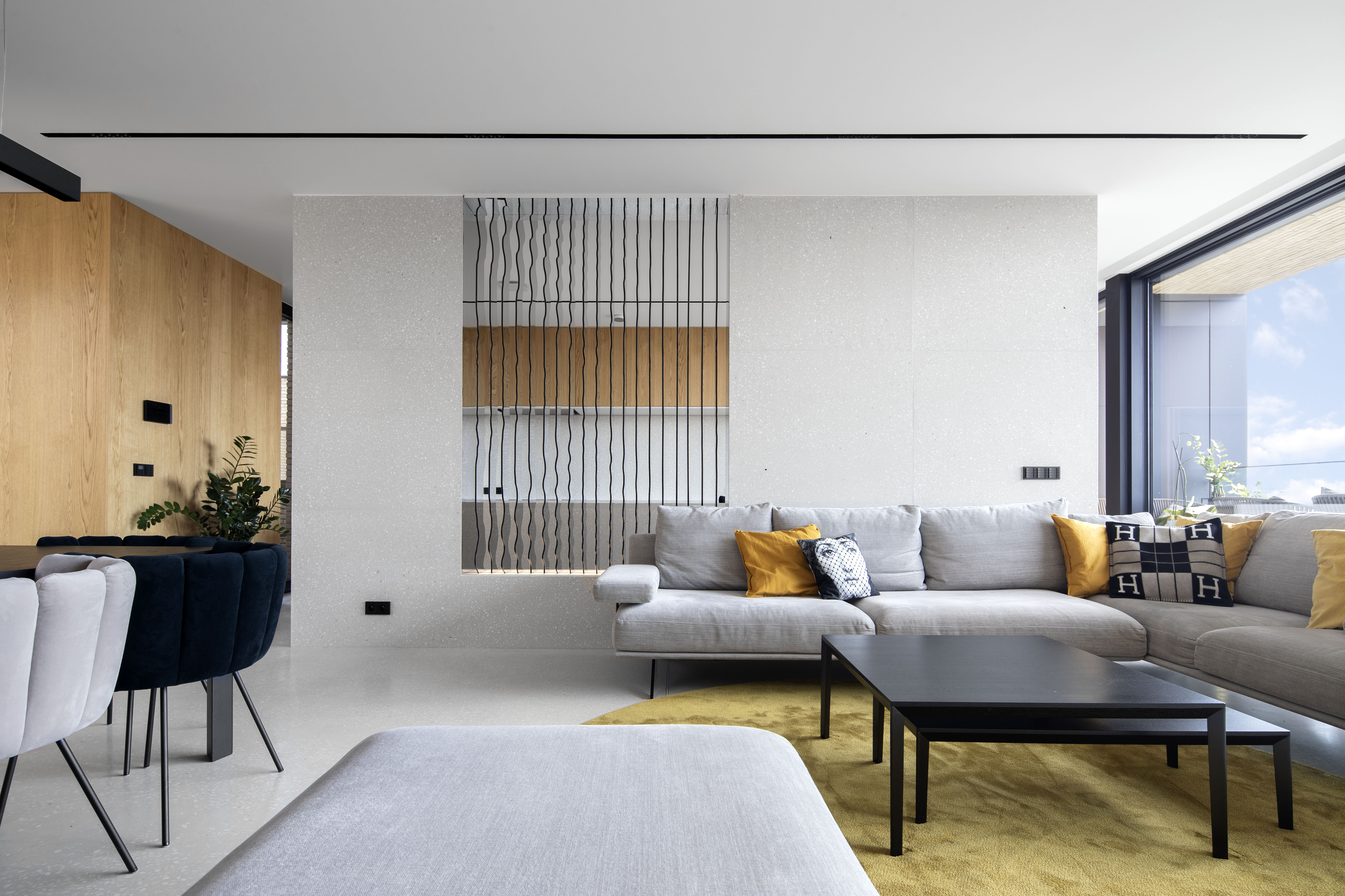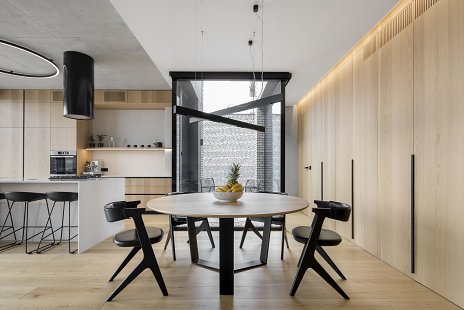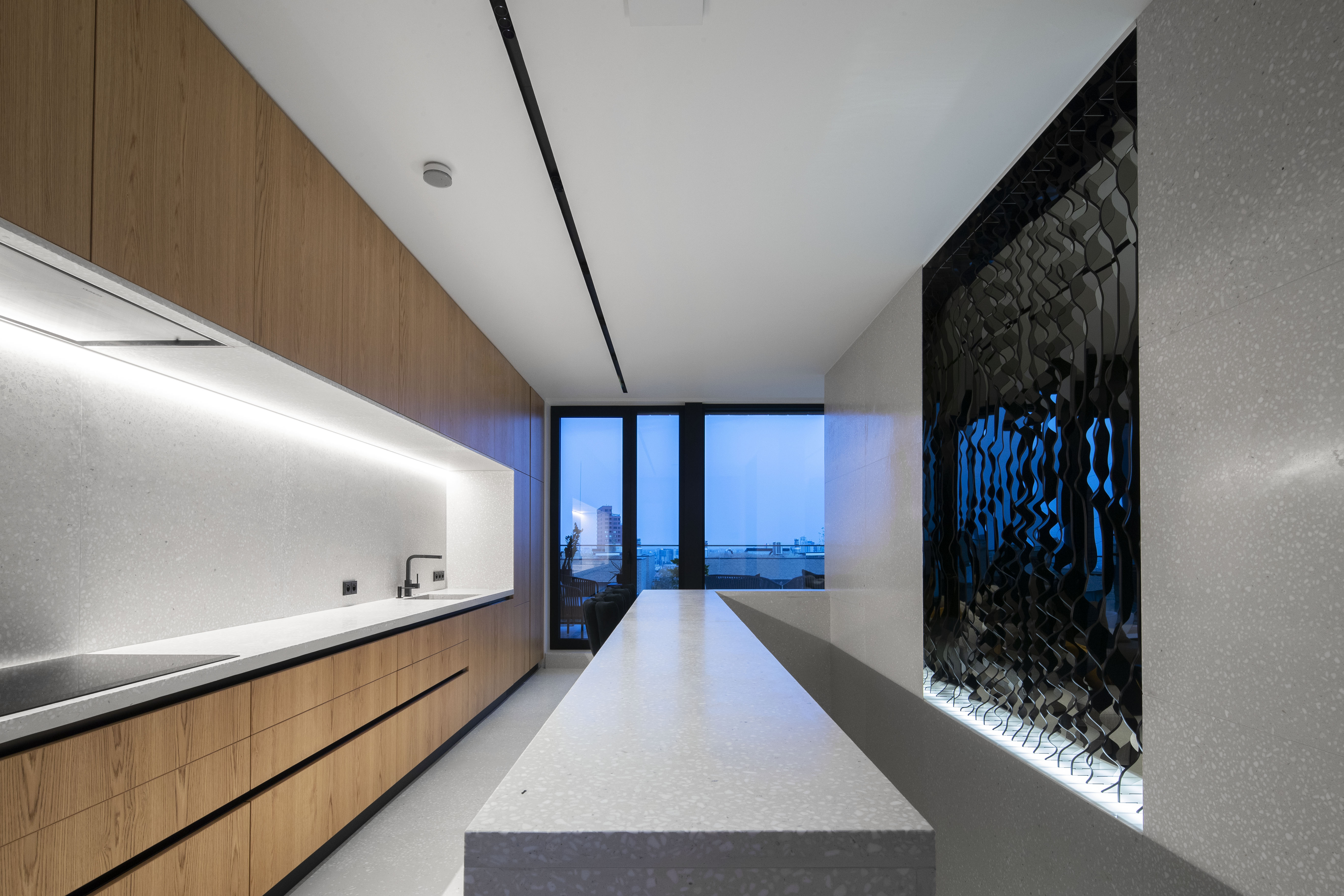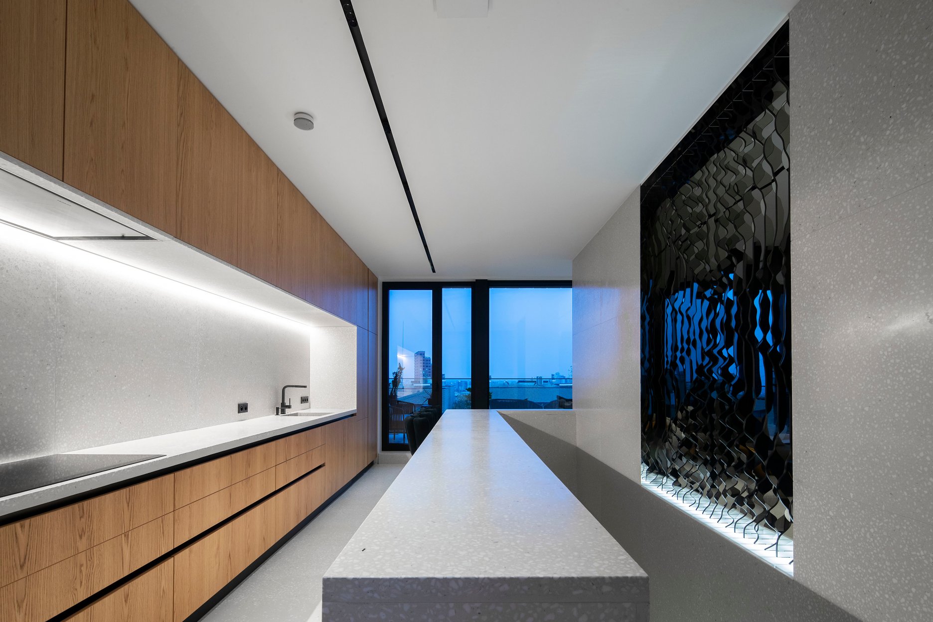 Veľkometrážne bývanie s výhľadom na panorámu Bratislavy v súbore ELEVEN Houses. Ateliér cakov+partners navrhol interiér s výmerou 180 m2 ako náhradu za dom v bratislavskom satelite. Návrh využíva pôvodnú dispozíciu a priestorovú logiku. Necháva vyznieť otvorený priestor so svetlou výškou tri metre, výhľad z obytných priestorov, alebo vlastné átrium. Dominantné terazzo, použité na podlahách, stenách a ako súčasť nábytkových prvkov, dopĺňa prírodná textúra dreva.