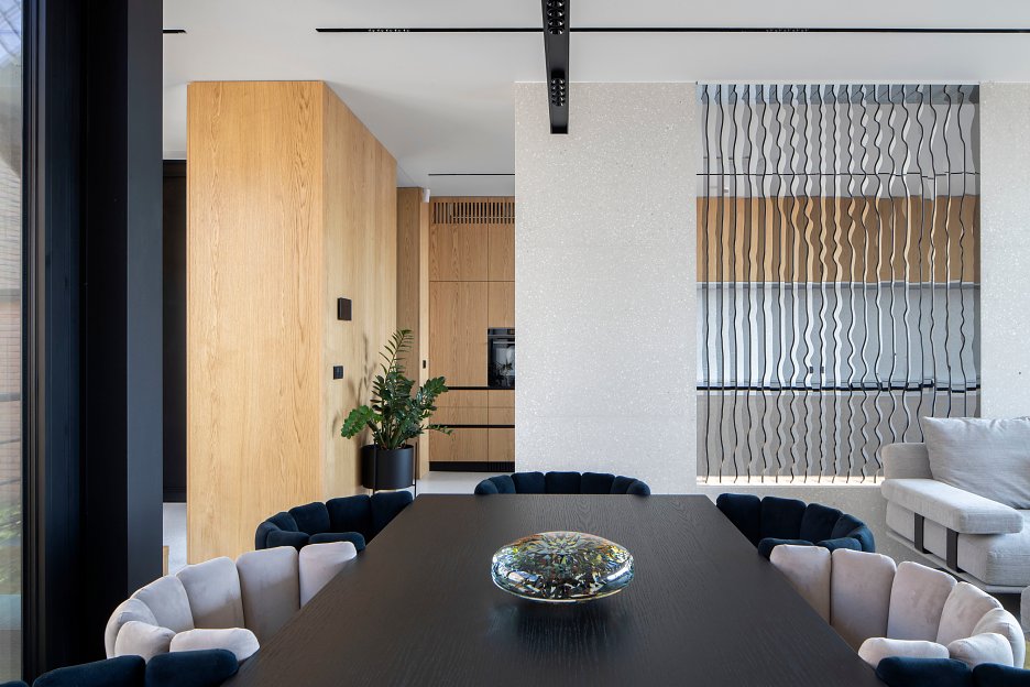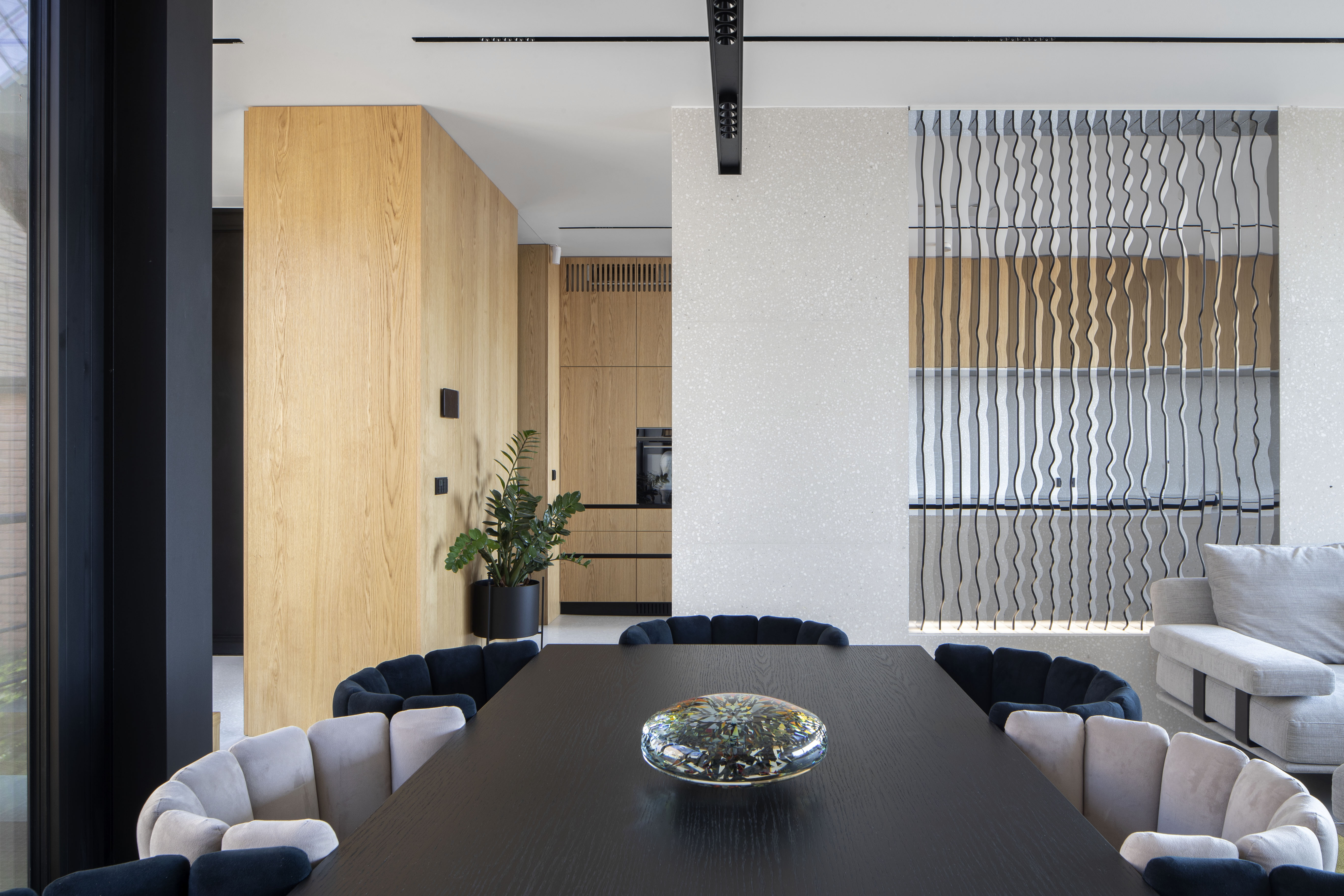 Umelecké dielo od Ašota Haasa medzi obývačkou a kuchyňou vytvára zaujímavé odrazy od vlnitých lamiel vyrobené z vysoko lešteného antikoru.