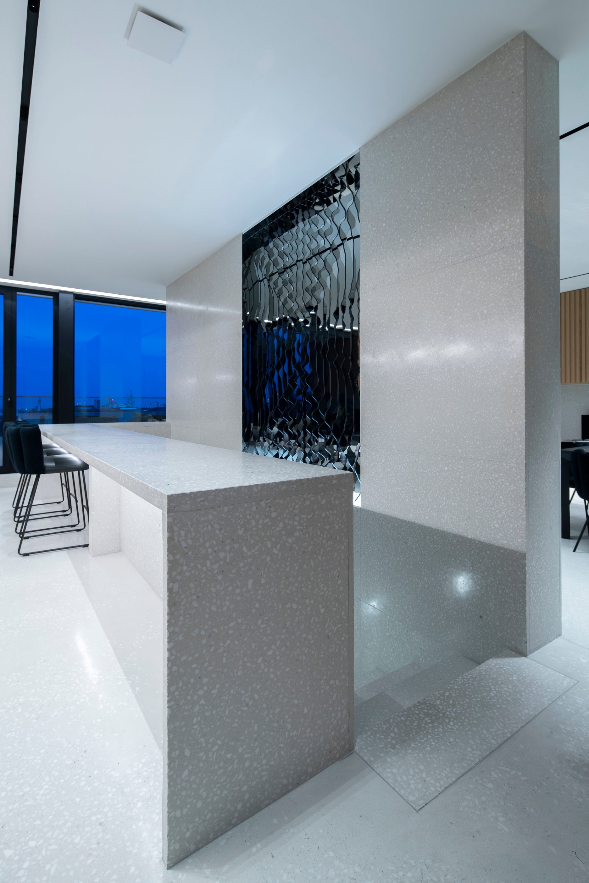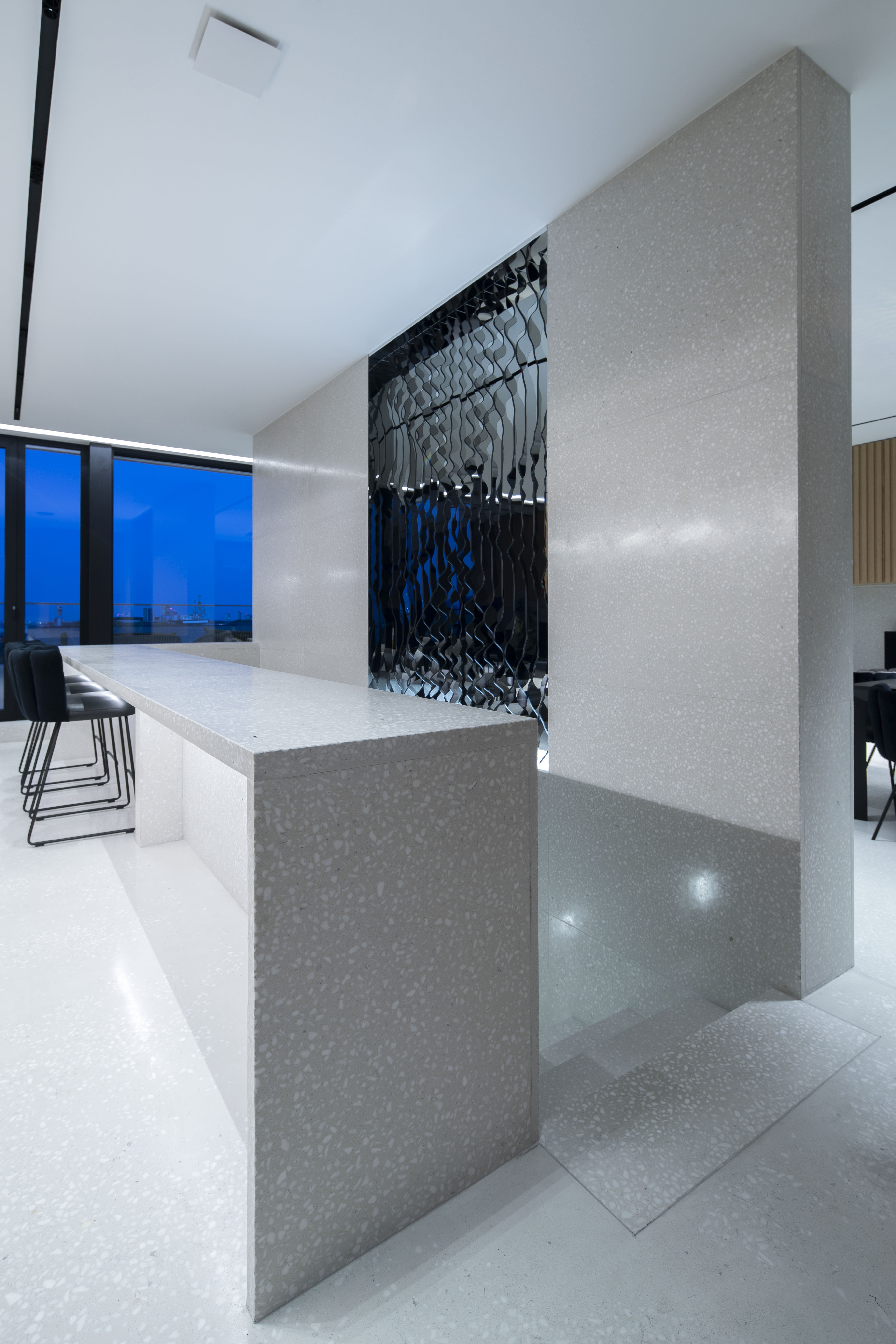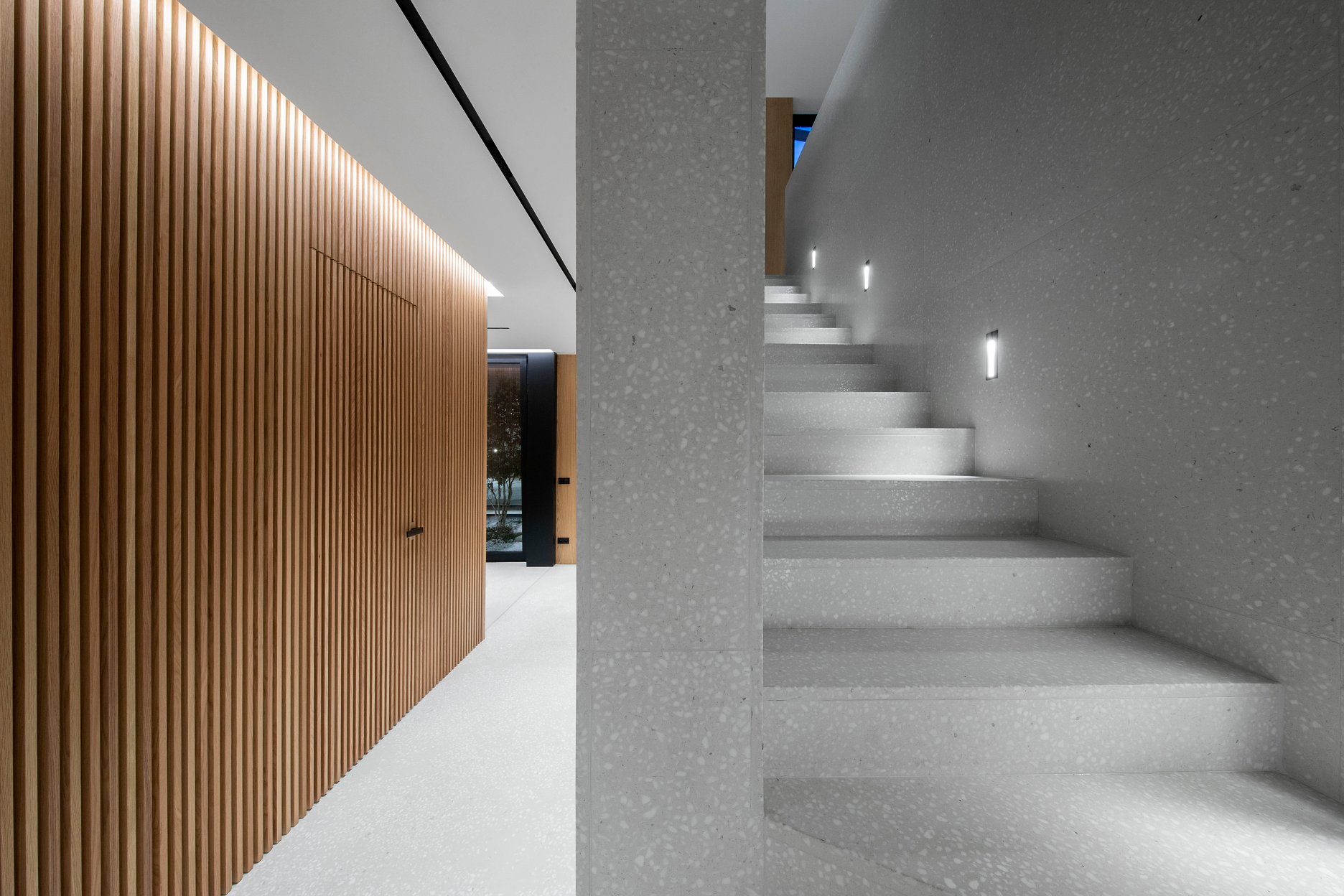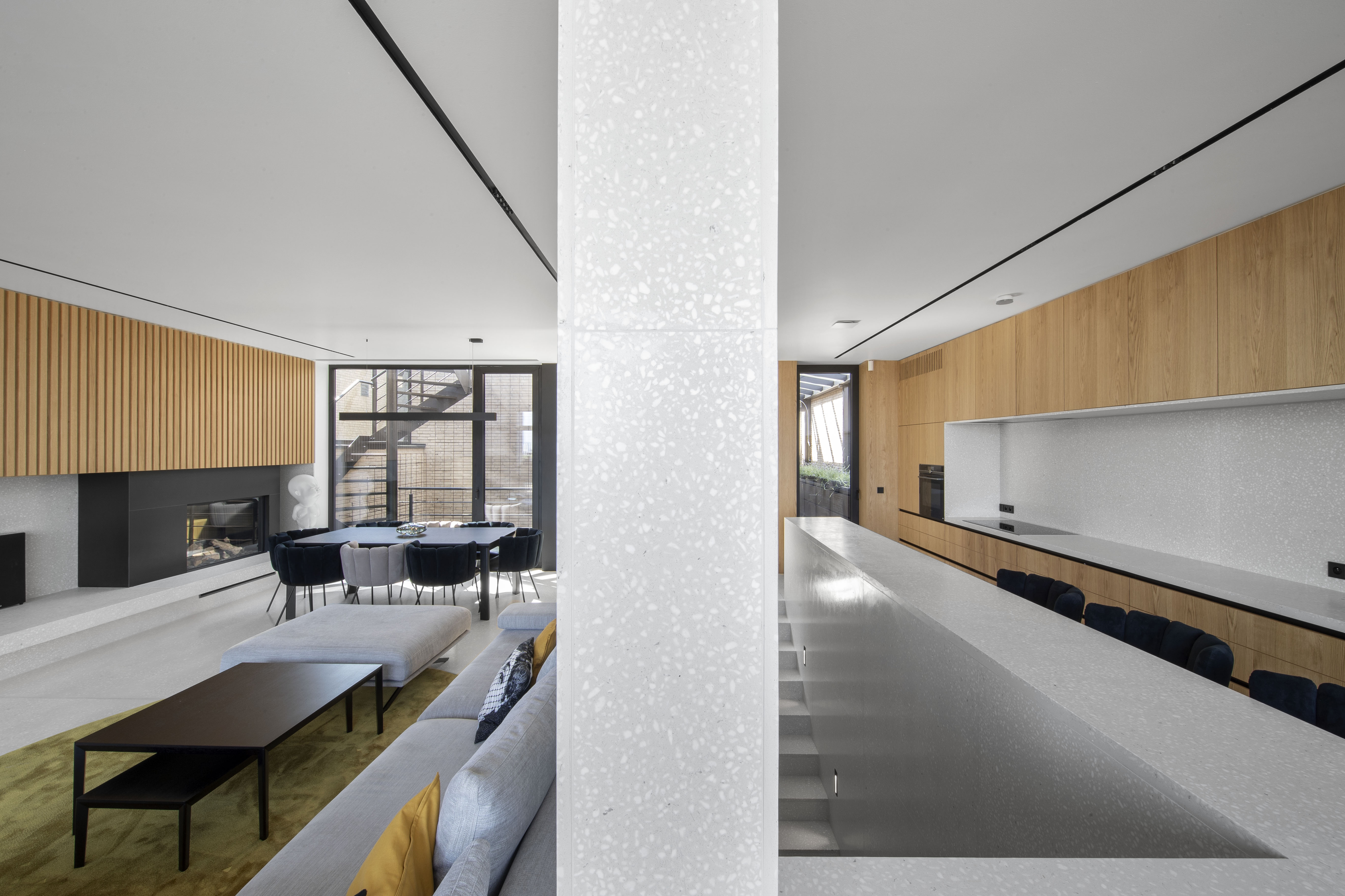 Charakter interiéru tvorí kombinácia na mieru vyrobeného terazza s bielym carrarskym mramorom a dreva. Terazzo je použité ako liata podlaha, na obklad stien, pochôdzna dlažba na terasách ako aj pre pracovné dosky v kuchyni a v kúpeľniach. Steny a podlahy tak prepája jednotný materiál. Použitý prírodný dub kontrastuje s chladnými povrchmi terazza.