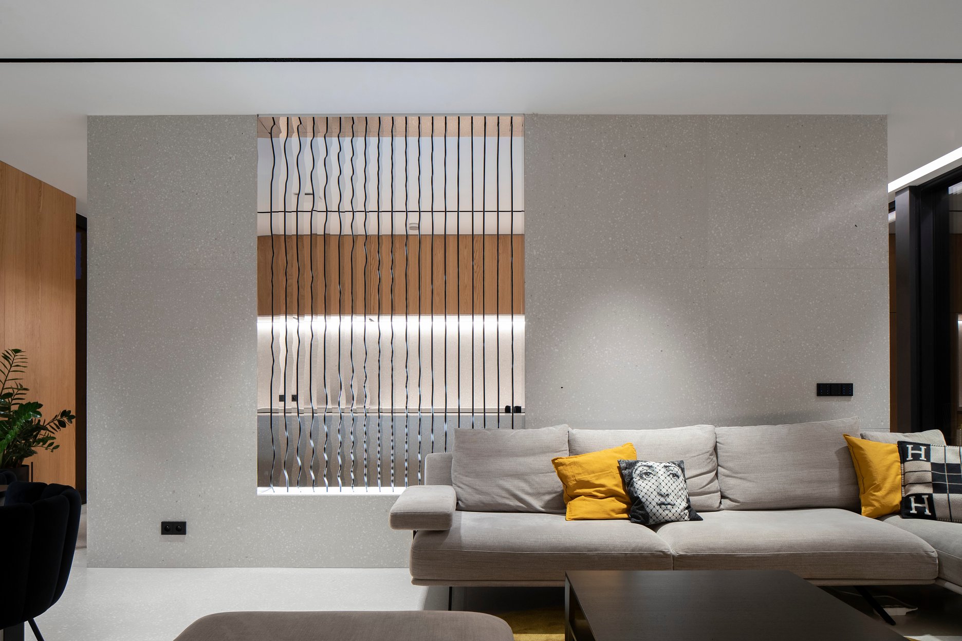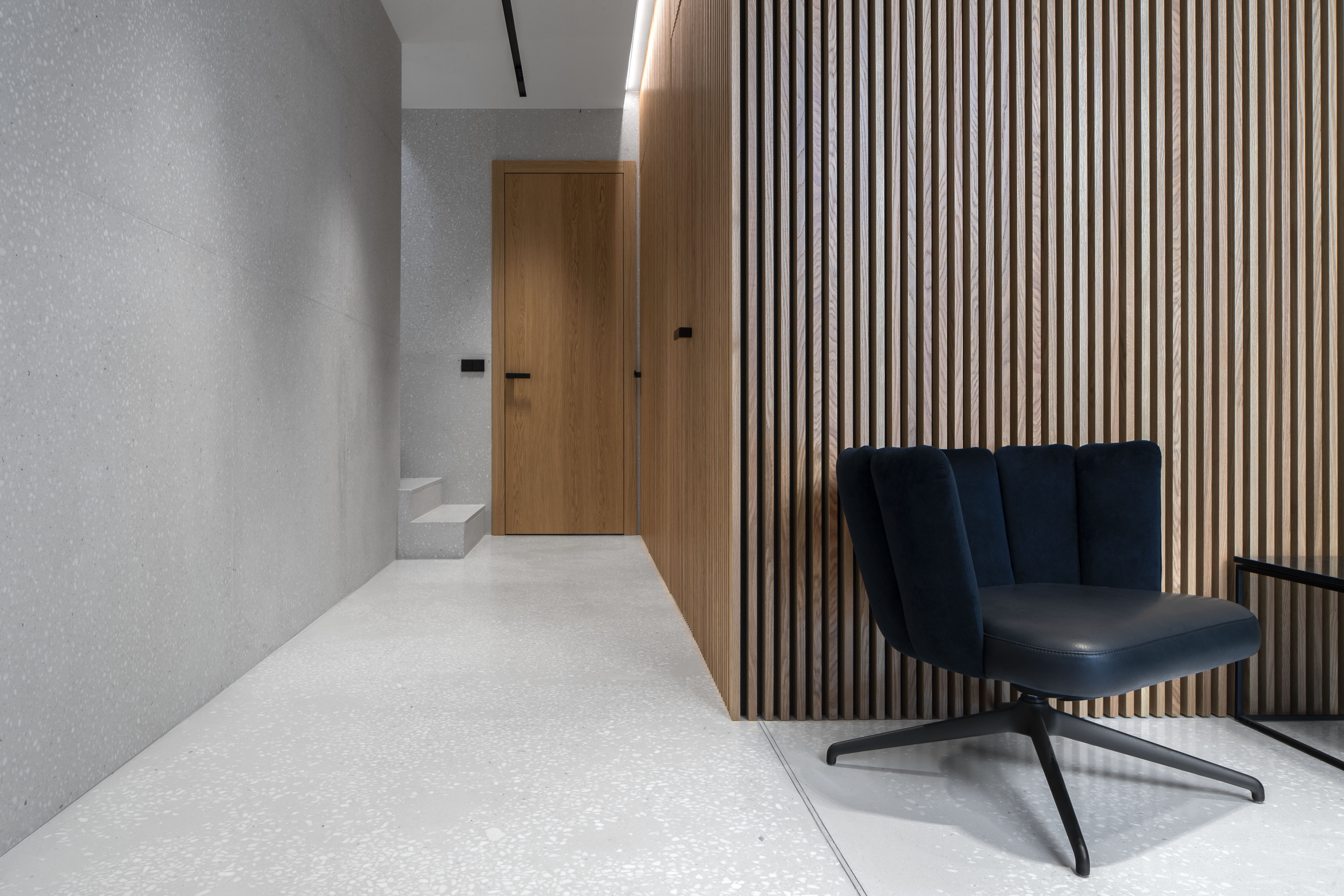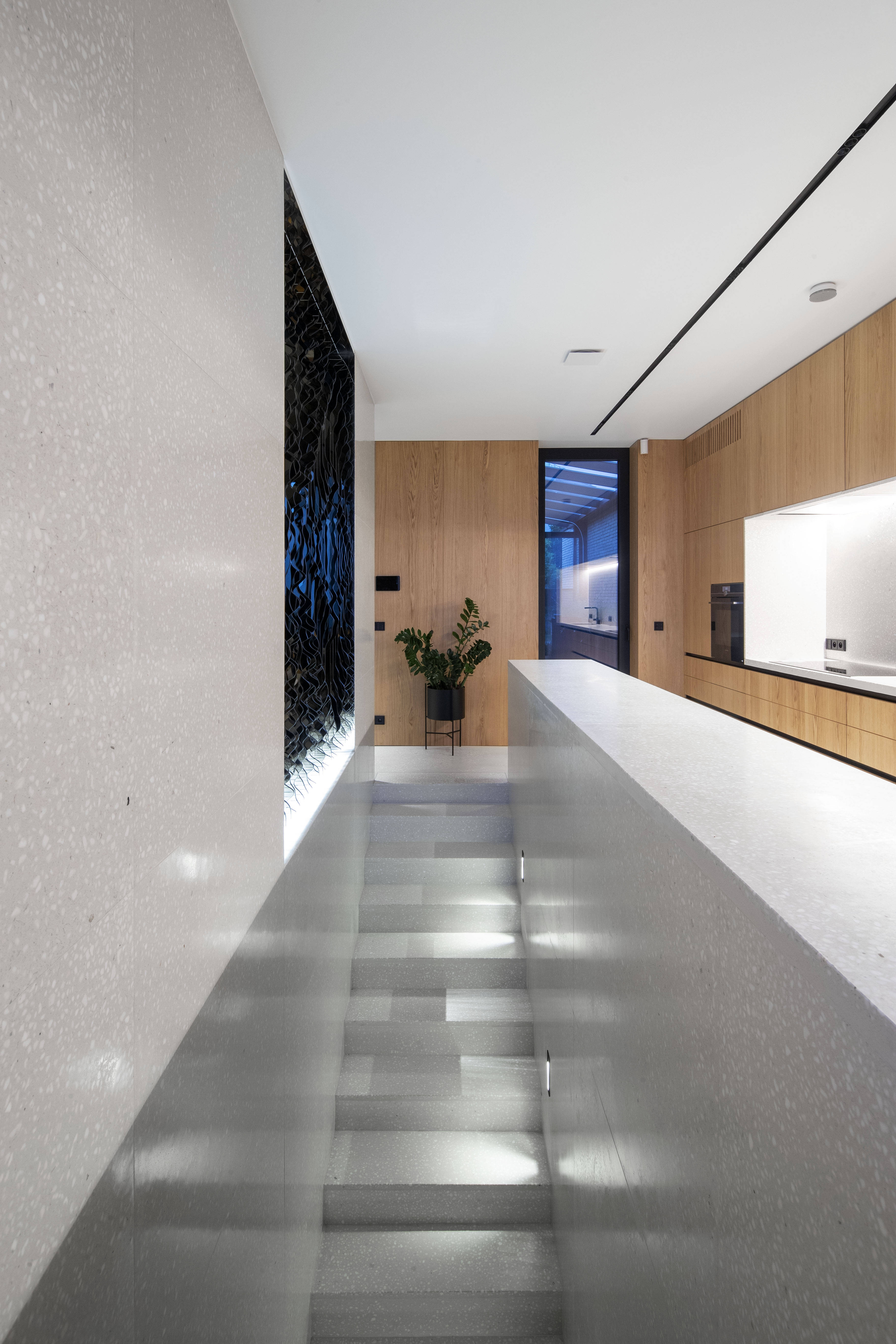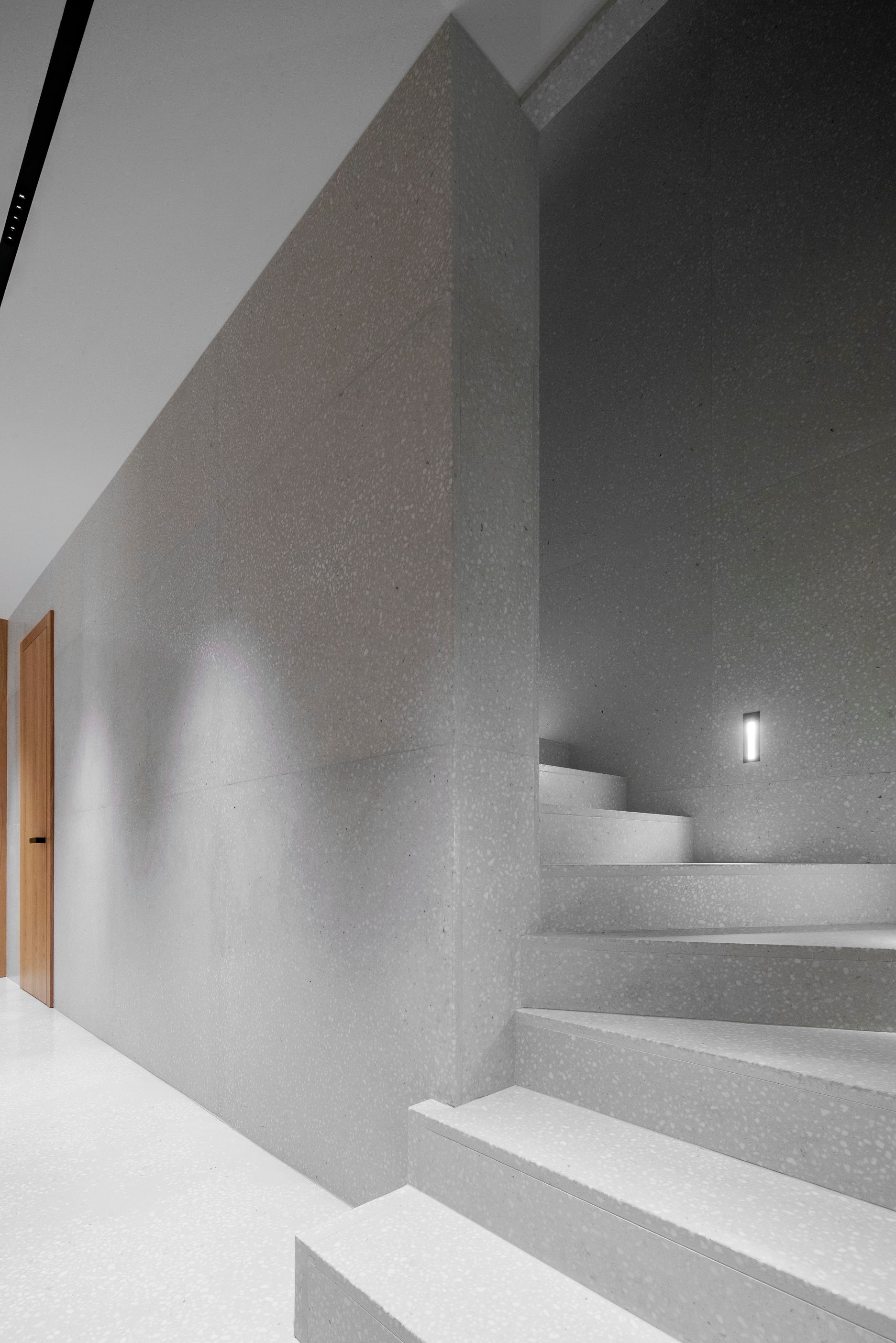 Charakter interiéru tvorí kombinácia na mieru vyrobeného terazza s bielym carrarskym mramorom a dreva. Terazzo je použité ako liata podlaha, na obklad stien, pochôdzna dlažba na terasách ako aj pre pracovné dosky v kuchyni a v kúpeľniach. Steny a podlahy tak prepája jednotný materiál. Použitý prírodný dub kontrastuje s chladnými povrchmi terazza.