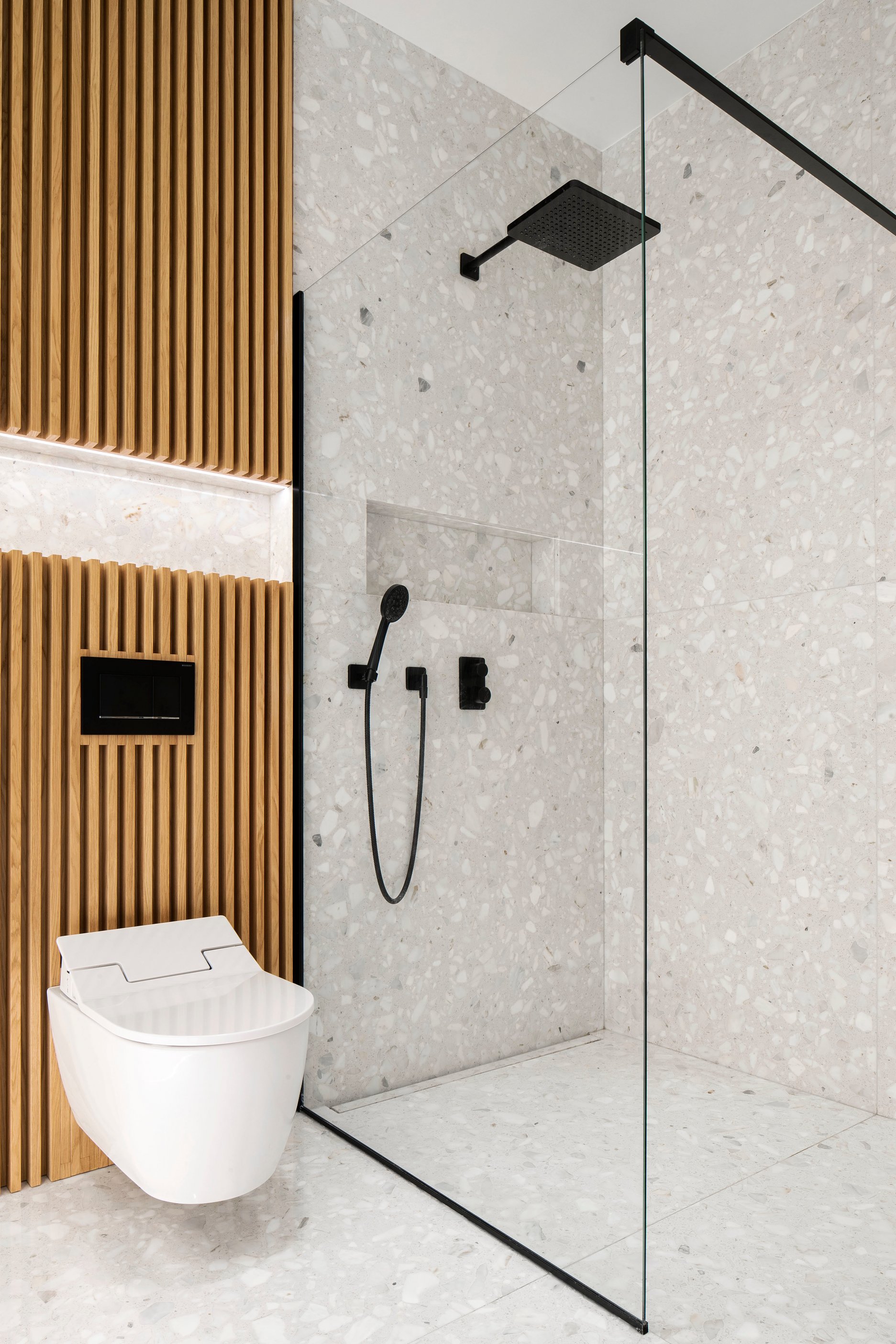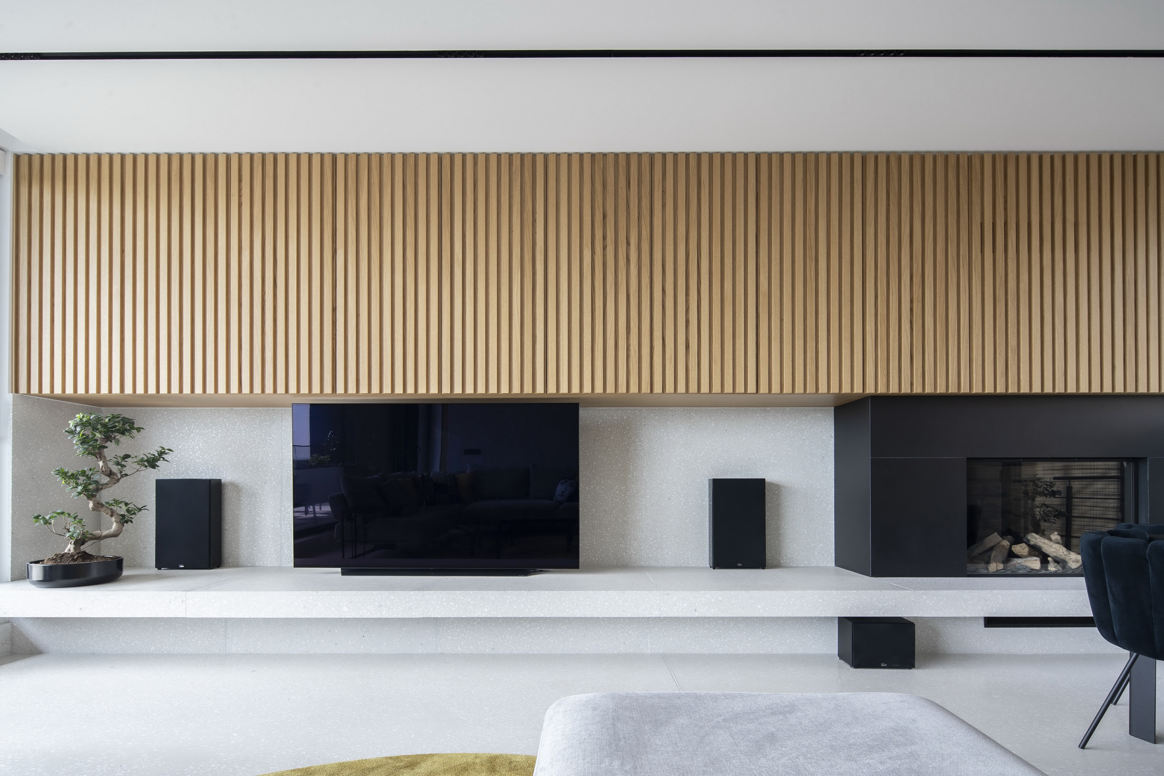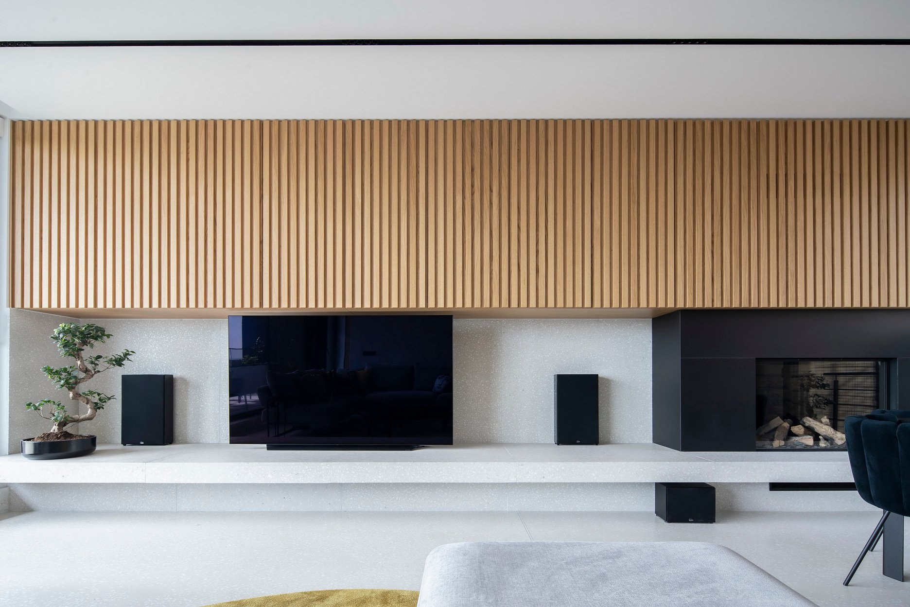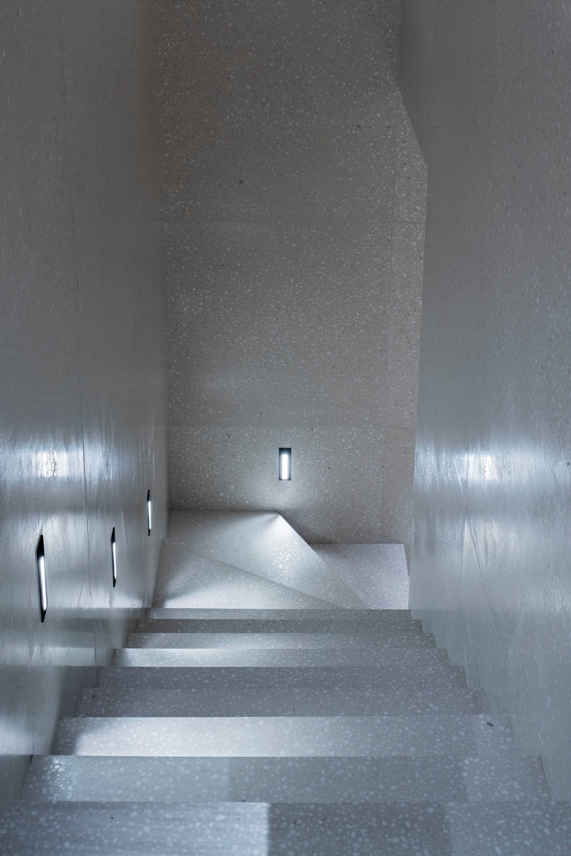 Charakter interiéru tvorí kombinácia na mieru vyrobeného terazza s bielym carrarskym mramorom a dreva. Terazzo je použité ako liata podlaha, na obklad stien, pochôdzna dlažba na terasách ako aj pre pracovné dosky v kuchyni a v kúpeľniach. Steny a podlahy tak prepája jednotný materiál. Použitý prírodný dub kontrastuje s chladnými povrchmi terazza.