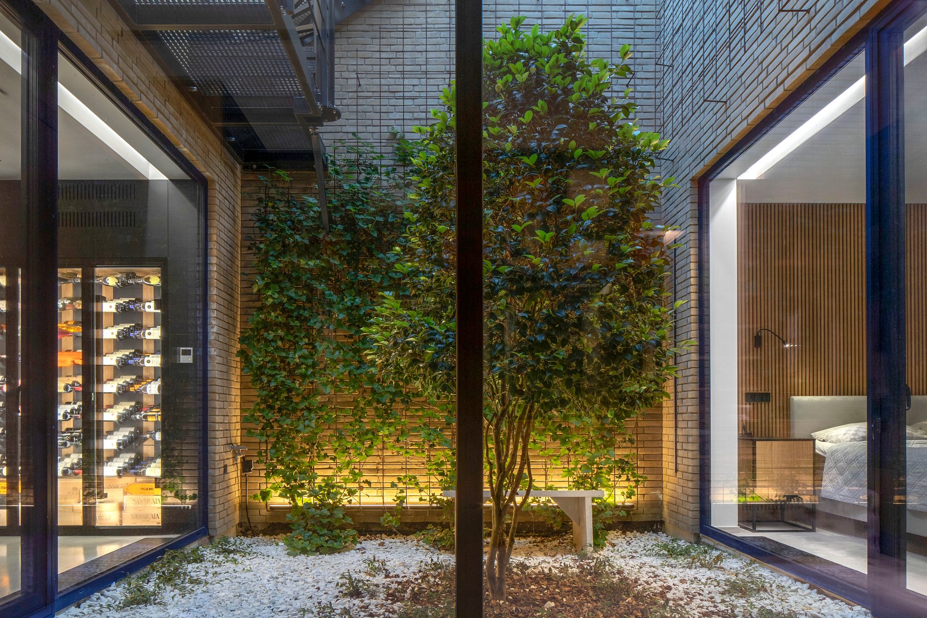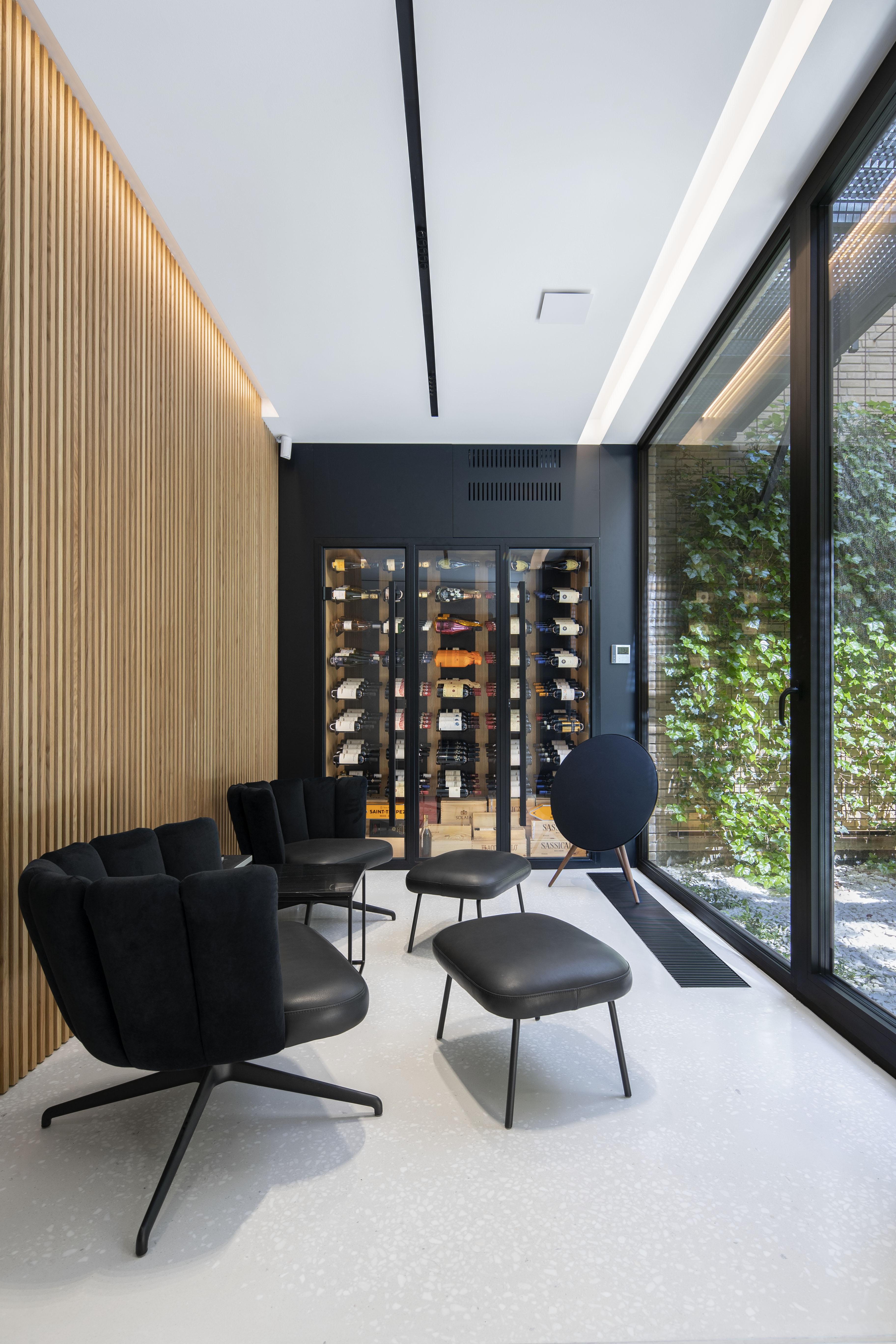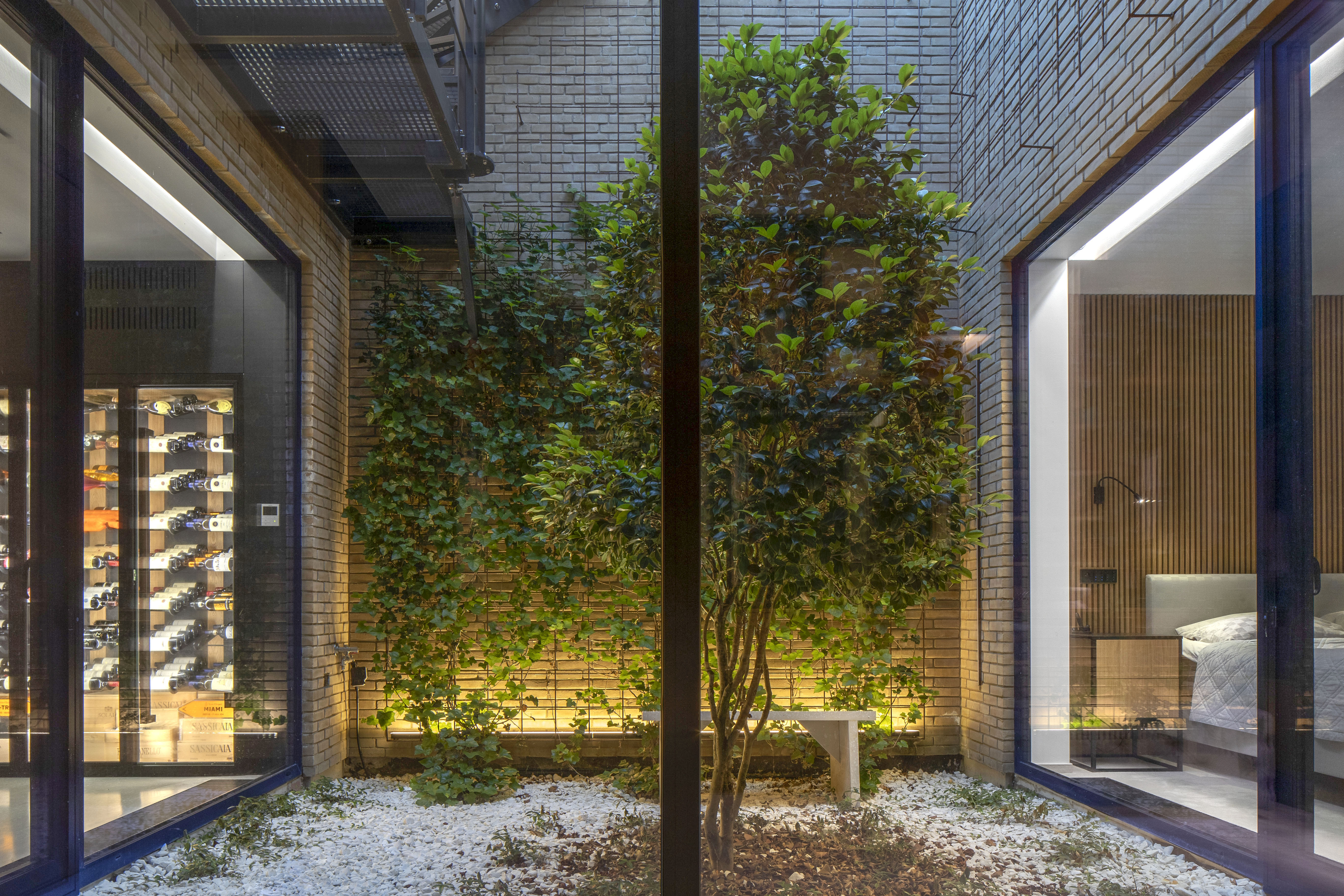 O poschodie nižšie sa nachádza nočná časť. Okolo átria sú usporiadané spálňa so šatníkom, kúpeľňa a vinotéka. Francúzske okná plynulo prepájajú priestory s exteriérom a opticky ich zväčšujú. Miestnosti zapustené do terénu majú príjemnú klímu, čo sa prejavilo najmä počas posledného horúceho leta. Naviac, sú izolované od hluku mesta.