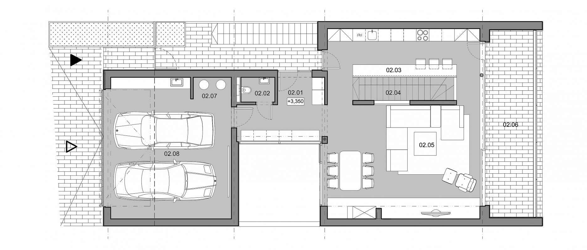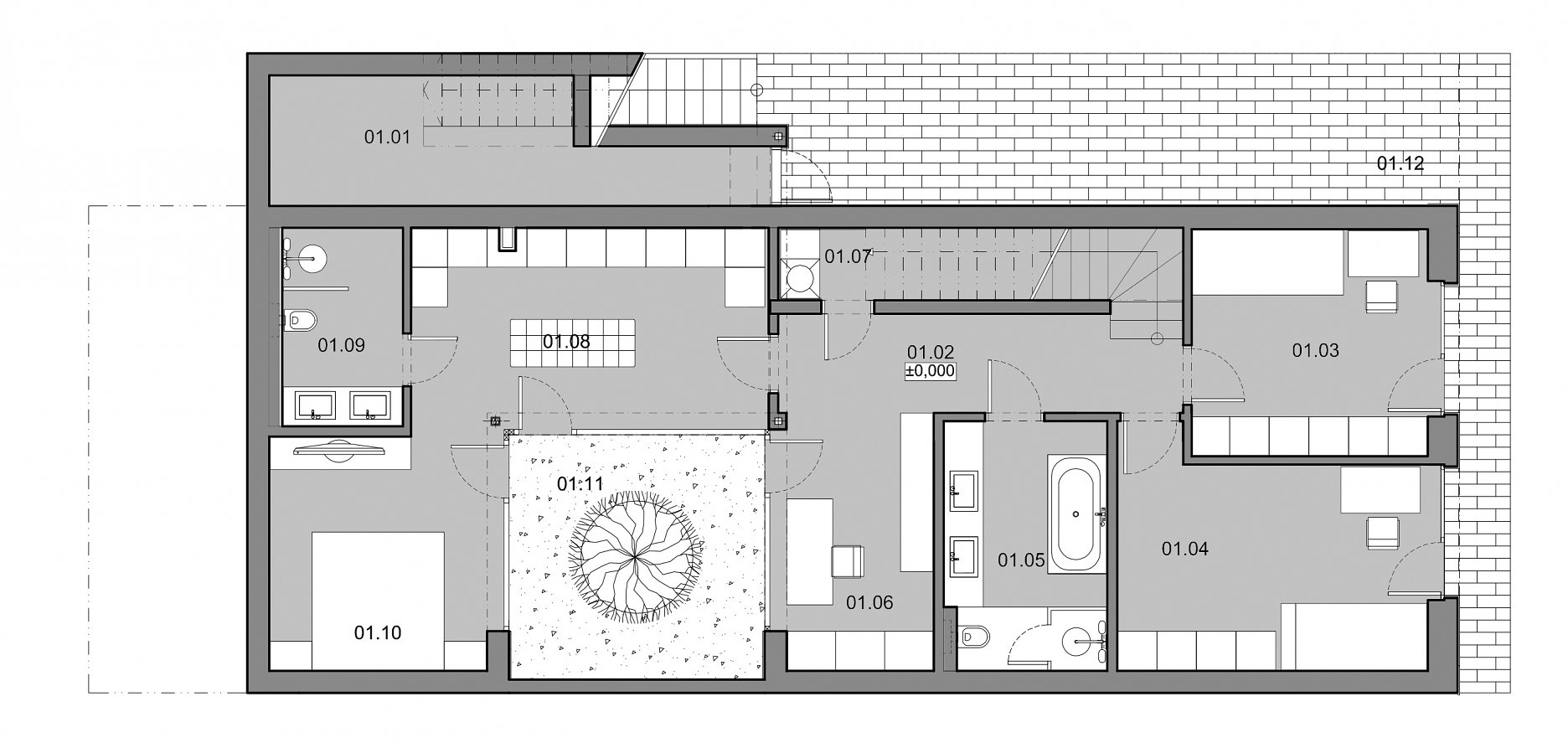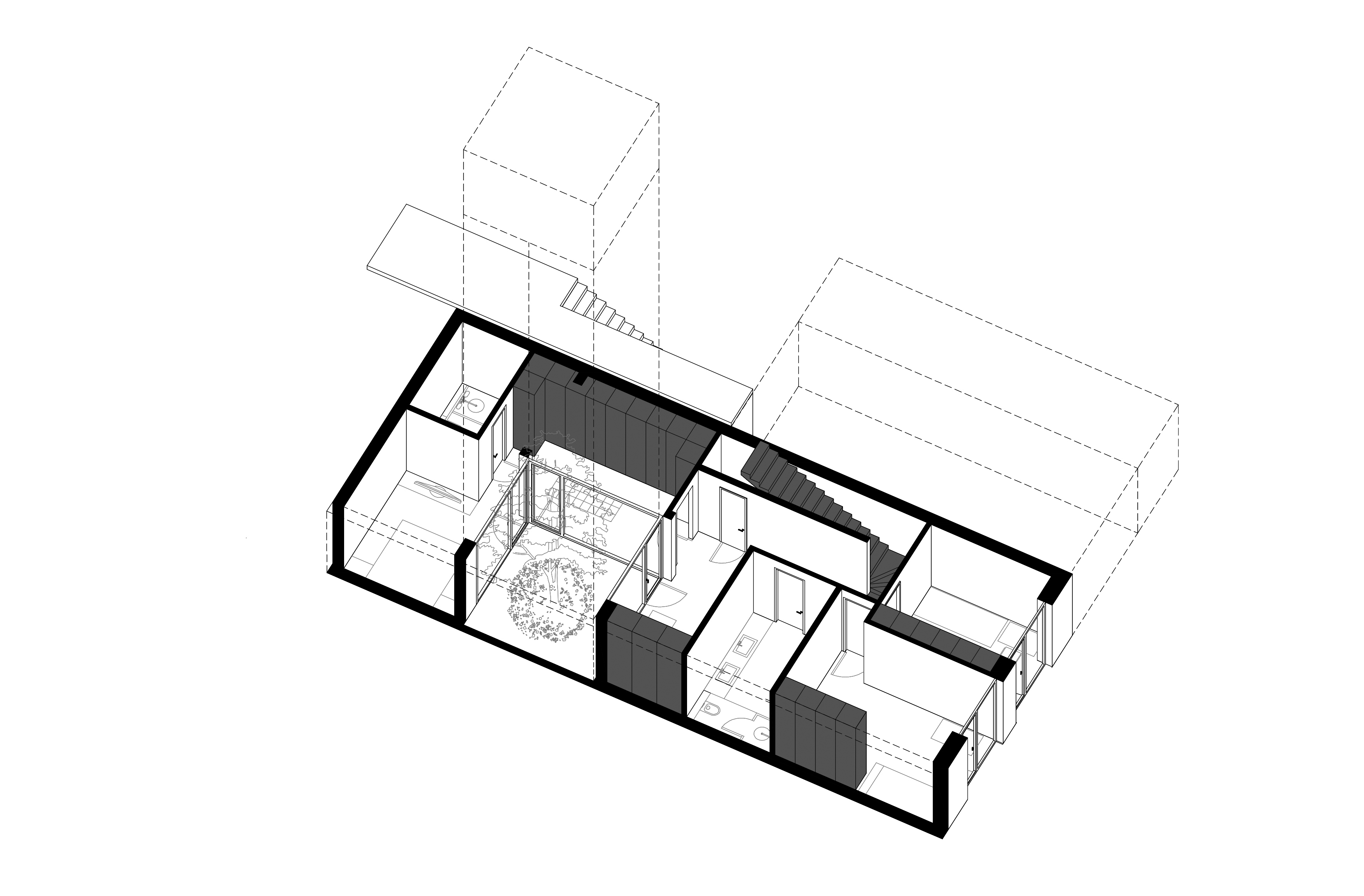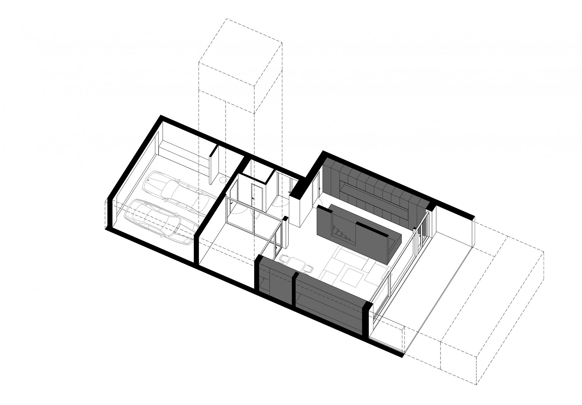 Do rodinného domu sa vchádza cez horné poschodie priamo z ulice, na ktorom je umiestená denná časť. V strede sa nachádza átrium, ktoré tvorí srdce domu. Vnáša svetlo do vstupnej haly a jedálne - zároveň poskytuje možnosť priečneho vetrania.