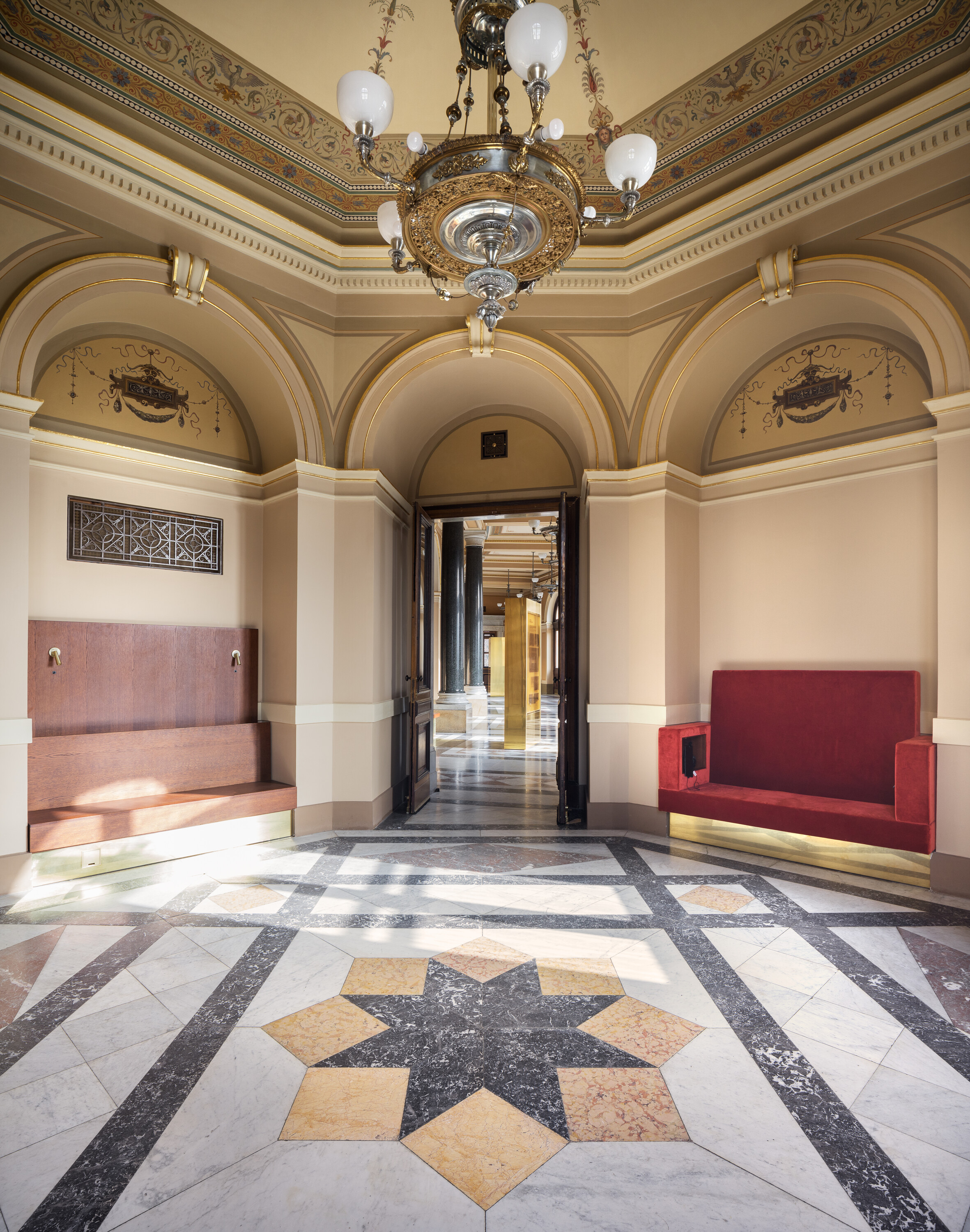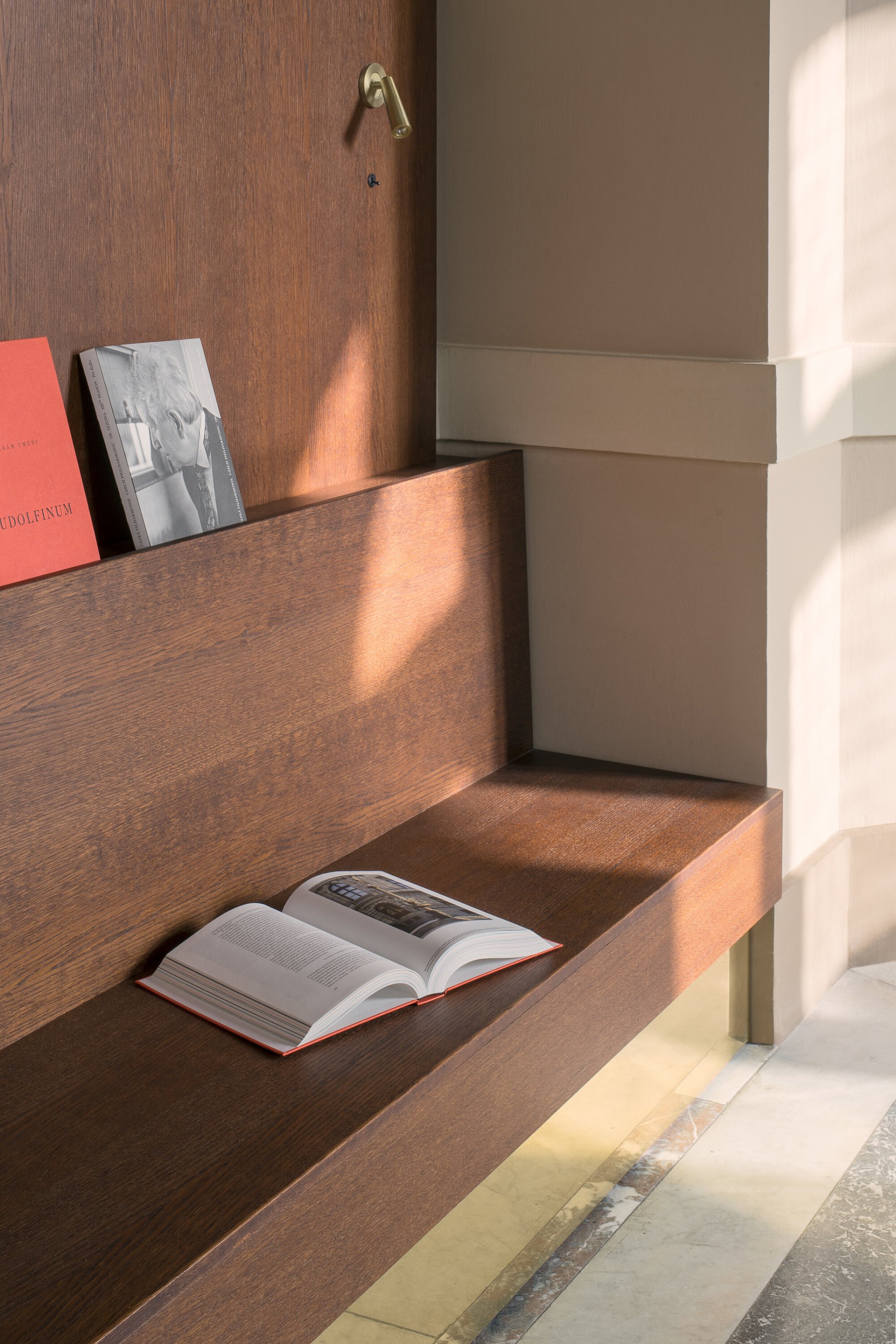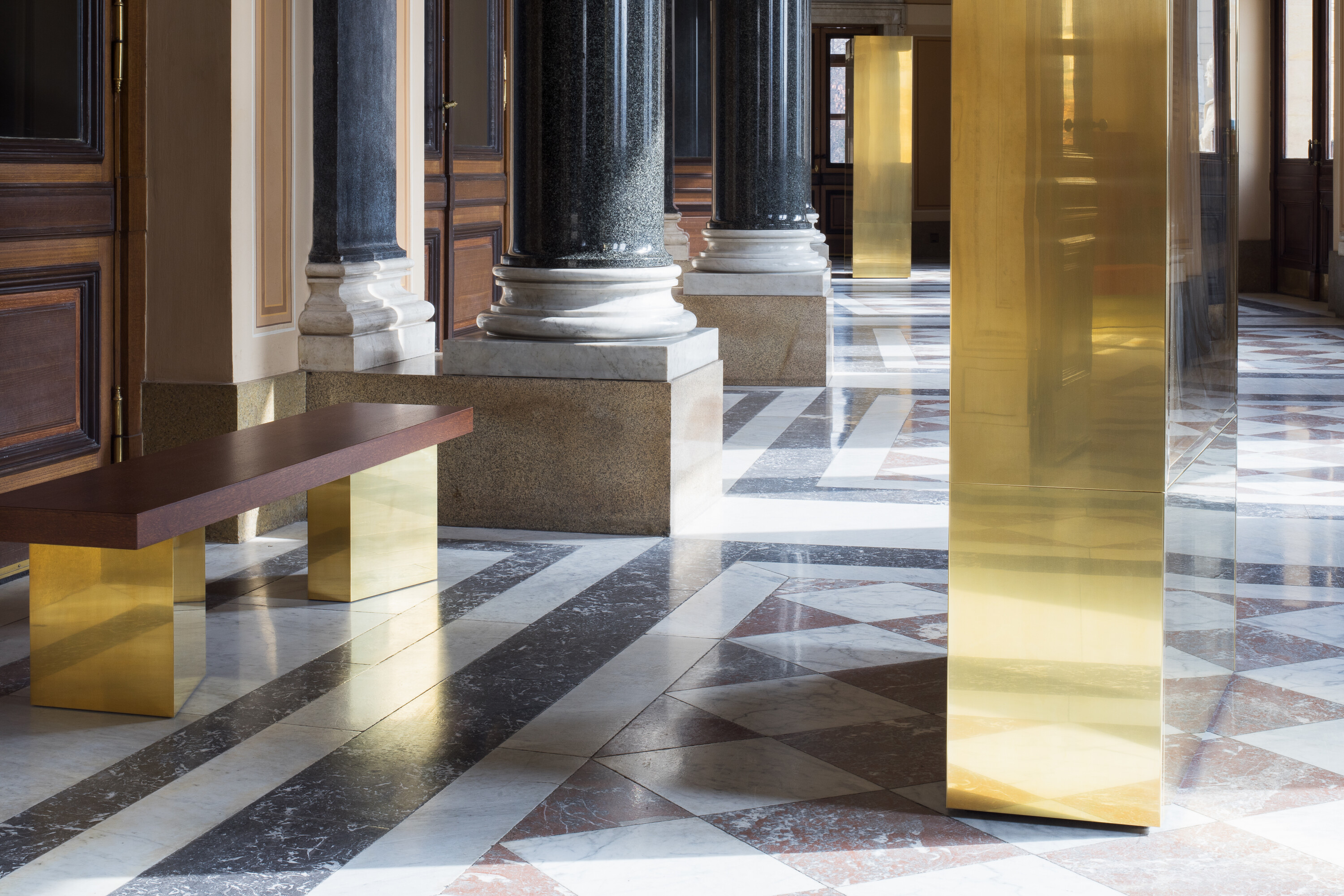 “Náš návrh pro interiér předsálí Dvořákovy síně v Rudolfinu vznikal s respektem k původní architektuře budovy i k nadčasové hodnotě a důstojnosti České filharmonie. Záměrem bylo daný historický prostor vizuálně nepřebíjet ale spíše akcentovat, zároveň doplnit o nové využití uceleně, funkčně a současně. Tomu pomáhá efekt zrcadlení a volba materiálů, které se už nějak v budově vyskytují – primárně leštěná mosaz a tmavá dřevěná dýha. Tvarování nových prvků vychází z půdorysu řešených prostor a navazuje na ornamenty v původní kamenné podlaze,” vysvetľuje svoj zámer architektka Lenka Míková.