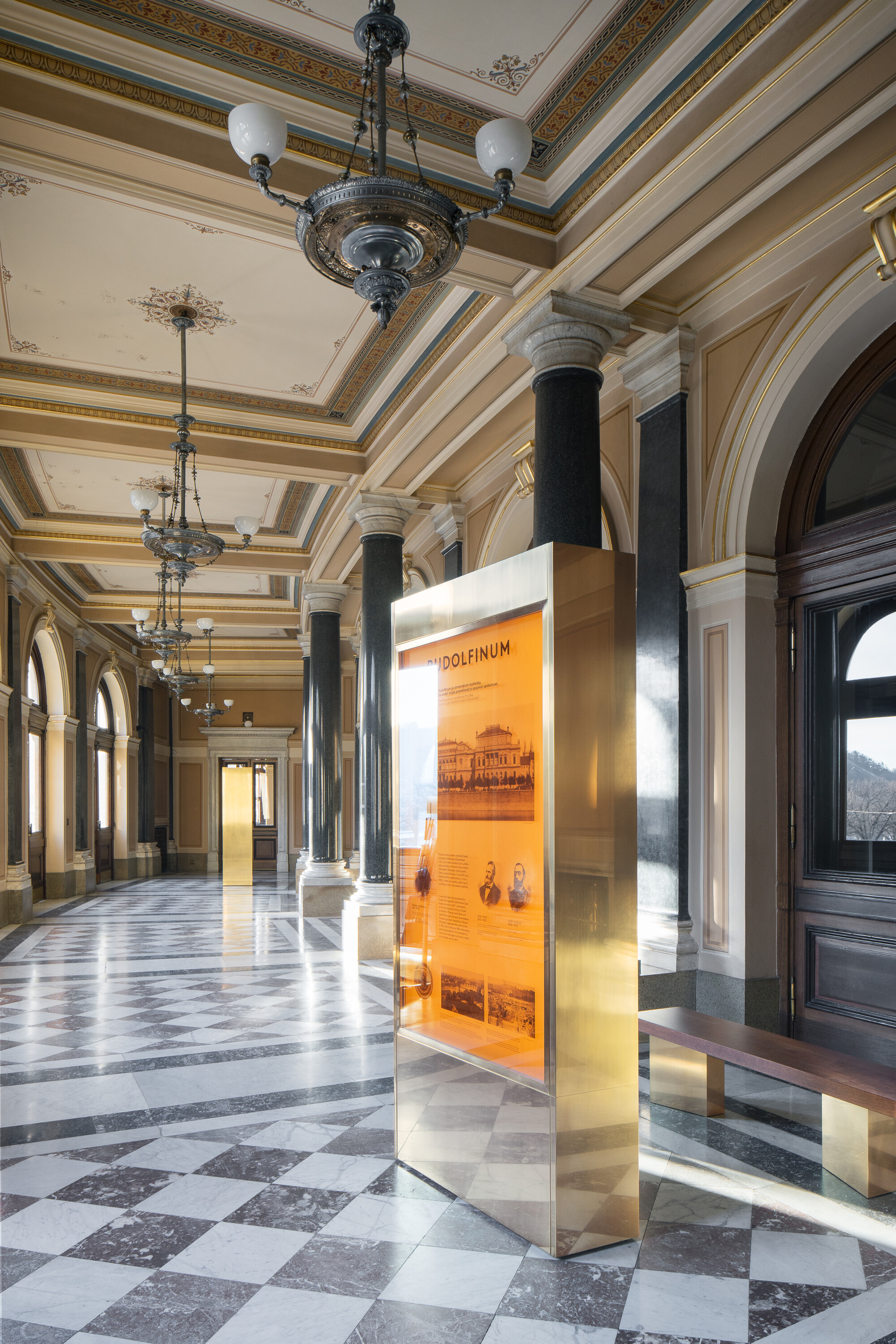 Obsah výstavy nesú podsvietené panely na dlhších stranách panelov, kryté zlatistým reflexným sklom. Historické fotografie a texty vystupujú z hĺbky panelu v niekoľkých vrstvách. “Naším záměrem bylo vytvořit svébytné objekty se vztahem k prostoru, ne pouhé nosiče informací. Na koncepci expozice spolupracovala designérka Miroko Maroko, která měla na starosti kompletní grafické řešení výstavy,” vysvetľuje autorka. Foyer dopĺňajú drevené lavičky s mosadzným soklom.