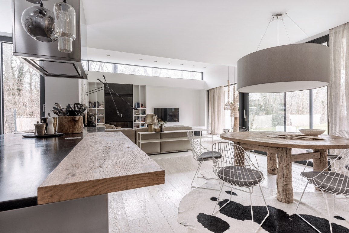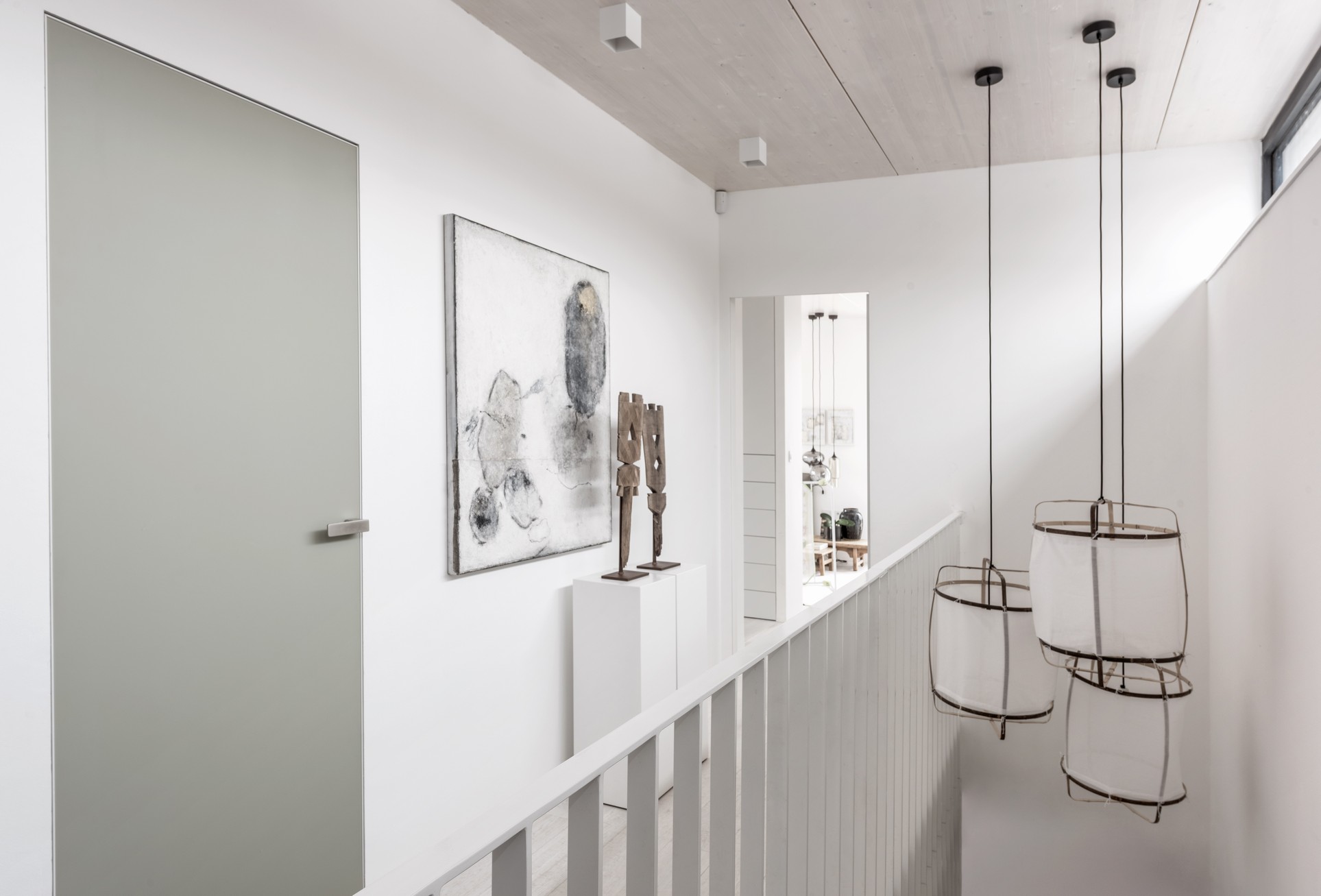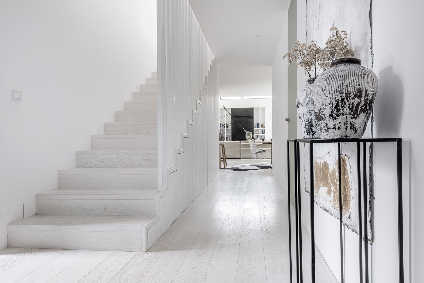 Strohá geometria s pravouhlými líniami nábytku a biele priestorové štruktúry prebiehajúce interiérom zjednocujú obytný priestor domu. Súčasne tiež umožňujú vytvoriť čisté odkladacie priestory pre predmety každodennej potreby.