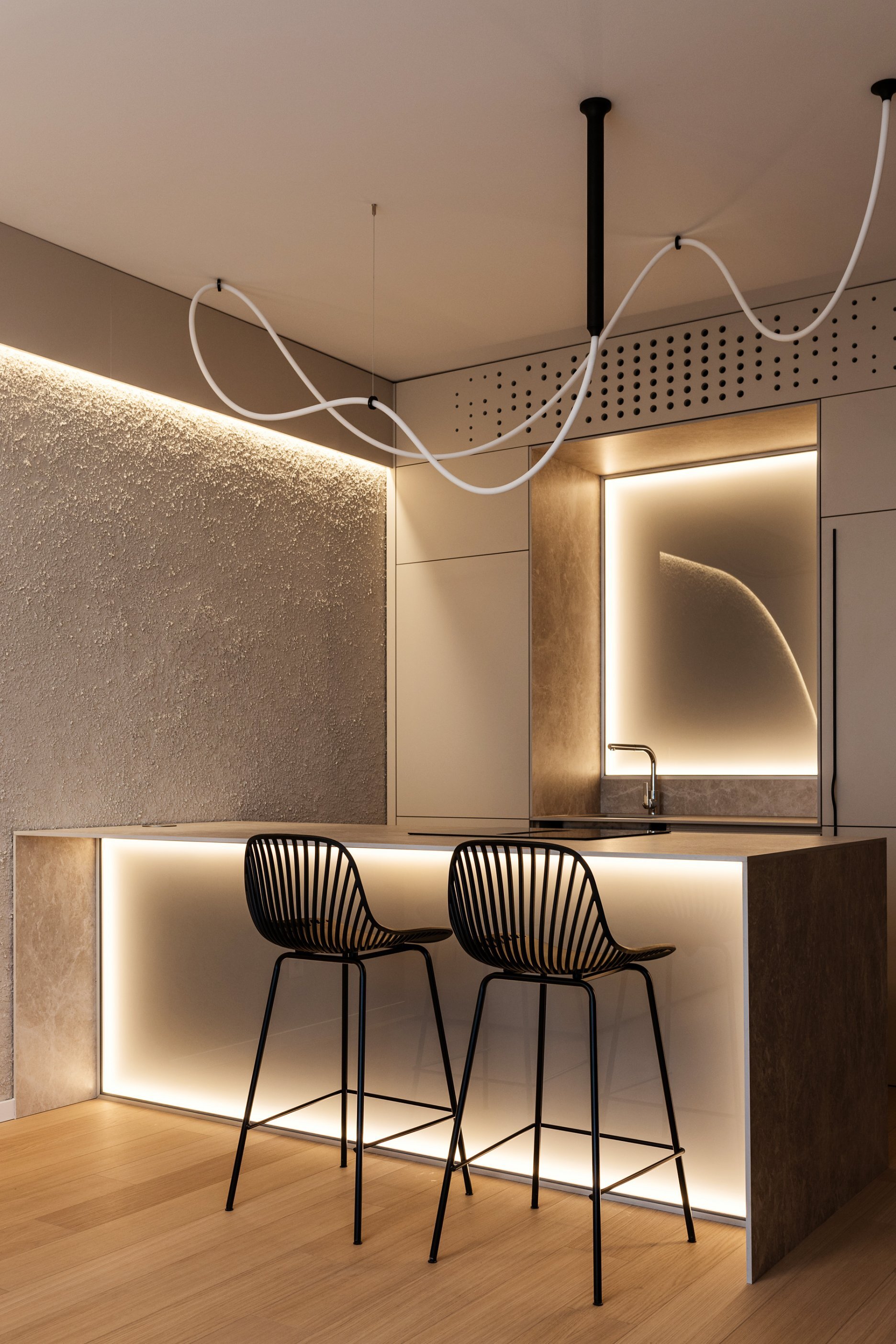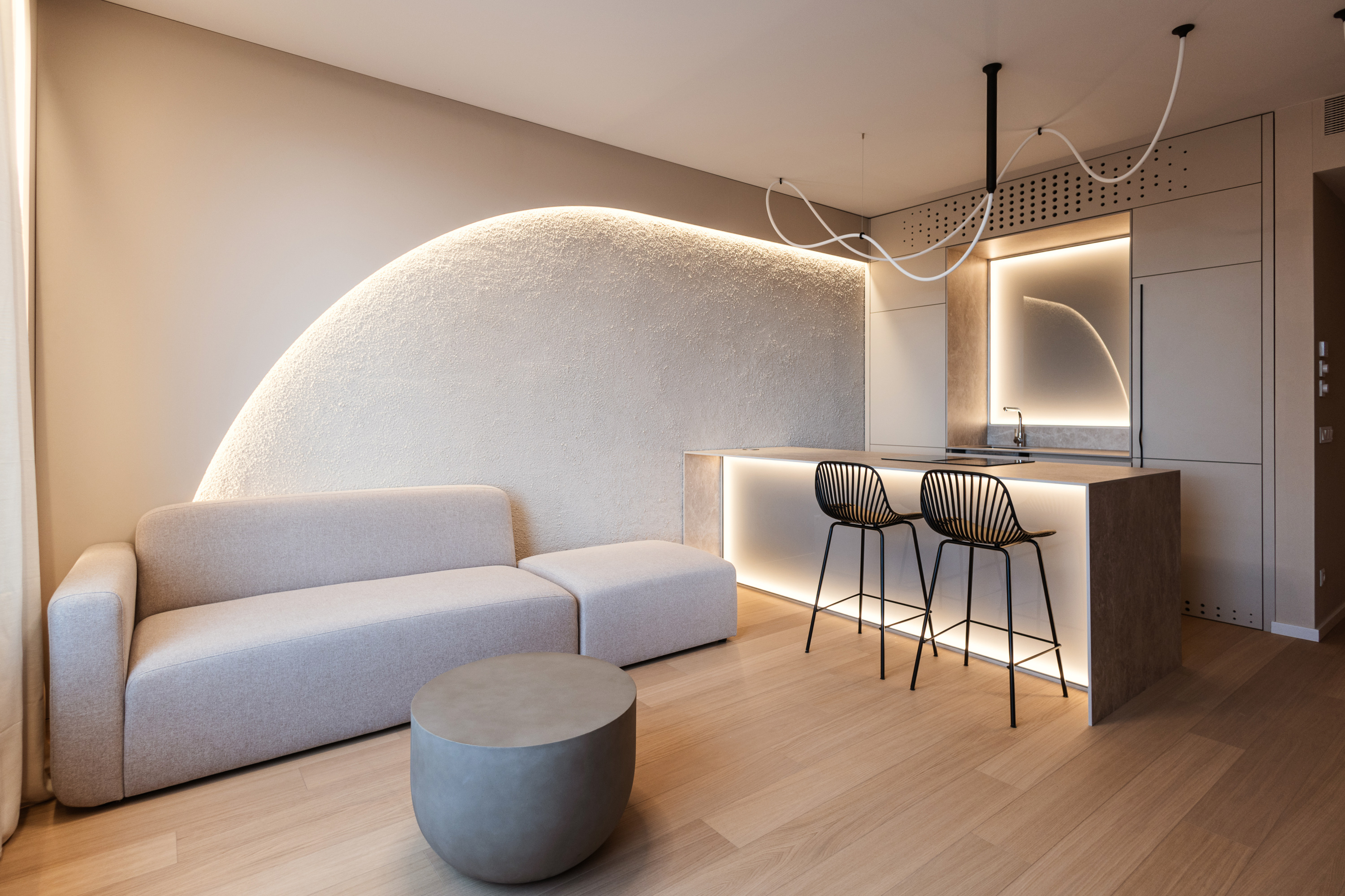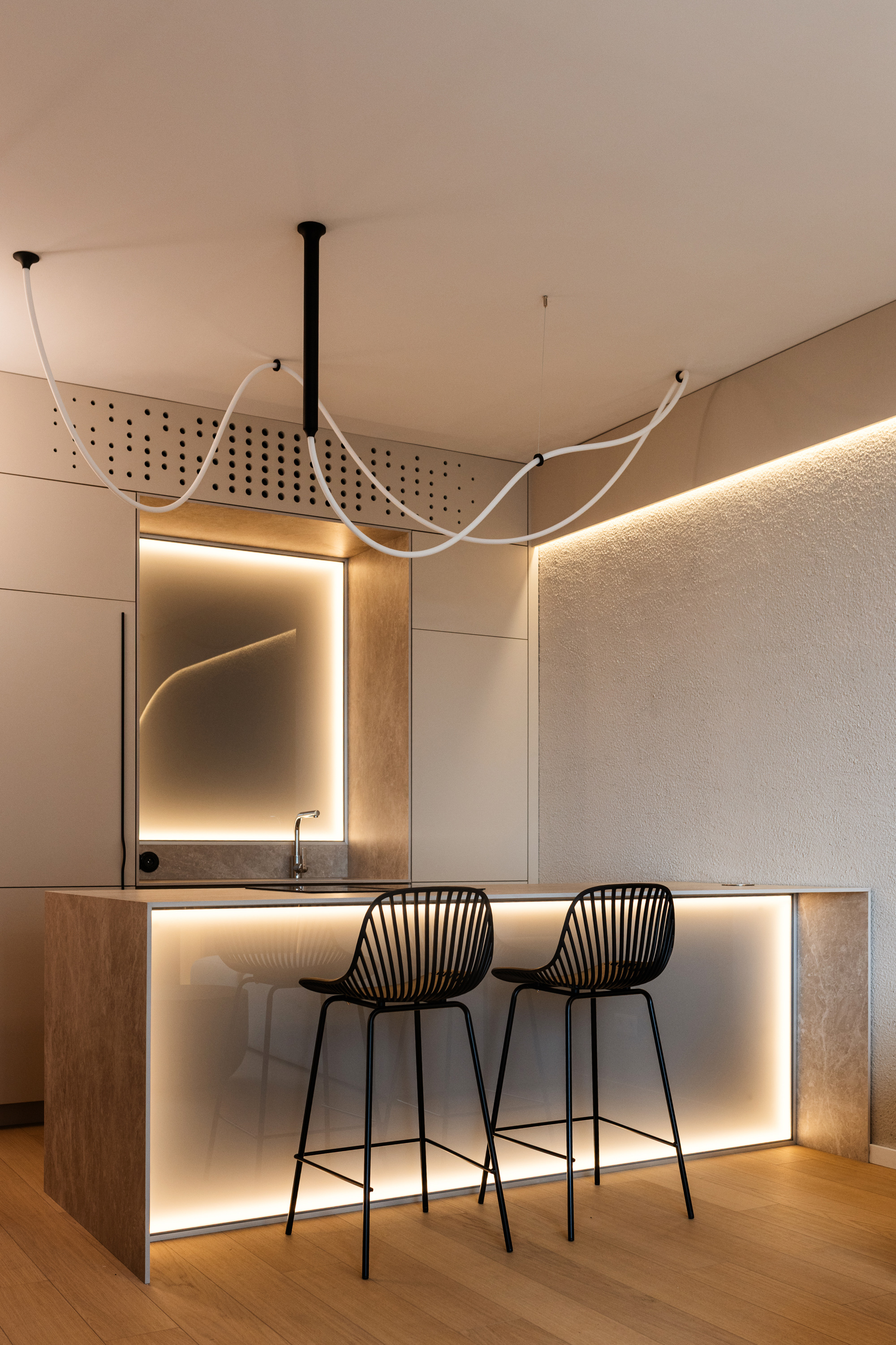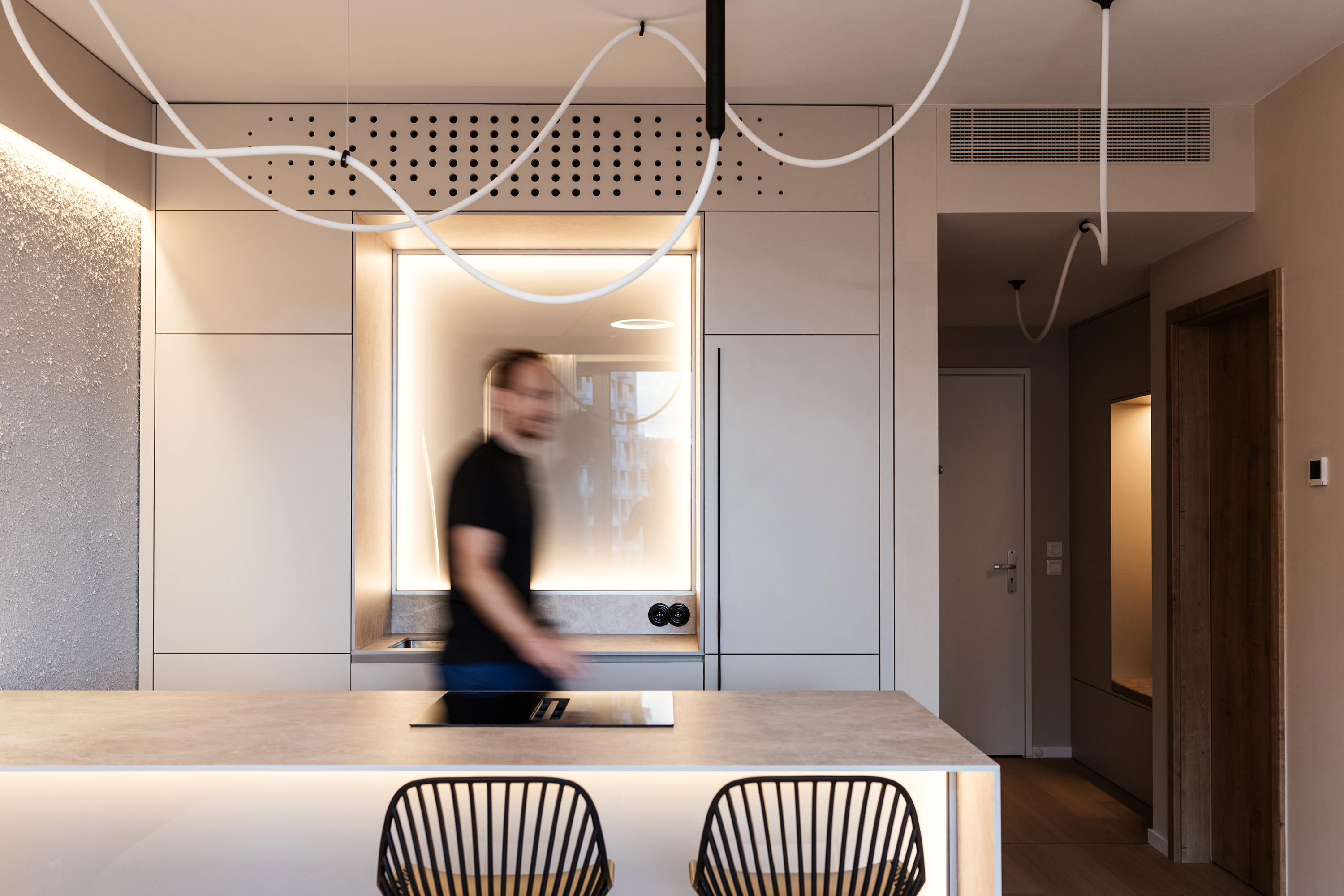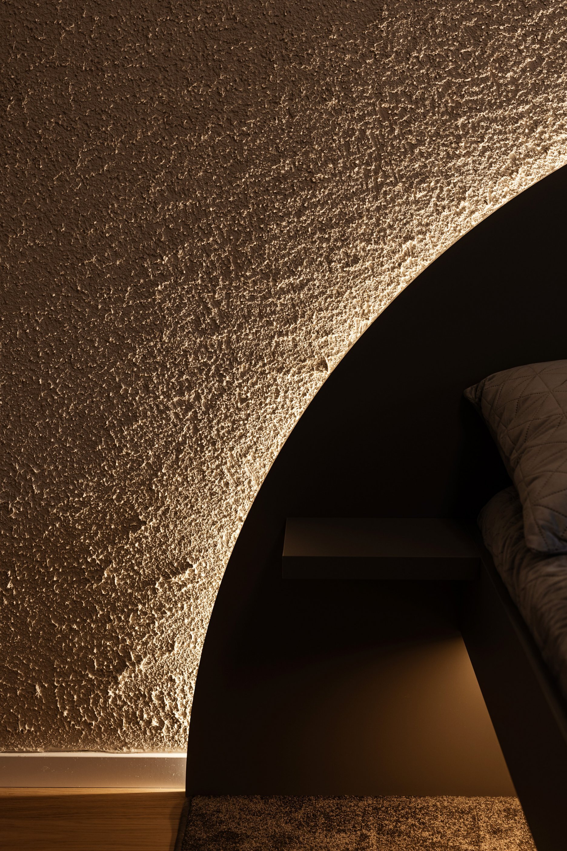 Steny s hrubozrnnou omietkou za sedačkou a záhlavím postele sú nasvietené spoza obkladov, čo zvýrazňuje ich štruktúru. Sivé dymové sklo v nike kuchyne a baru je podsvietené po obvode. Kombináciou týchto prvkov možno v interiéri navodiť rôzne svetelné atmosféry podľa aktuálnej nálady alebo potreby.