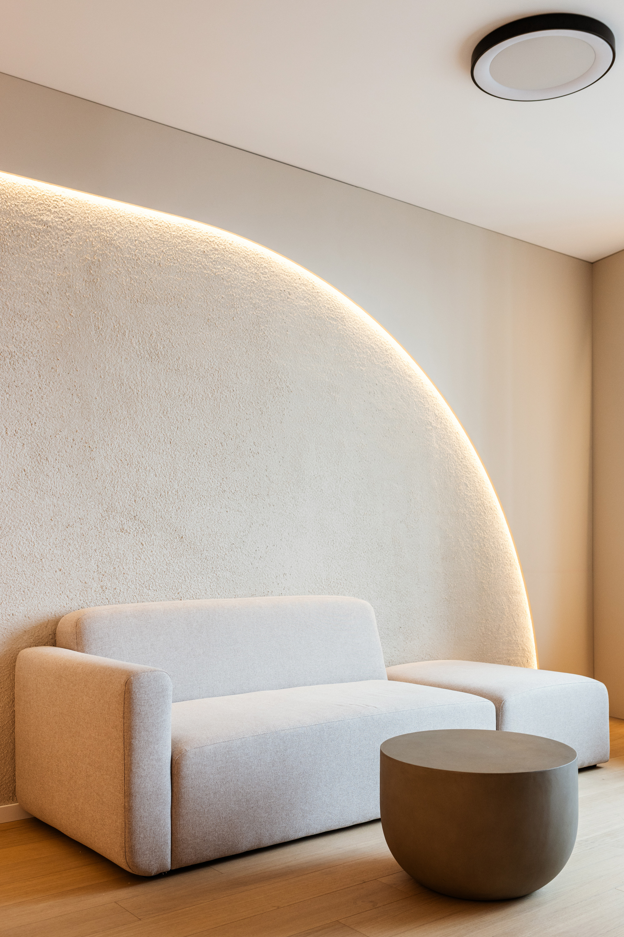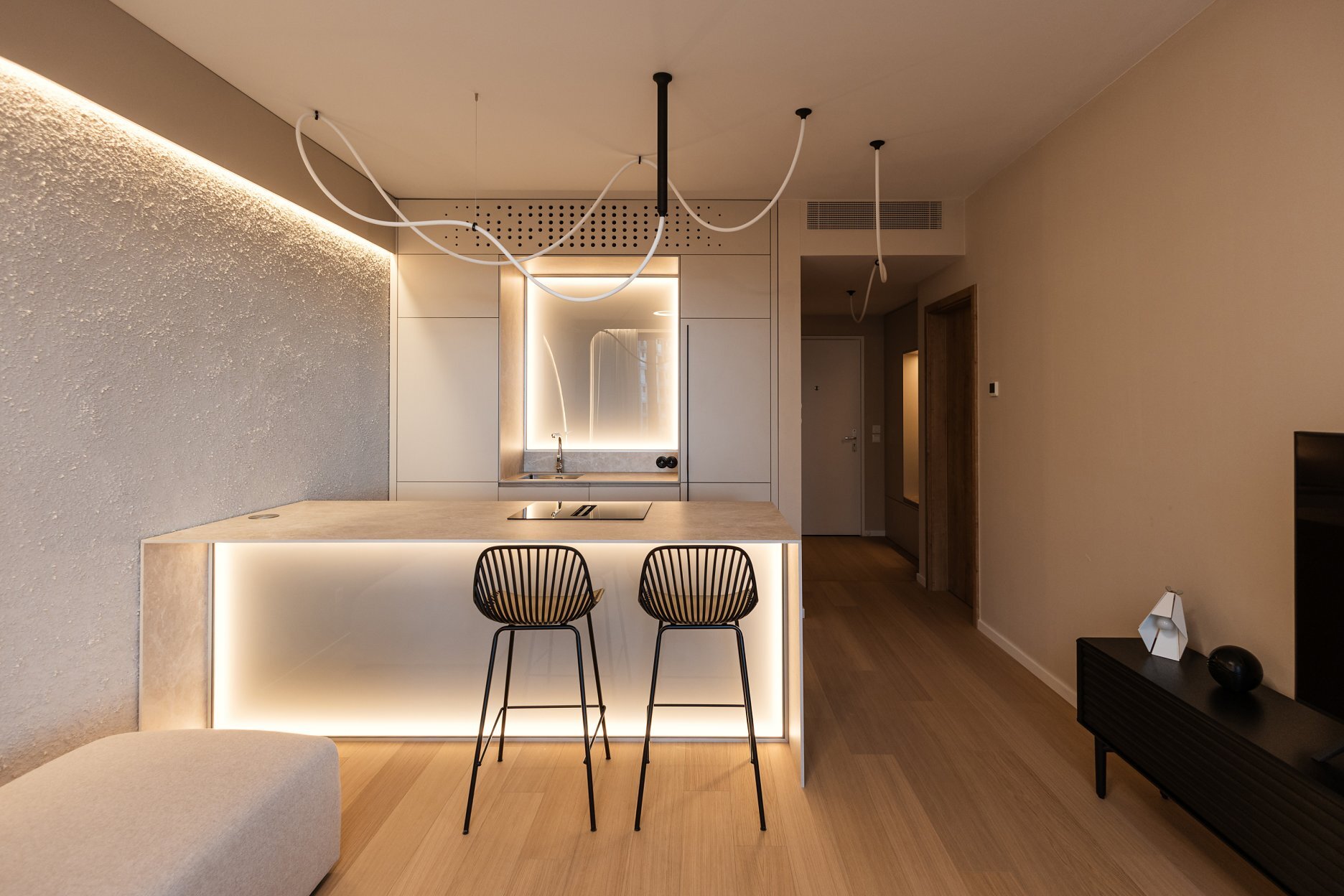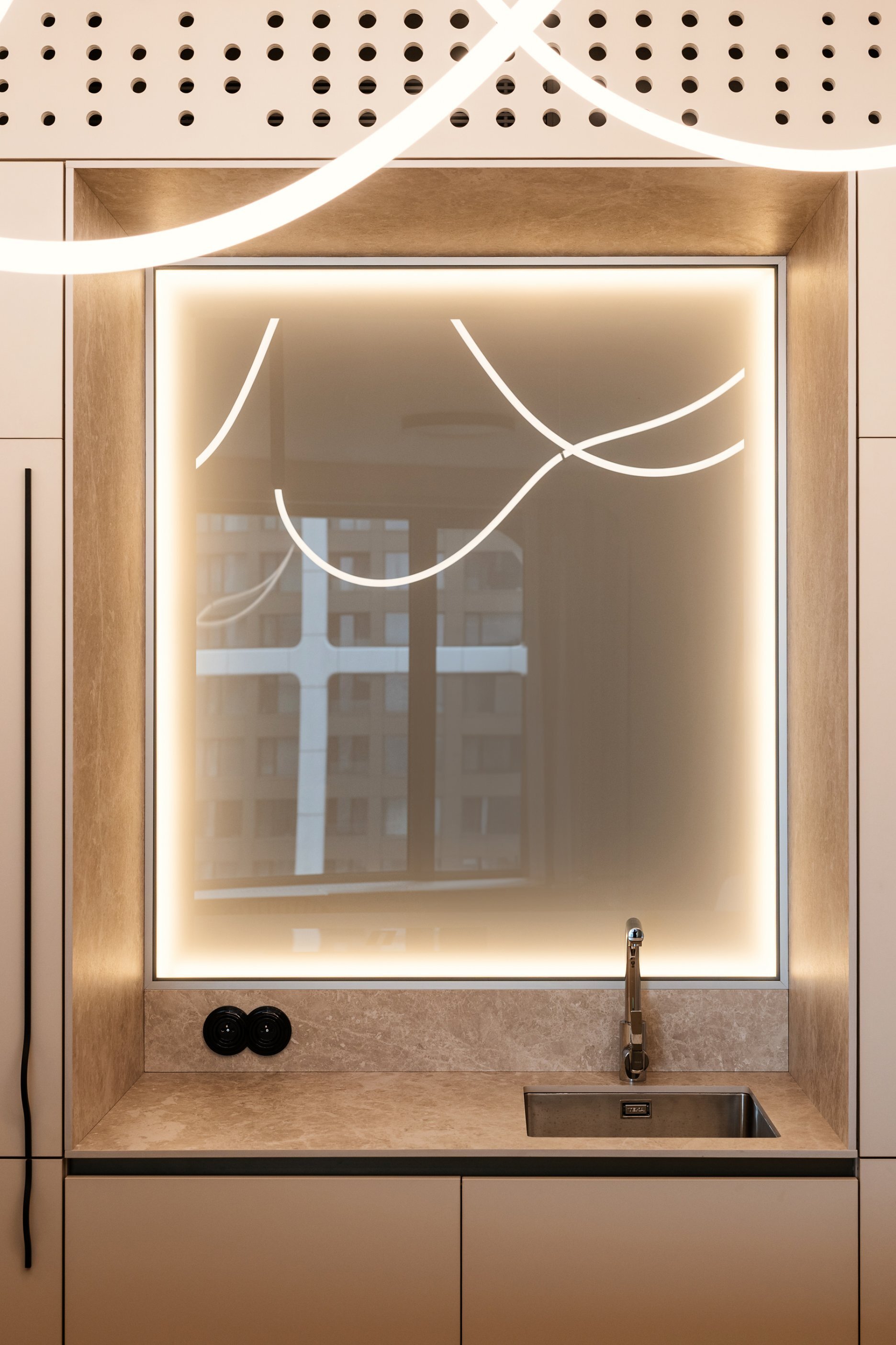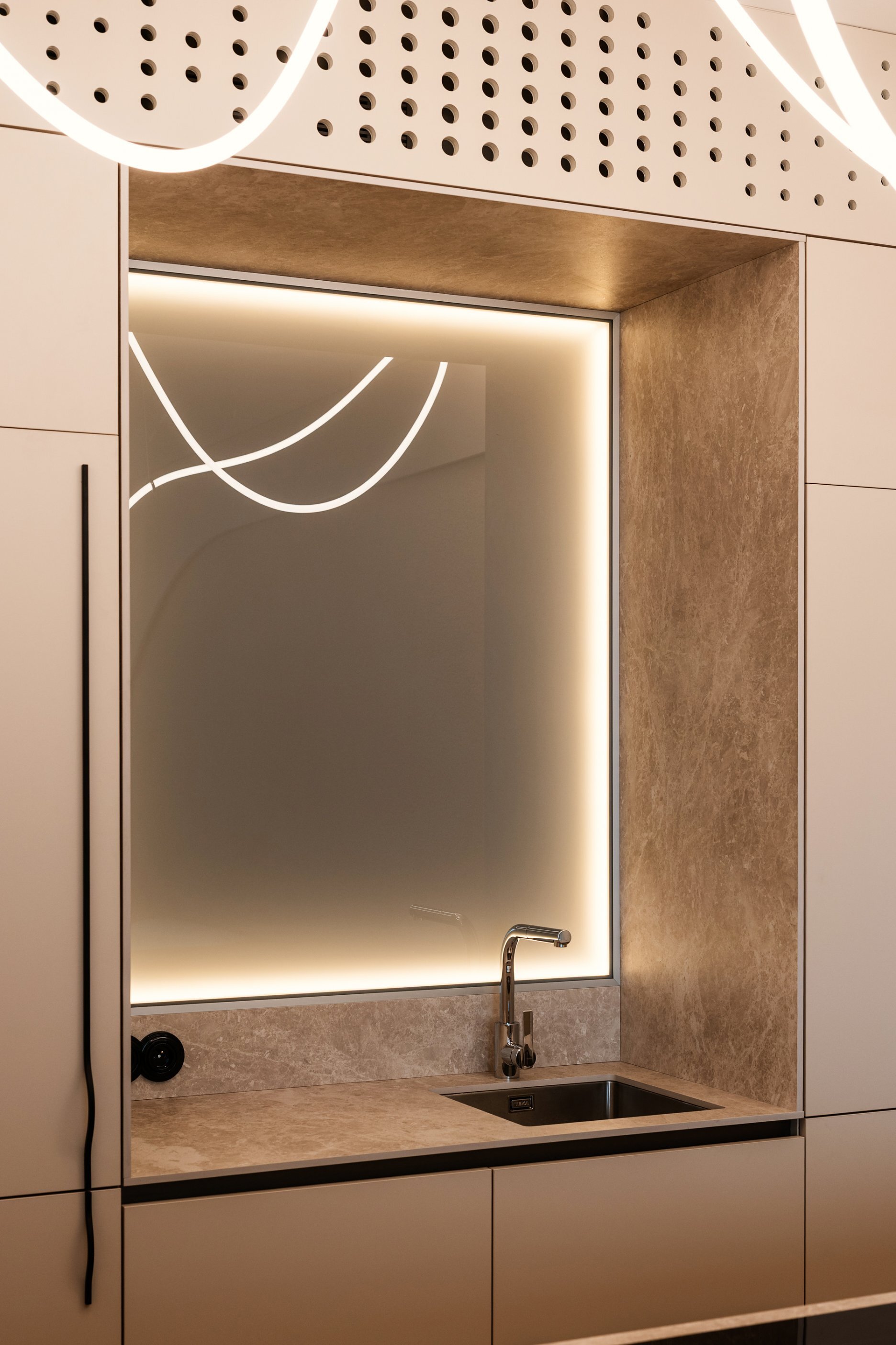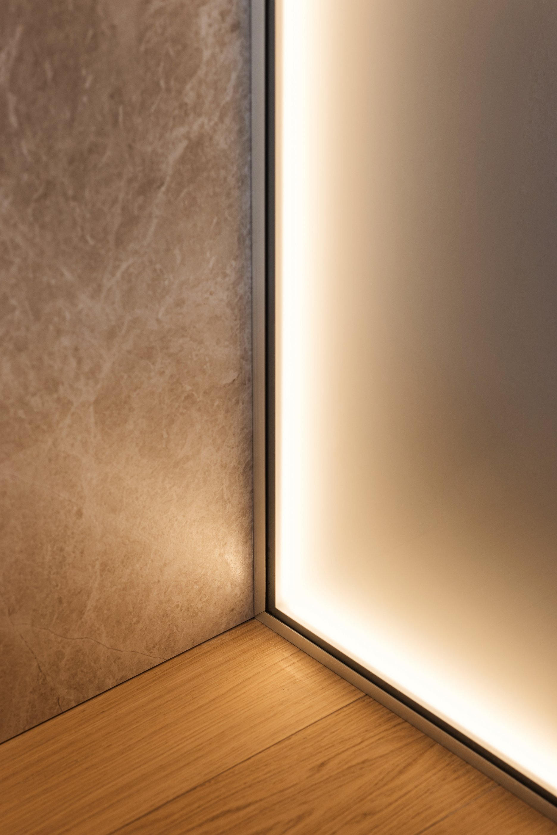 Steny s hrubozrnnou omietkou za sedačkou a záhlavím postele sú nasvietené spoza obkladov, čo zvýrazňuje ich štruktúru. Sivé dymové sklo v nike kuchyne a baru je podsvietené po obvode. Kombináciou týchto prvkov možno v interiéri navodiť rôzne svetelné atmosféry podľa aktuálnej nálady alebo potreby.