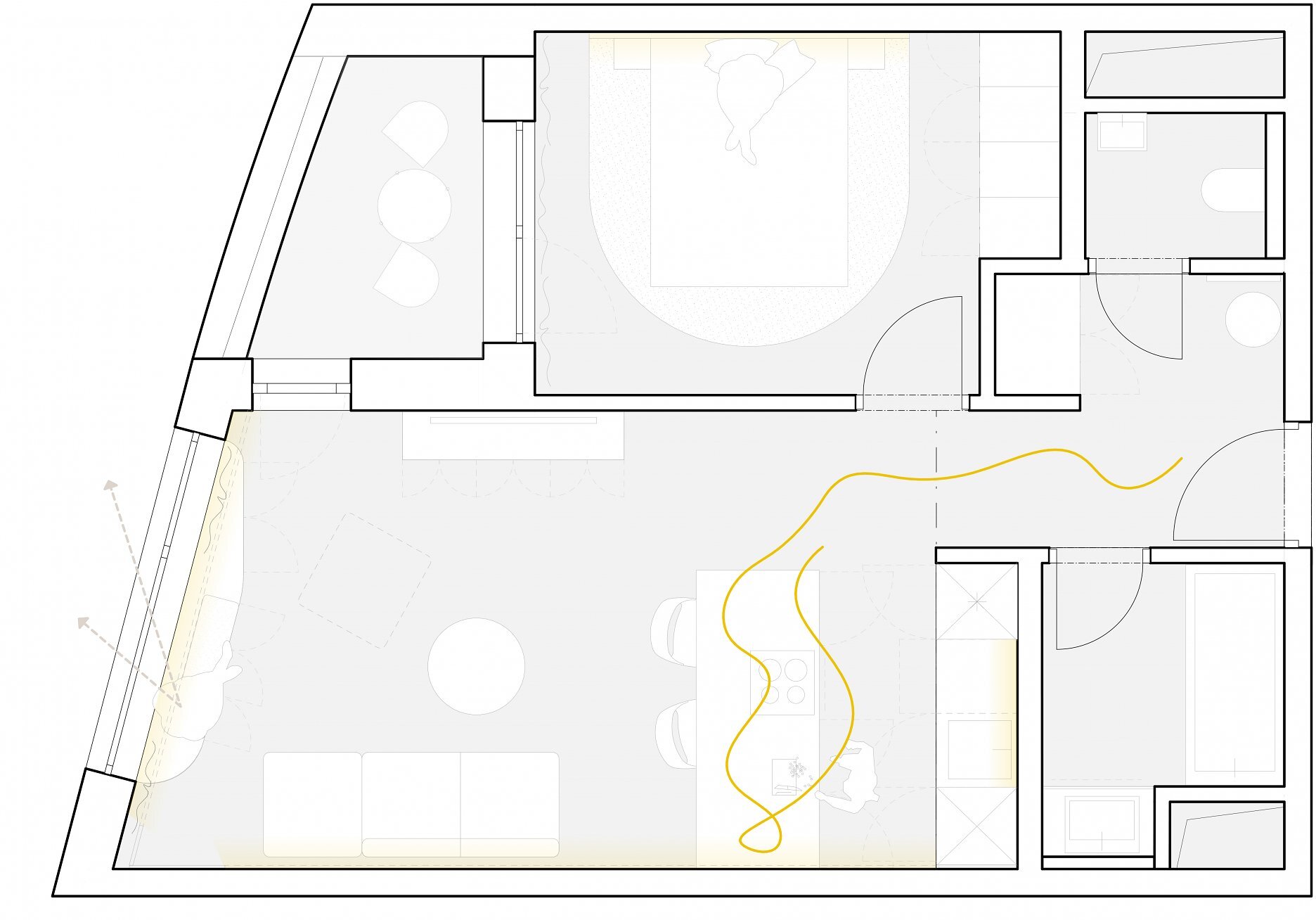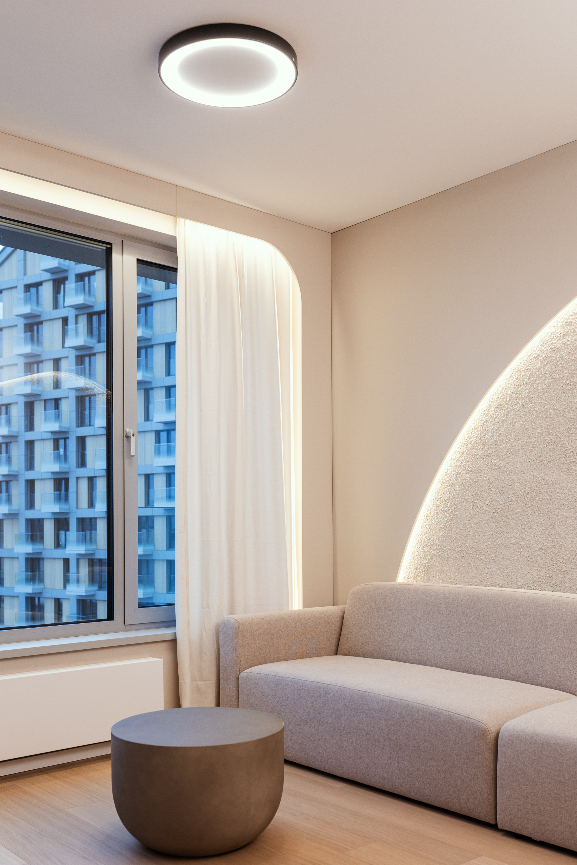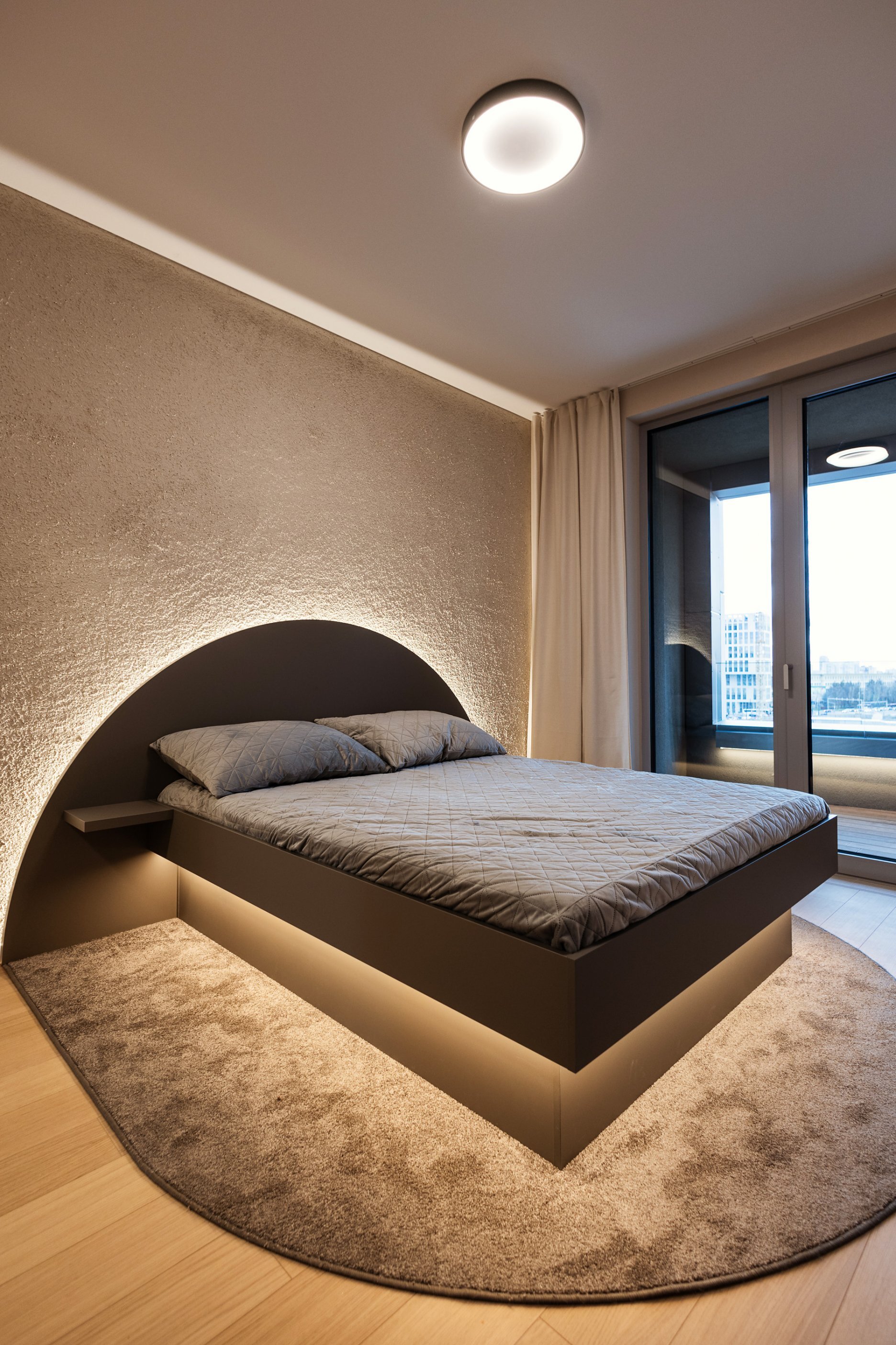 Moduly sedačky v obývačke je možné flexibilne presúvať podľa aktuálnej potreby. V spálni dominuje posteľ s polkruhovým záhlavím, ktoré plynule, farebne aj tvarovo, prechádza do koberca na podlahe a vytvára jednotný geometrický prvok.