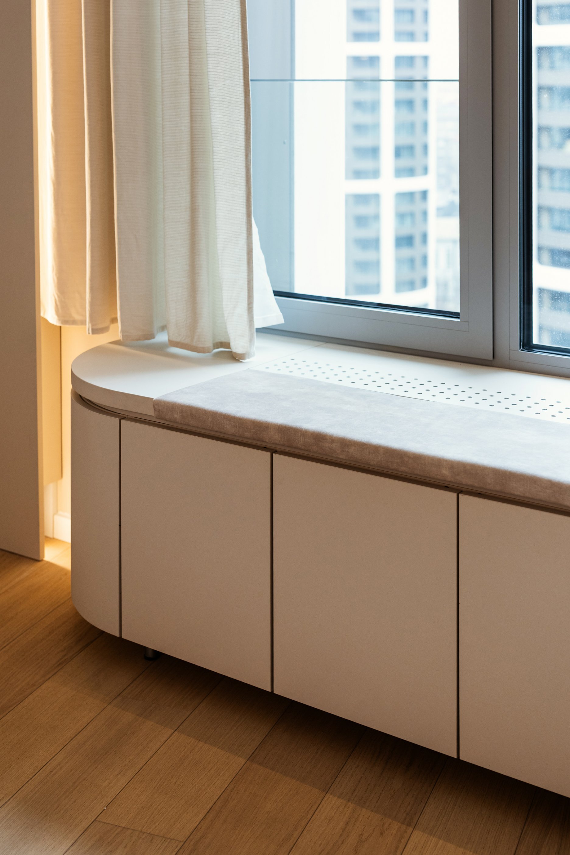 Najväčšou prednosťou klasického dvojizbového bytu je výhľad. Ten sme sa rozhodli podporiť umiestnením varnej dosky na kuchynský ostrov tak, aby pohľad počas varenia a prípravy jedál smeroval do obývačky a zároveň von do exteriéru. S rovnakým zámerom sme navrhli aj sedací prvok pri okne, ktorý ponúka nielen výhľad, ale aj úložný priestor a zároveň zakrýva radiátor. Kuchynský ostrov s pultovým sedením funkčne nahrádza jedálenský stôl.