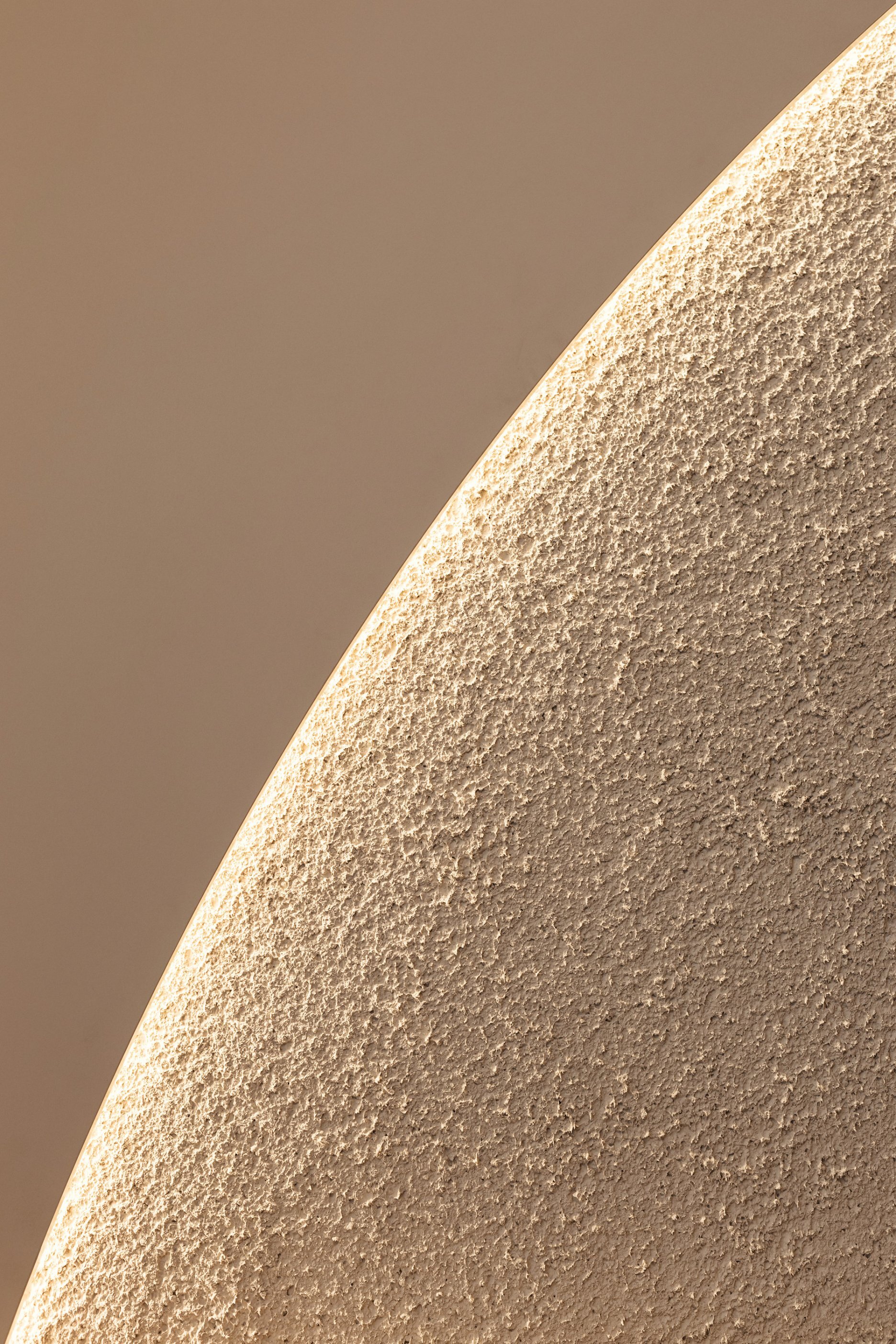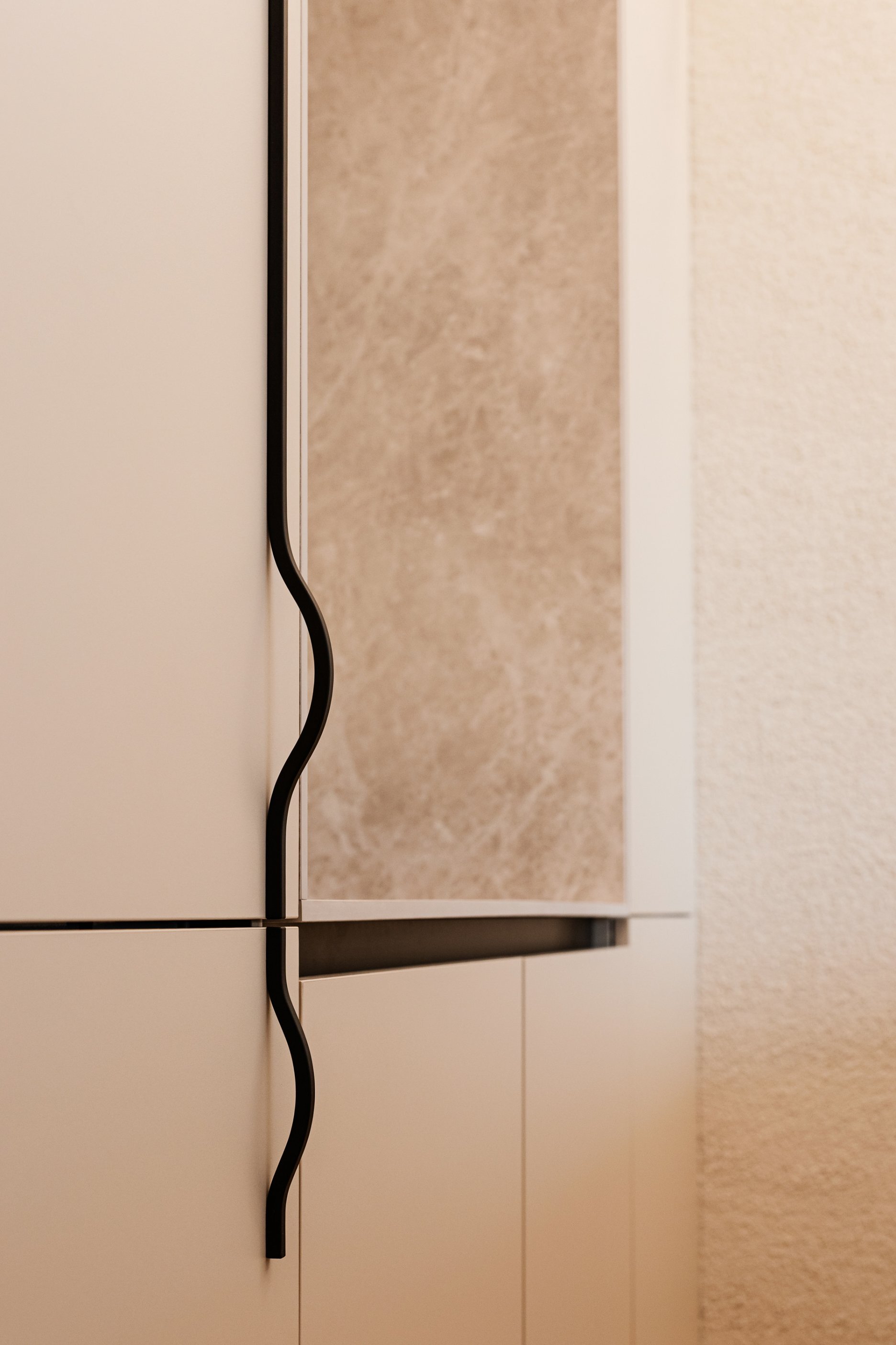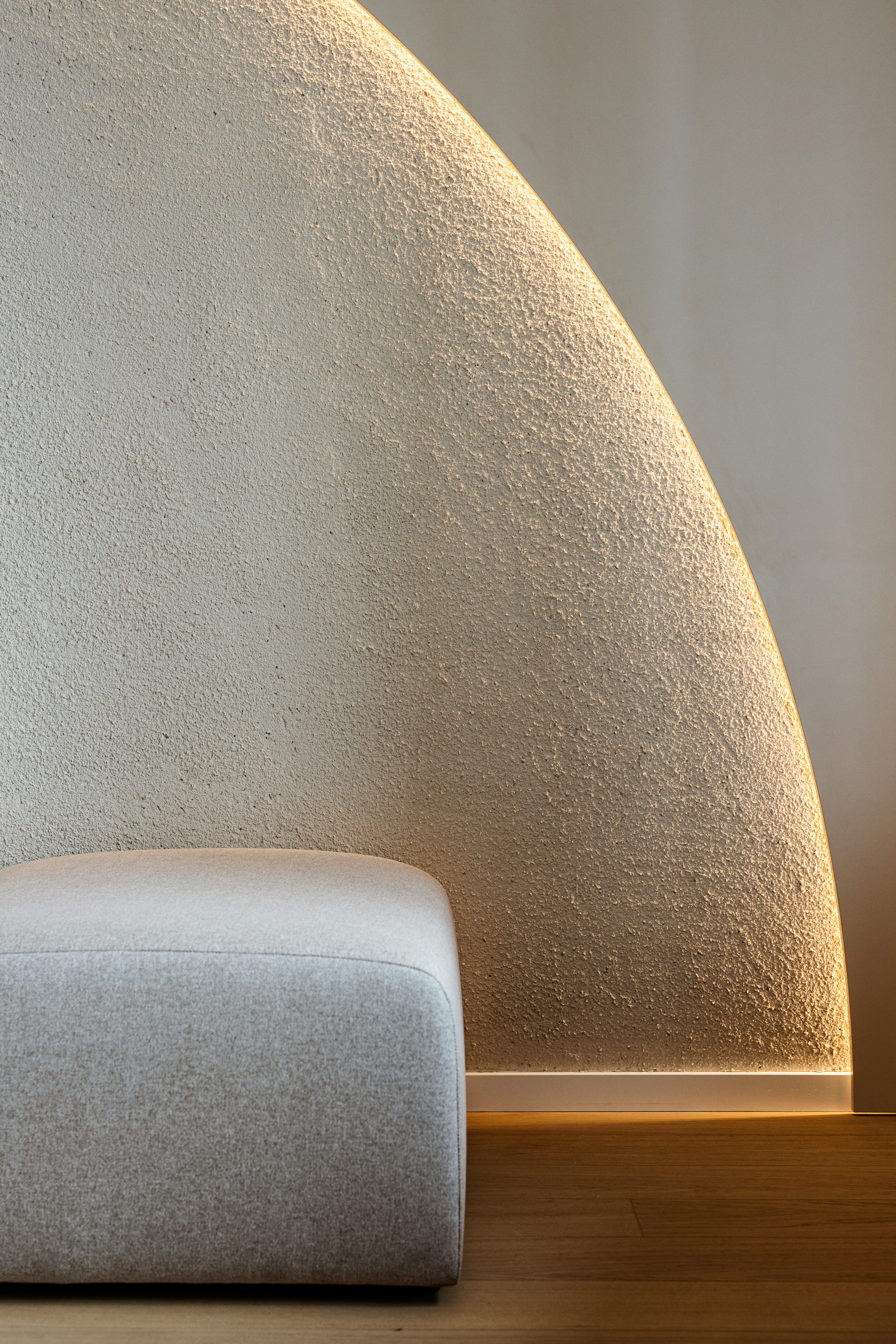 Zemité tóny stolárskych prvkov sú zladené s odtieňmi omietky a farbou stien. Svetlobéžová farba zjednocuje celý interiér. Na tomto farebnom základe vyniká práca s rôznymi textúrami. Perfektne hladký matný povrch obkladov v kontraste s drsnou, hrubozrnnou omietkou vytvára zaujímavý detail, ktorý je ešte zvýraznený podsvietením.
