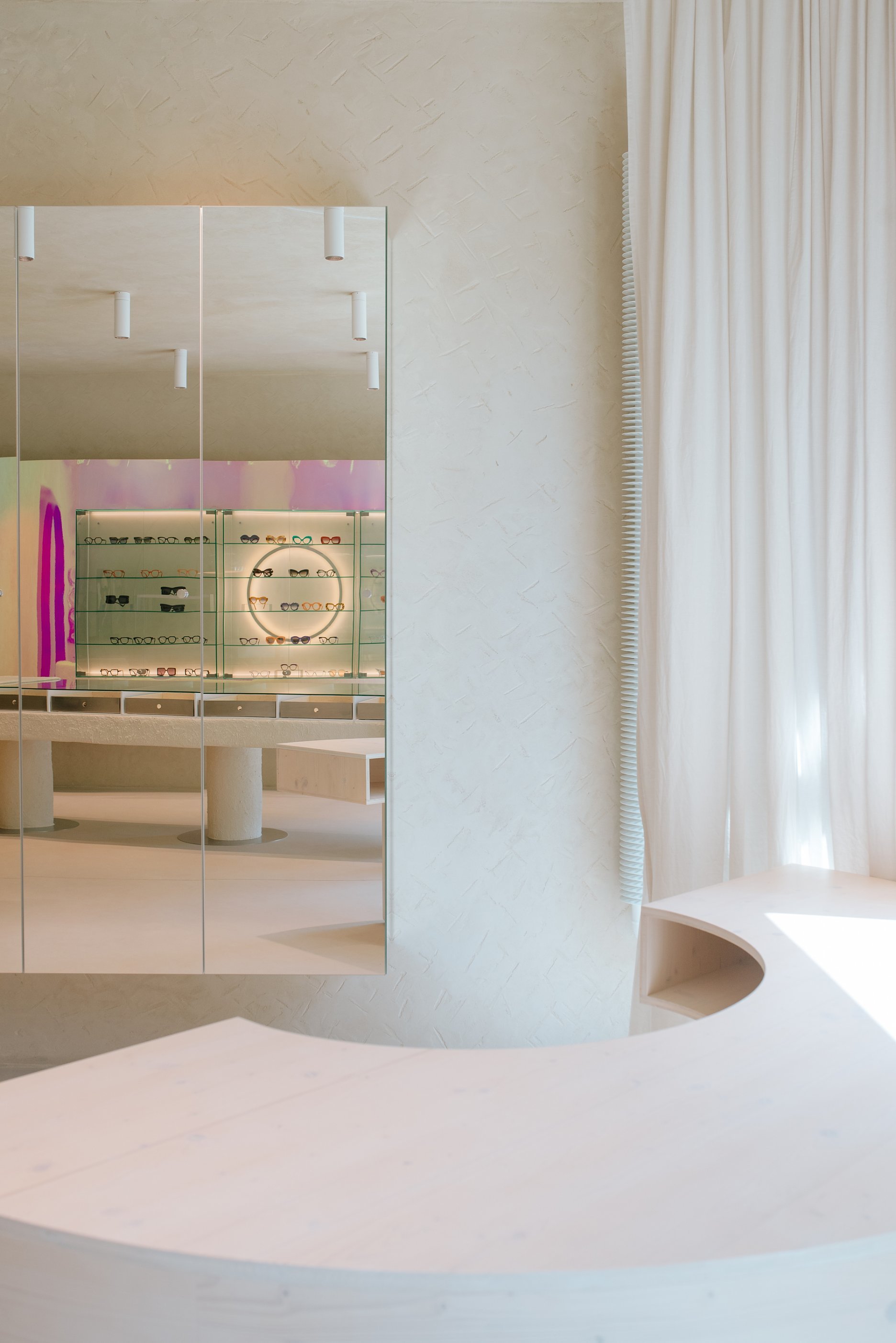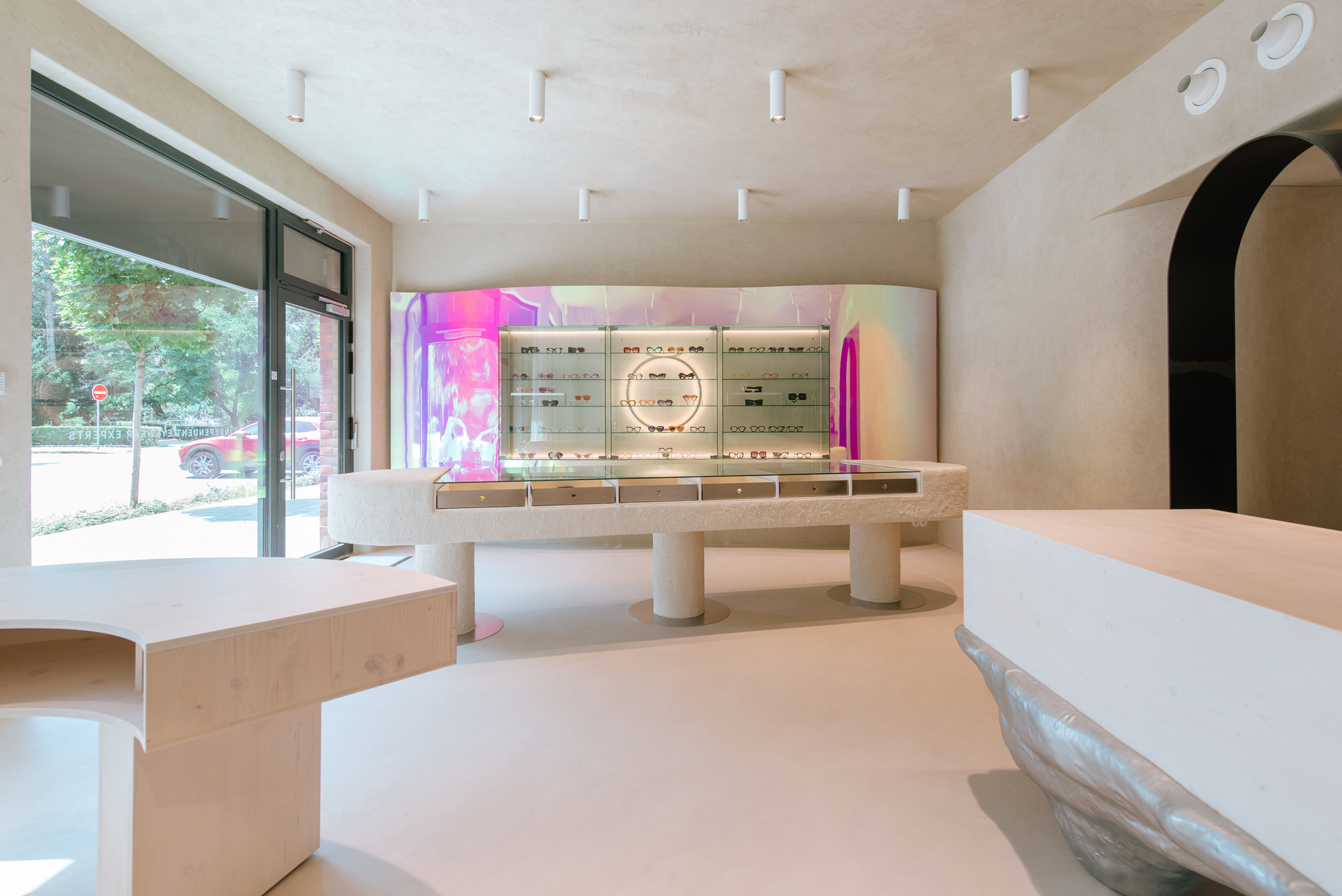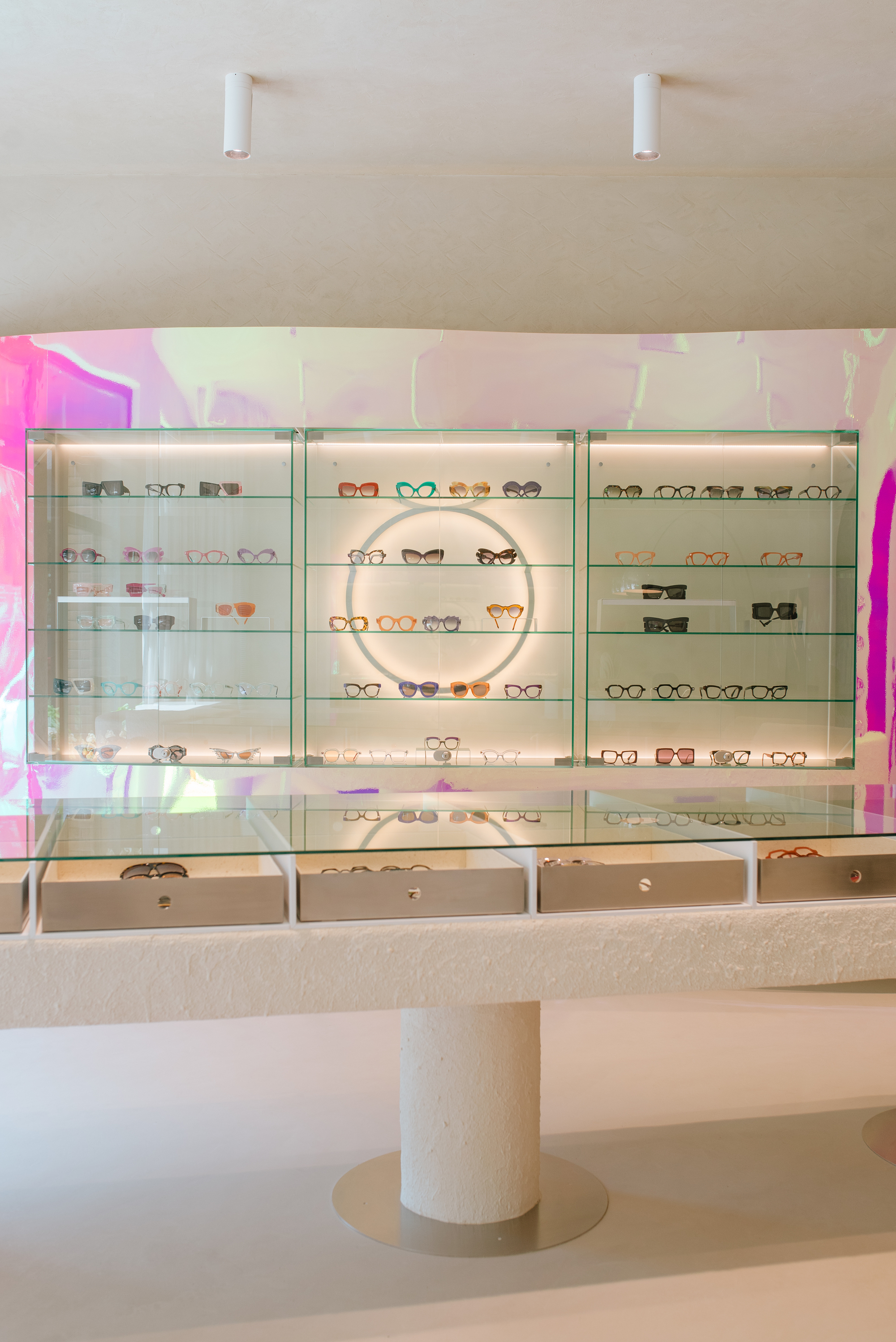 Showroom pozostáva z piatich hlavných objektov / prvkov, ktoré pôsobia ako solitéry. Ich kompozícia zároveň tvorí abstraktný obraz okuliarov.