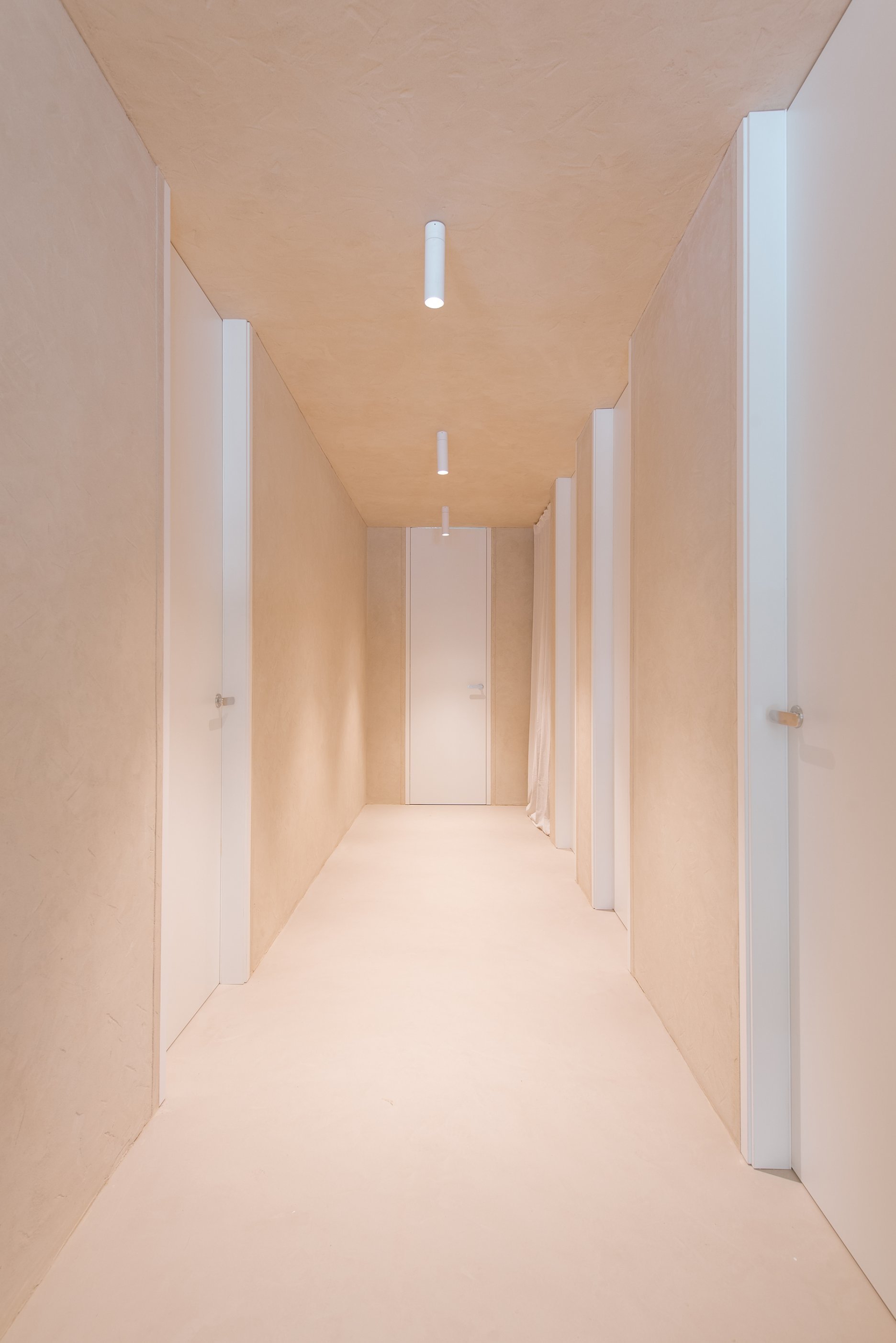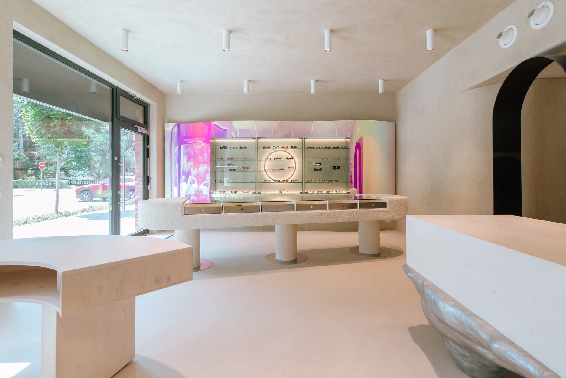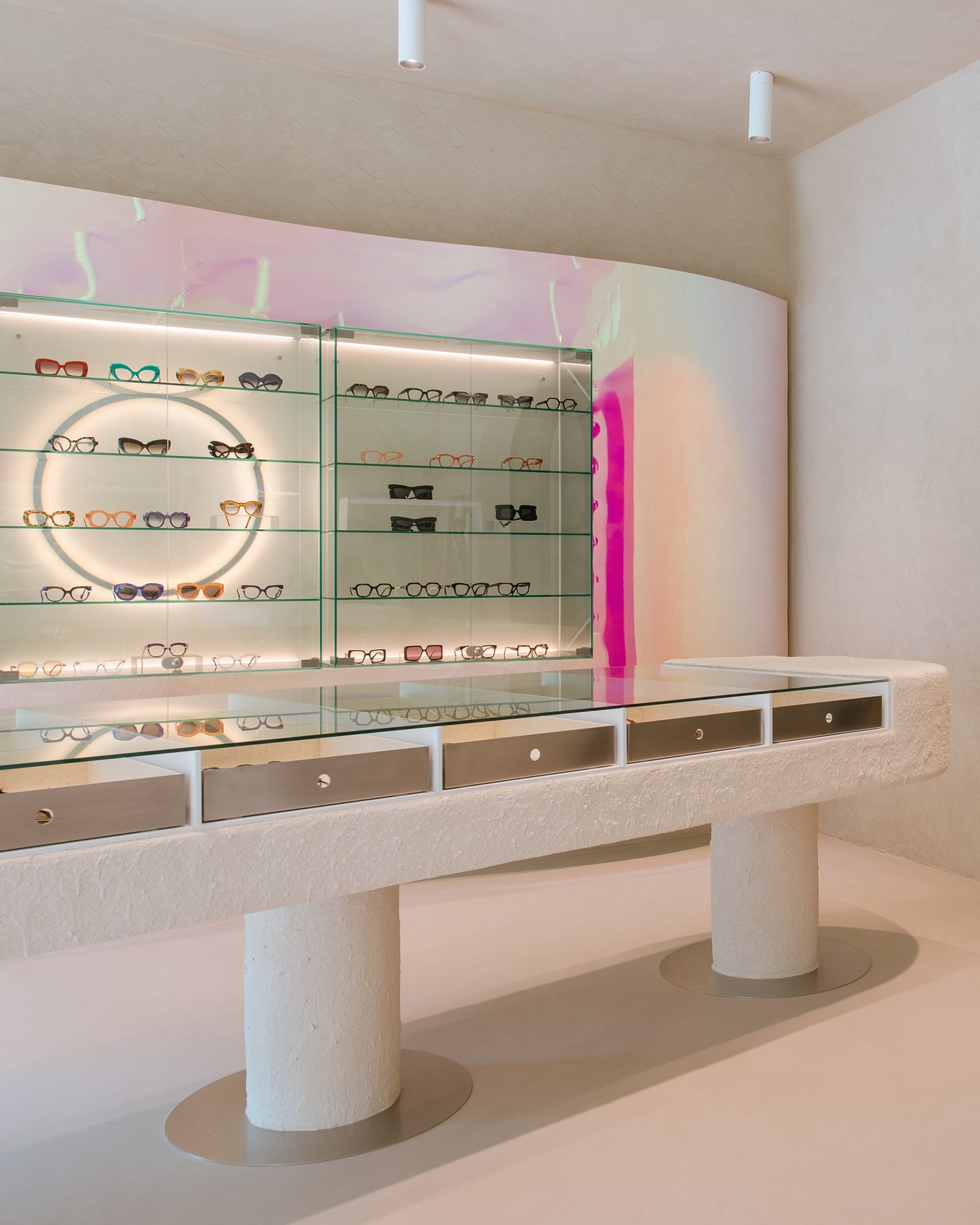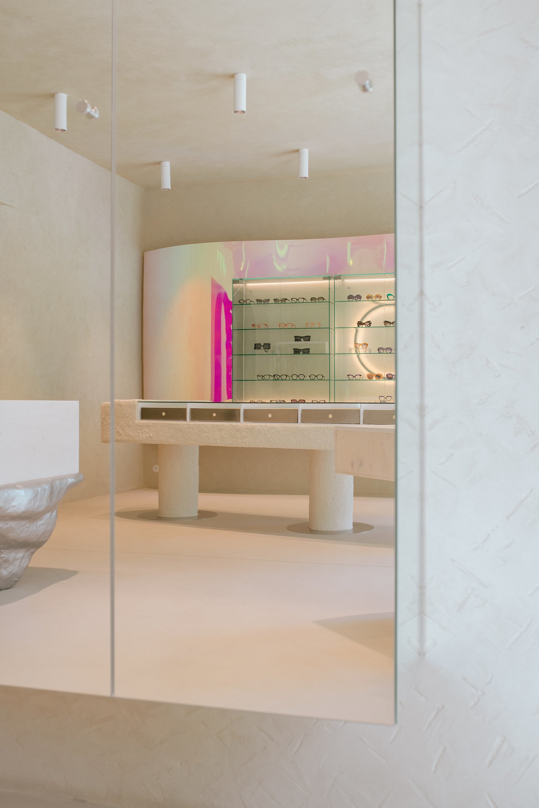 Interiér showroomu a obchodu s dizajnovými okuliarmi. Architekt Alan Prekop navrhol v partri Novostavby STEIN II organicky plynúci priestor. Celková farebnosť a priestorové riešenie necháva vyniknúť nábytkové solitéry s vystavenými produktmi. Na showroom nadväzujú ďalšie celky (optometria,kancelária, hygiena a kuchynka), do ktorých sa vchádza cez oblúkový oceľový portál. Hlina ako prírodný materiál našla uplatnenie okrem omietok aj na nábytkových solitéroch. Nanášanie viacerých vrstiev materiálu formuje napríklad organickú podnož stola s vystavenými okuliarmi.