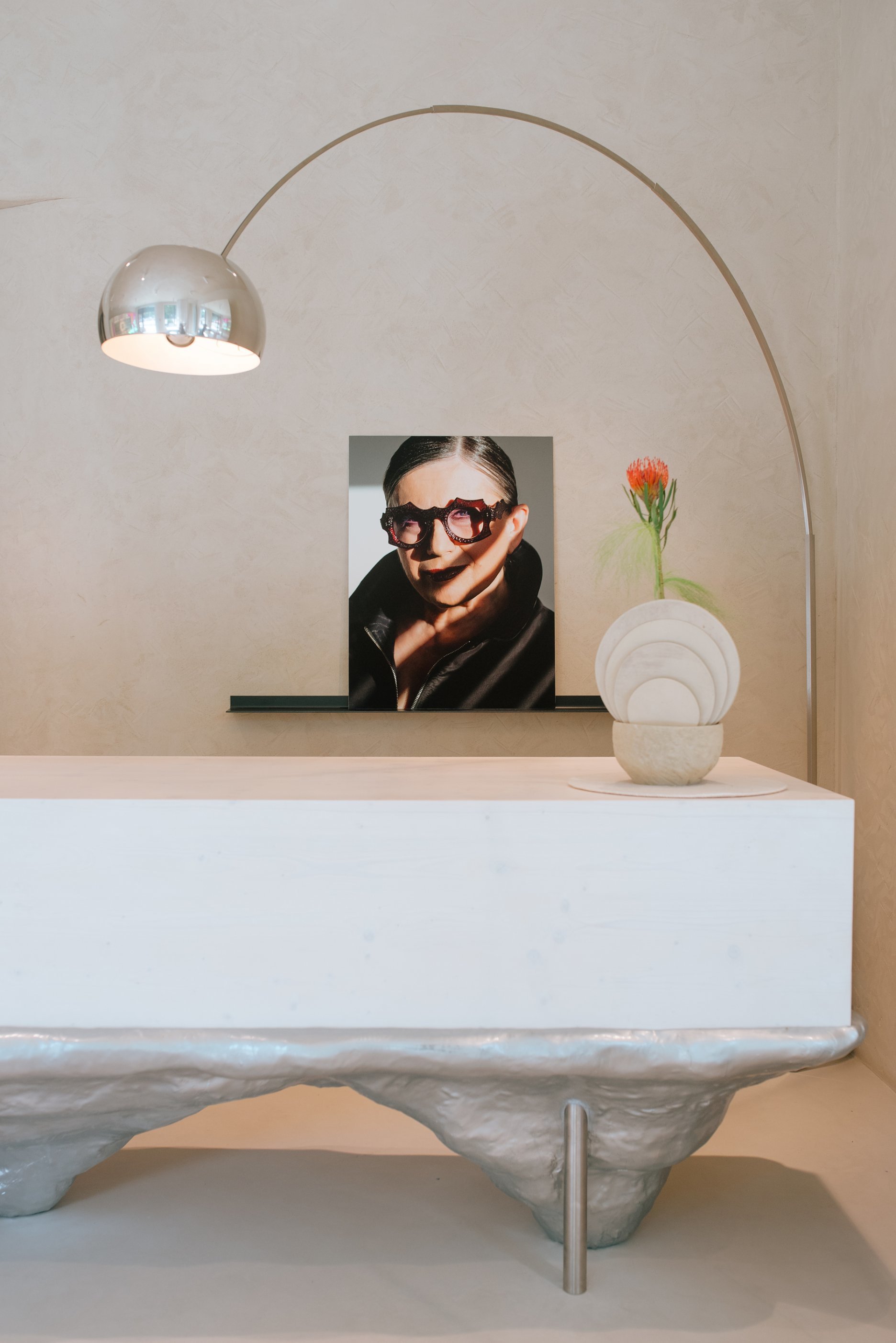 Medzi dominantné prvky v interiéri patrí zvlnená vitrína a hlinený stôl s vystavenými okuliarmi. Hlinený stôl vznikol v spolupráci s výtvarnou keramičkou.