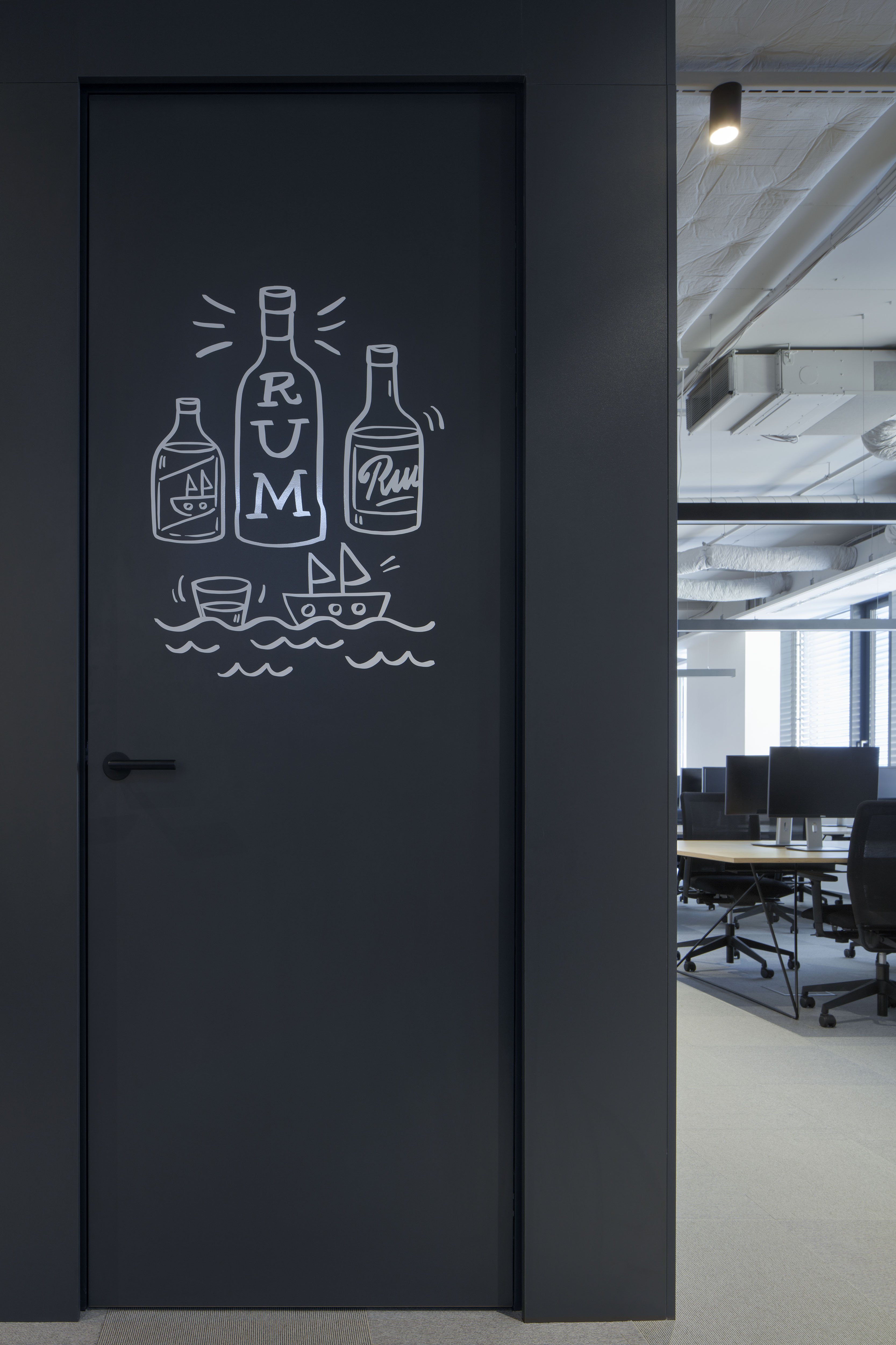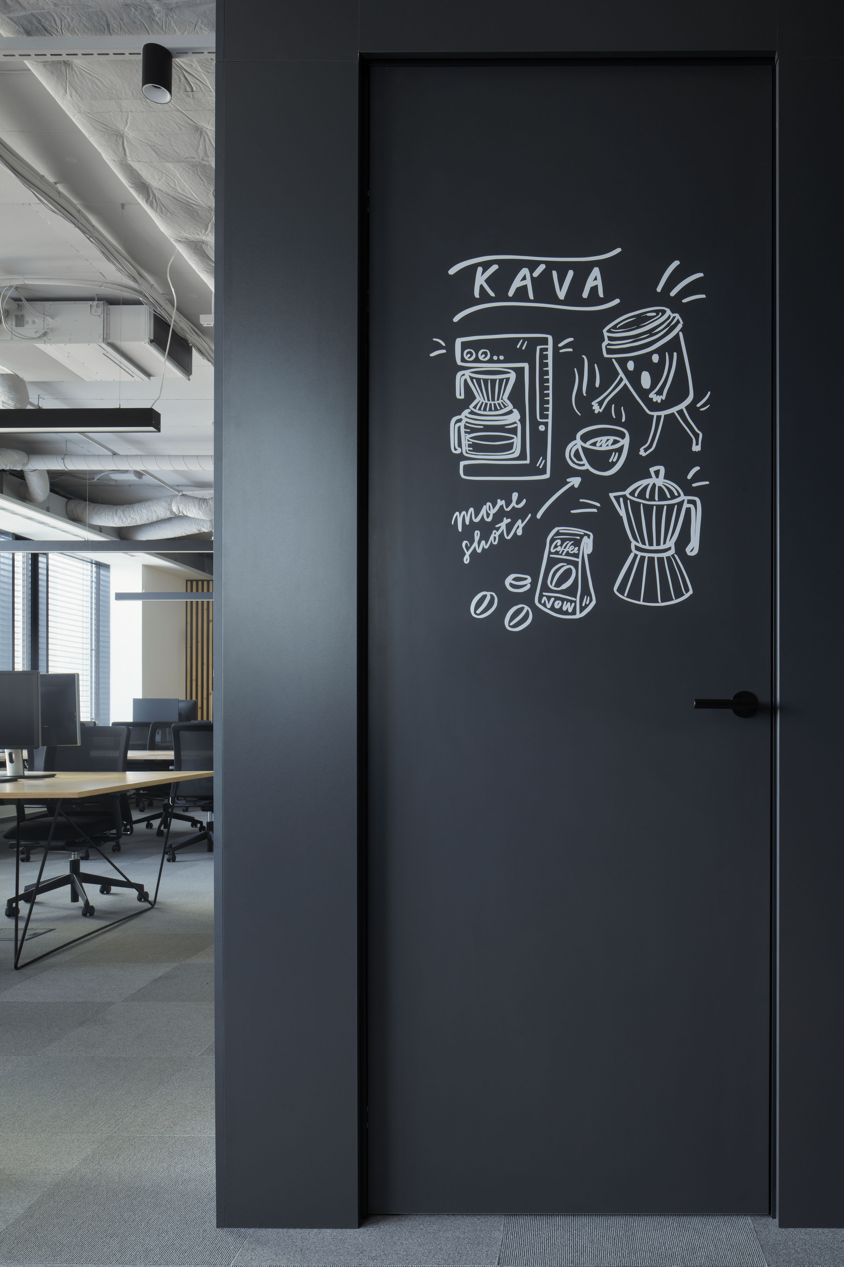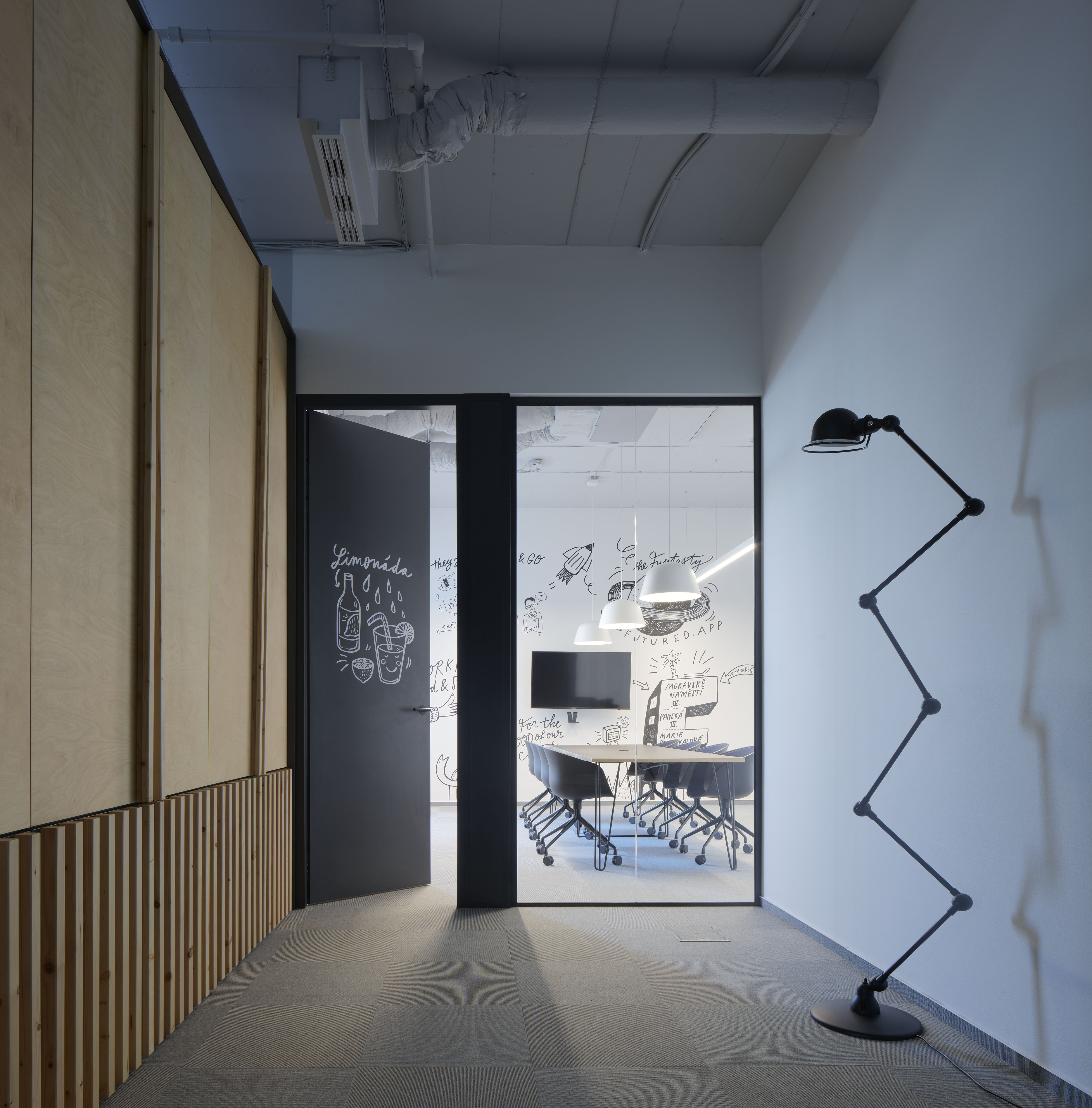 Funkčné zóny interiéru od seba oddeľujú polopriehľadné boxy zasadacích miestností. Celistvý a všetkými smermi priechodný priestor je transformovaný na sústavu rôzne exponovaných pracovných zálivov, križovatiek slúžiacich ku krátkym poradám, zasadacích miestností rôznej veľkosti a miest určených k odpočinku a zábave. Technologickým srdcom kancelárie je Device Lab - knižnica mobilných zariadení, na ktorých developeri testujú vznikajúce aplikácie. Komplikovaná dokovacia stanica je úhľadne integrovaná v nábytkovej stene, tablety a telefóny ležia na poličkách bez spleti káblov.