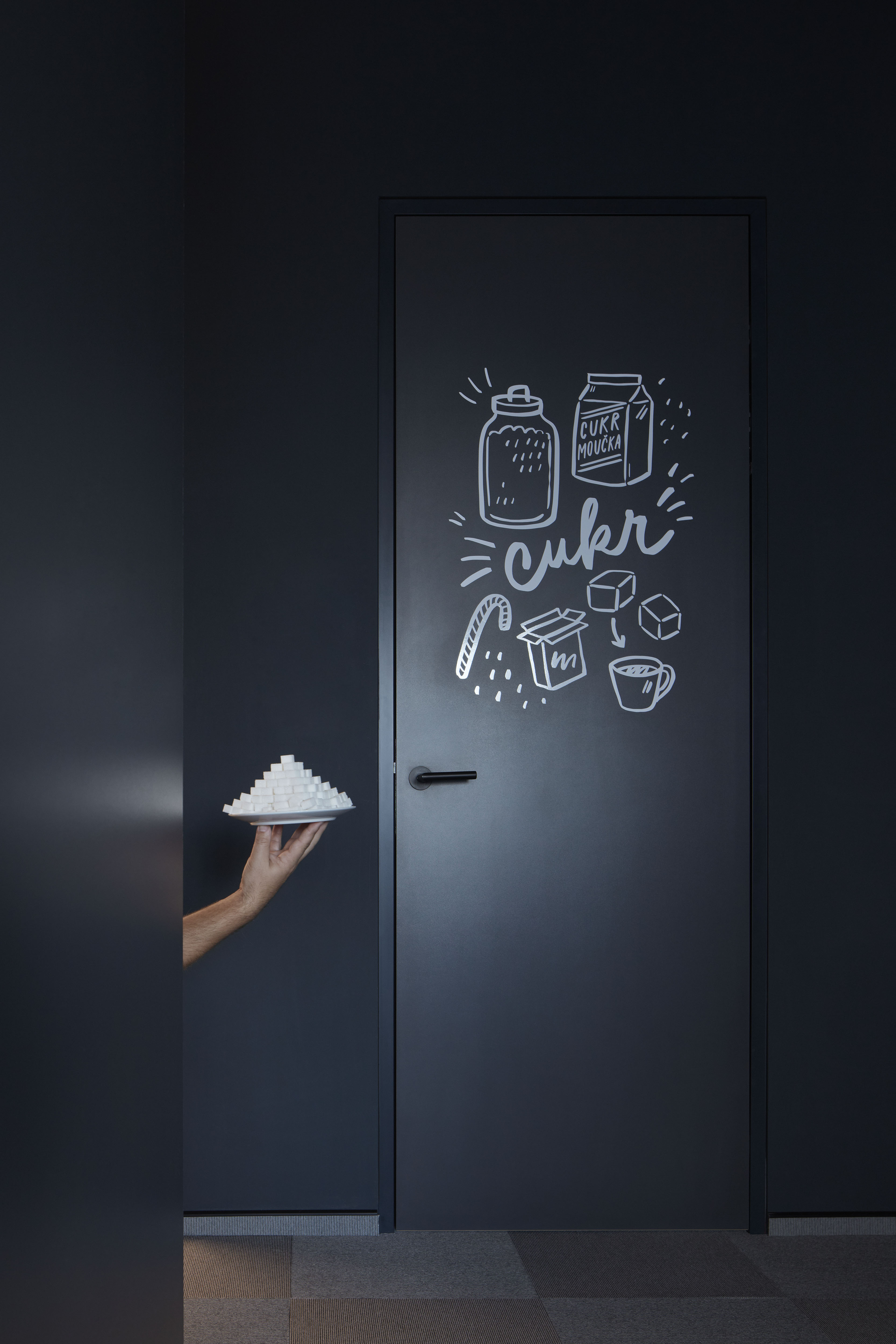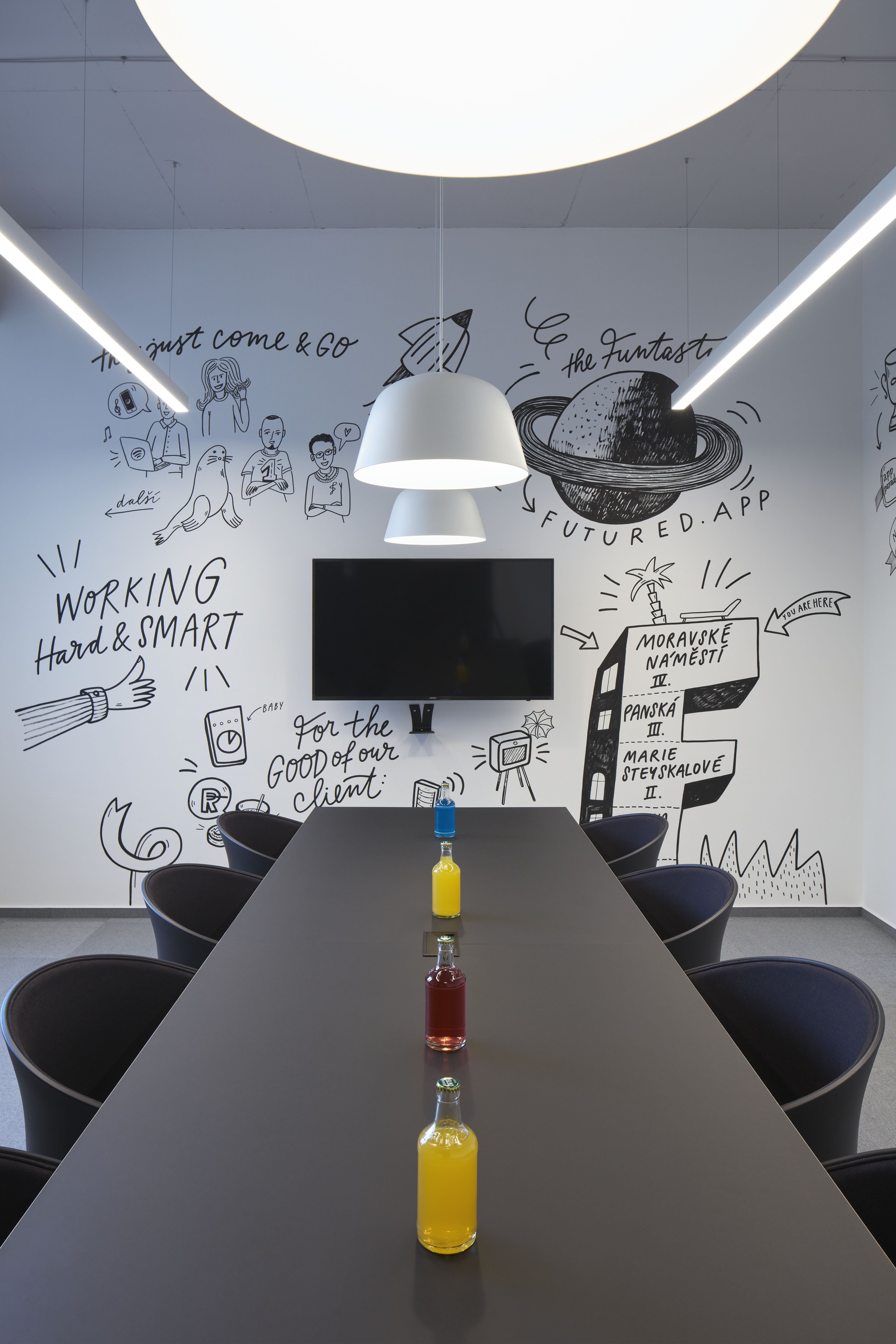 Na mieru vyrábané nábytkové kusy, na ktorých architekti spolupracovali s českými dizajnérmi, dopĺňa mobiliár Wiesner-Hager, spĺňajúci estetické a funkčné požiadavky klienta. Na návrhu stolov sa s spolu architektmi podieľali českí dizajnéri. “Kompletní realizace je podtrhnutá grafickým řešením - coby vtipně pojatou kronikou společnosti,” zdôrazňujú autori. Svojou grafikou a ilustráciami prispela Karolína Stryková.