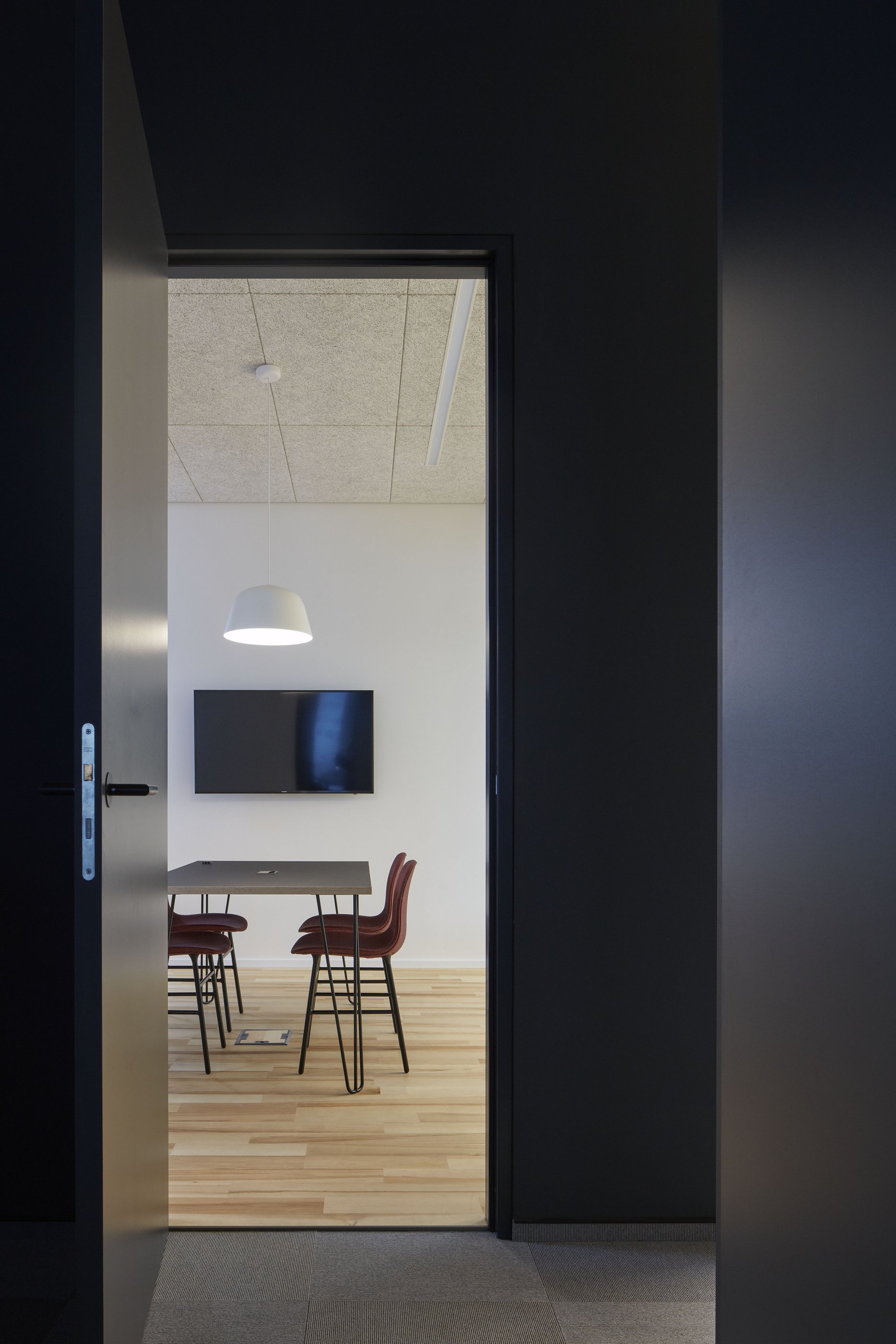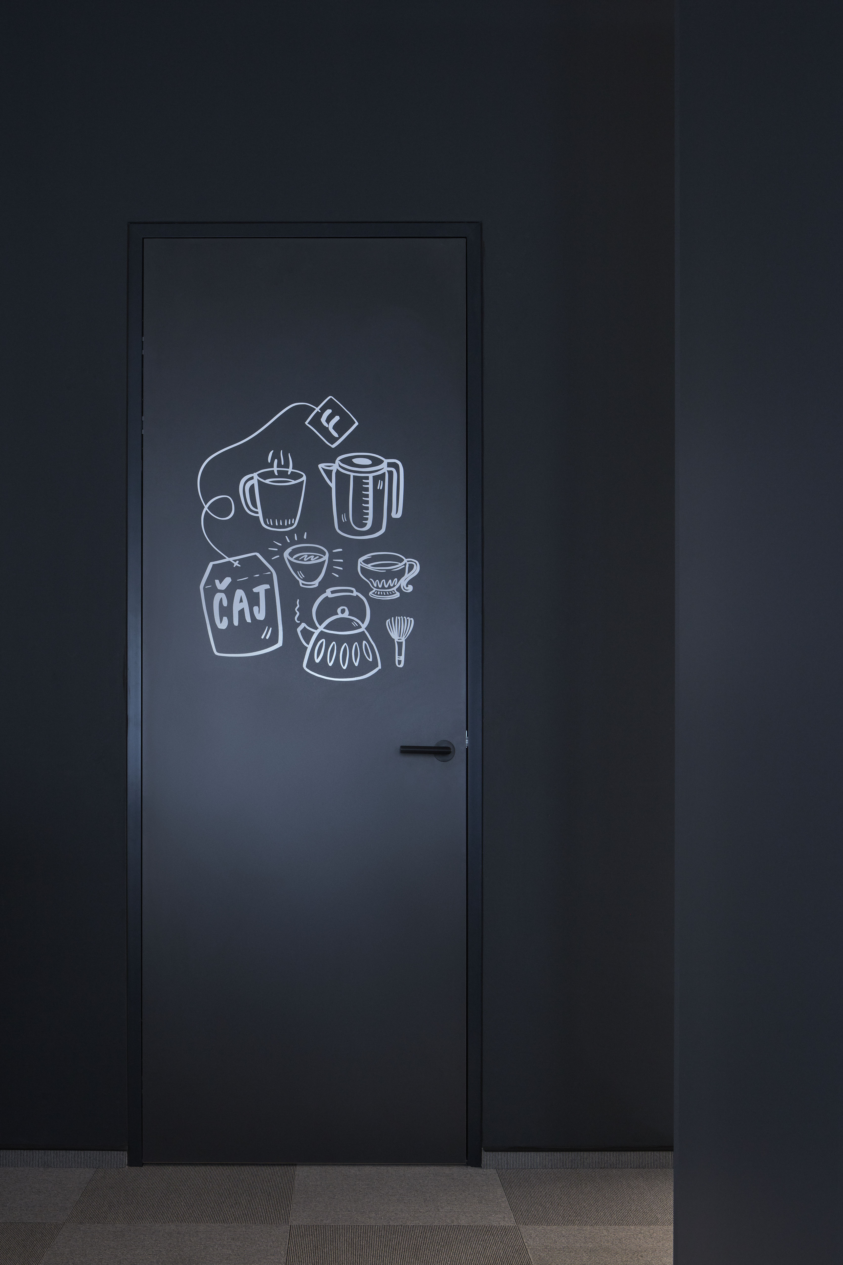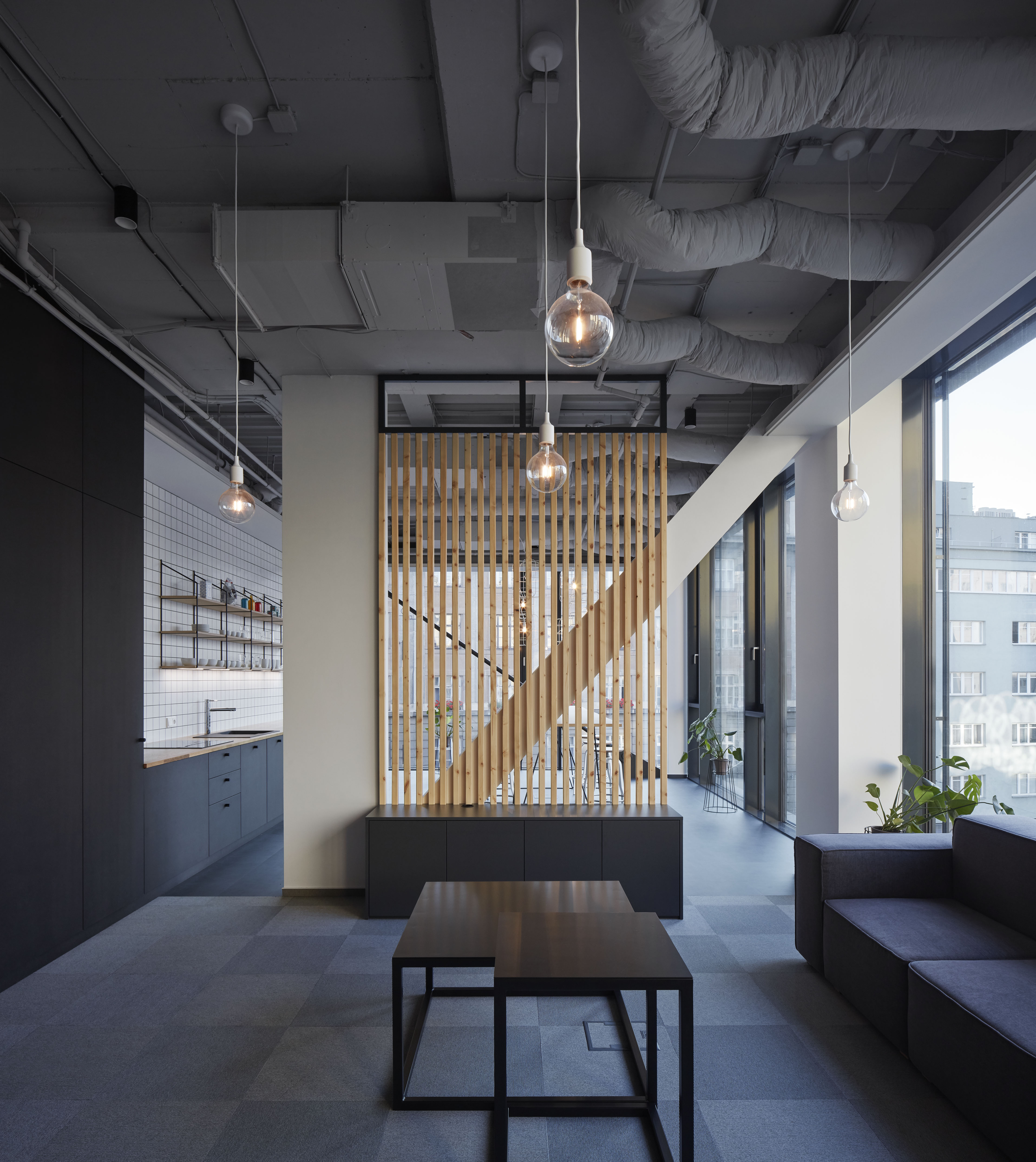 Kultivovaný dialóg kontrastov - materiálov a farieb, je prítomný na každom kroku. Kombinácia studených, tvrdých materiálov a prírodnej štruktúry dreva podporuje spolu s vrstvením priehľadných a polopriehľadných konštrukcií ilúziu hĺbky priestoru. Riešenie podčiarkuje “nahý” strop s odhalenou technológiou. “Měkké, hřejivé dřevo smrkových latí a chladná, tvrdá plocha copilitových panelů si mezi sebou občas sice vymění pár ostrých slov, v důležitých záležitostech se však shodnou. Tam, kde je to třeba, vymezují pracoviště a prostory spolupráce, jinde zase spojují komunitu,” píšu s nadsádzkou architekti.
