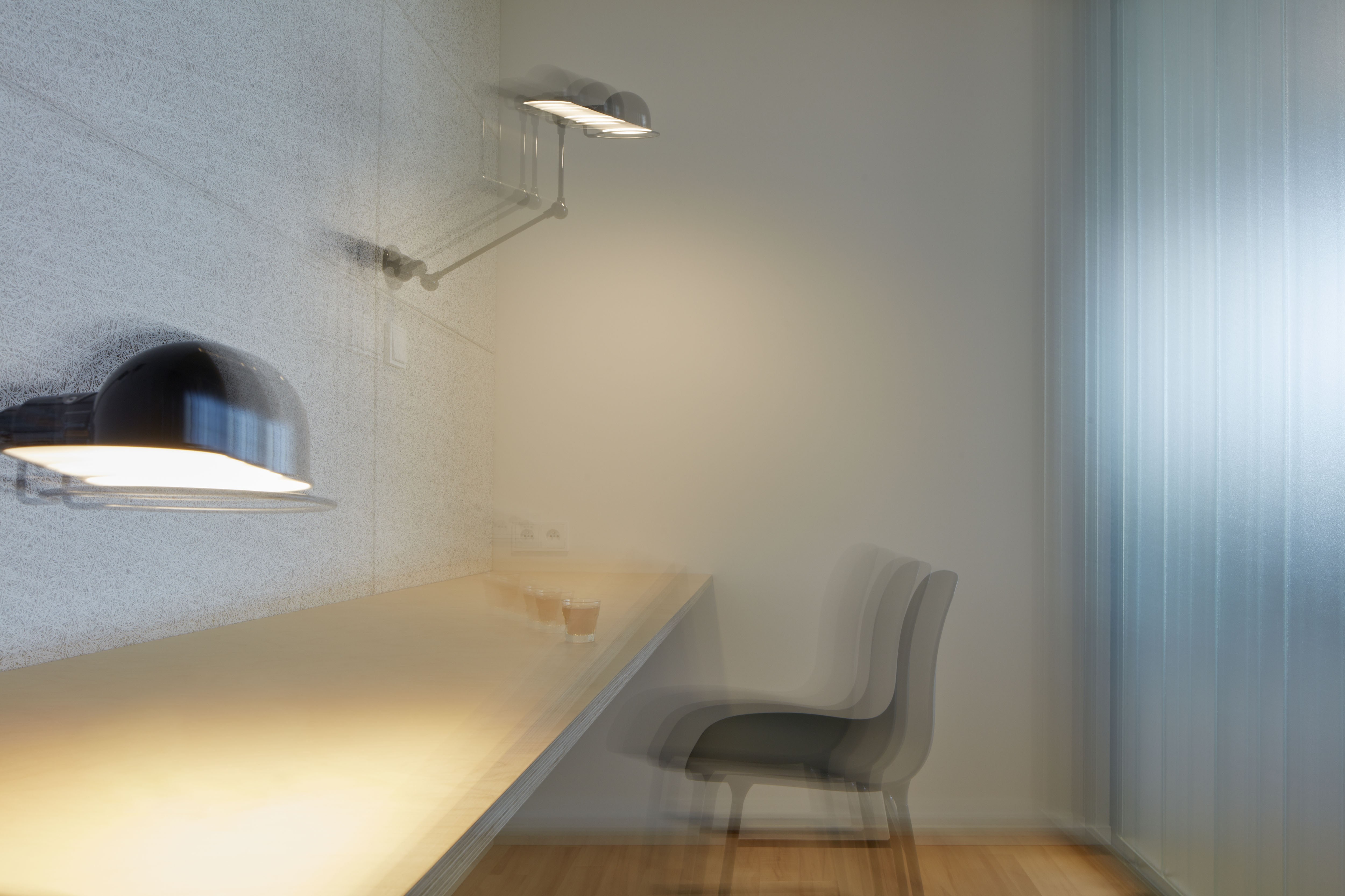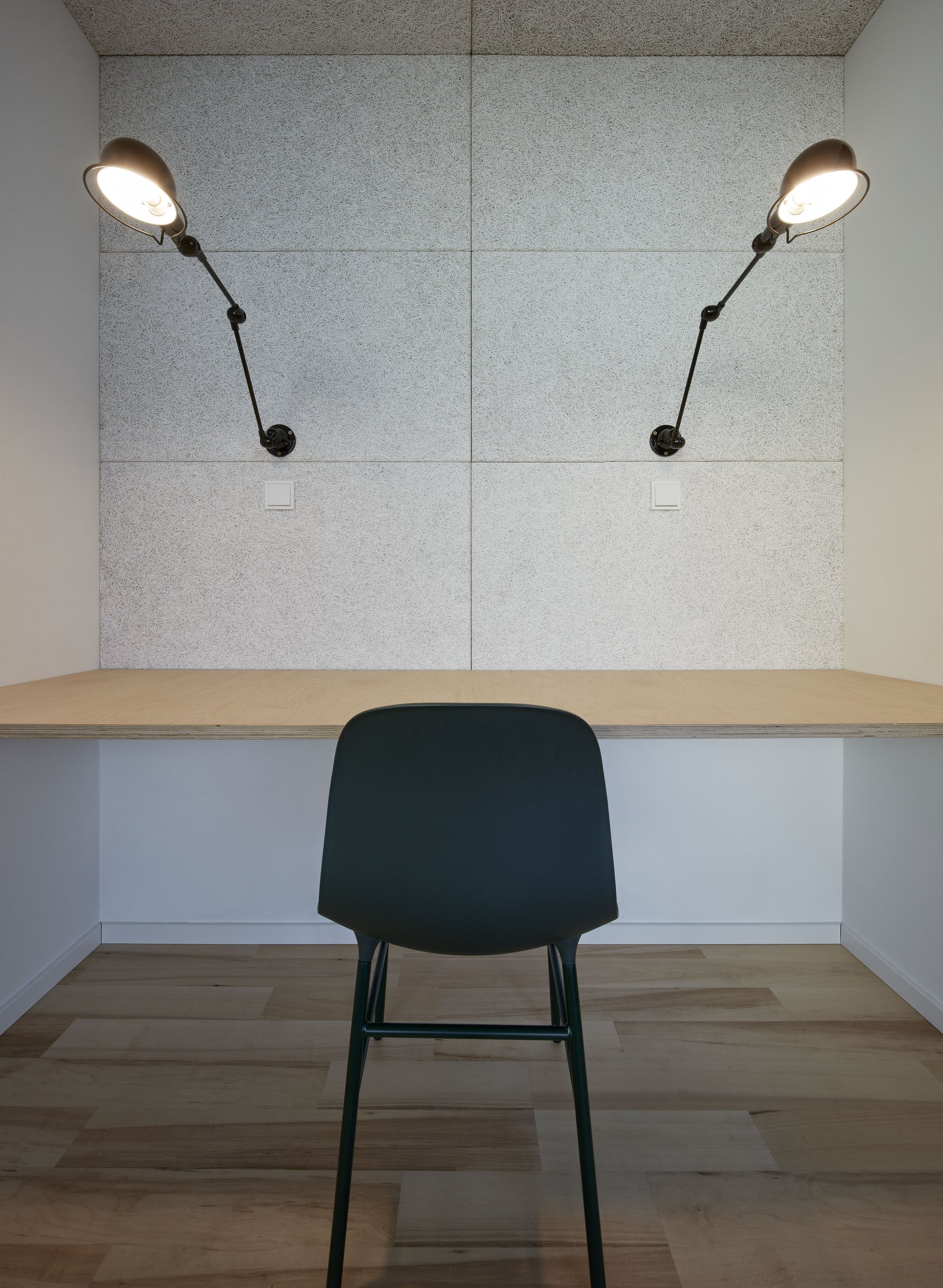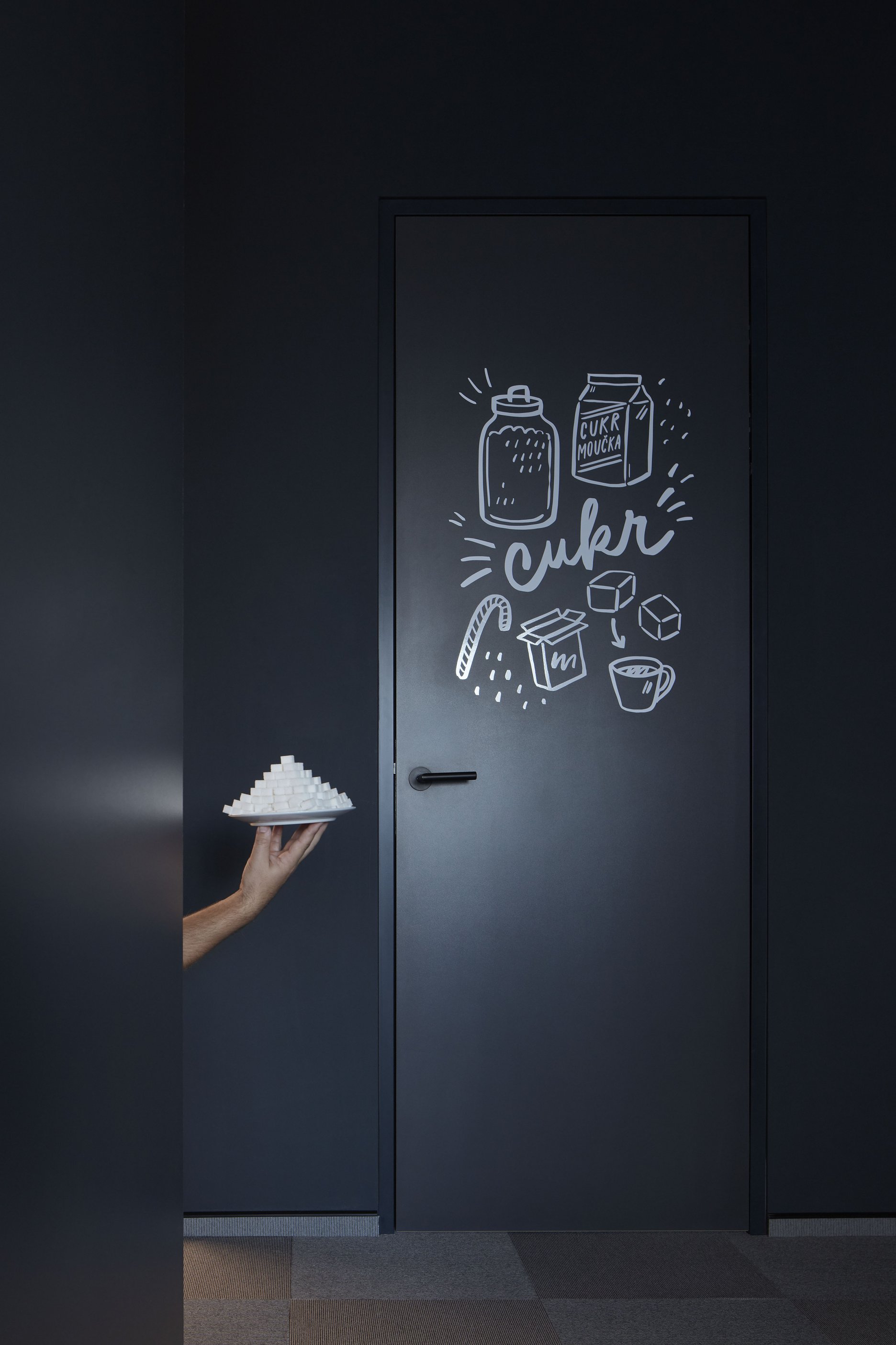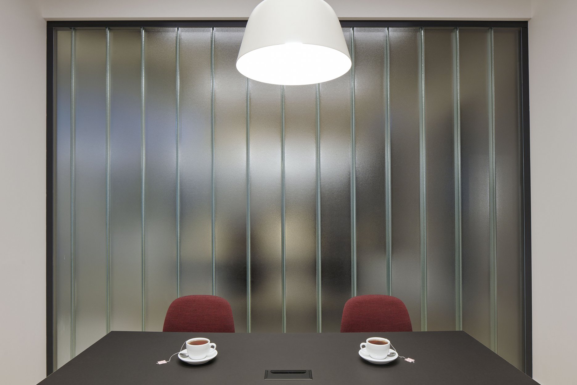 Kultivovaný dialóg kontrastov - materiálov a farieb, je prítomný na každom kroku. Kombinácia studených, tvrdých materiálov a prírodnej štruktúry dreva podporuje spolu s vrstvením priehľadných a polopriehľadných konštrukcií ilúziu hĺbky priestoru. Riešenie podčiarkuje “nahý” strop s odhalenou technológiou. “Měkké, hřejivé dřevo smrkových latí a chladná, tvrdá plocha copilitových panelů si mezi sebou občas sice vymění pár ostrých slov, v důležitých záležitostech se však shodnou. Tam, kde je to třeba, vymezují pracoviště a prostory spolupráce, jinde zase spojují komunitu,” píšu s nadsádzkou architekti.