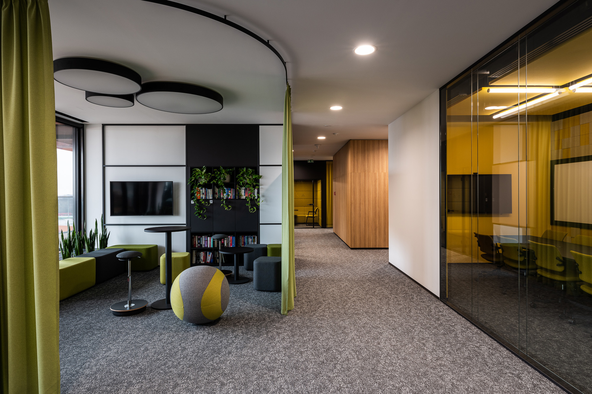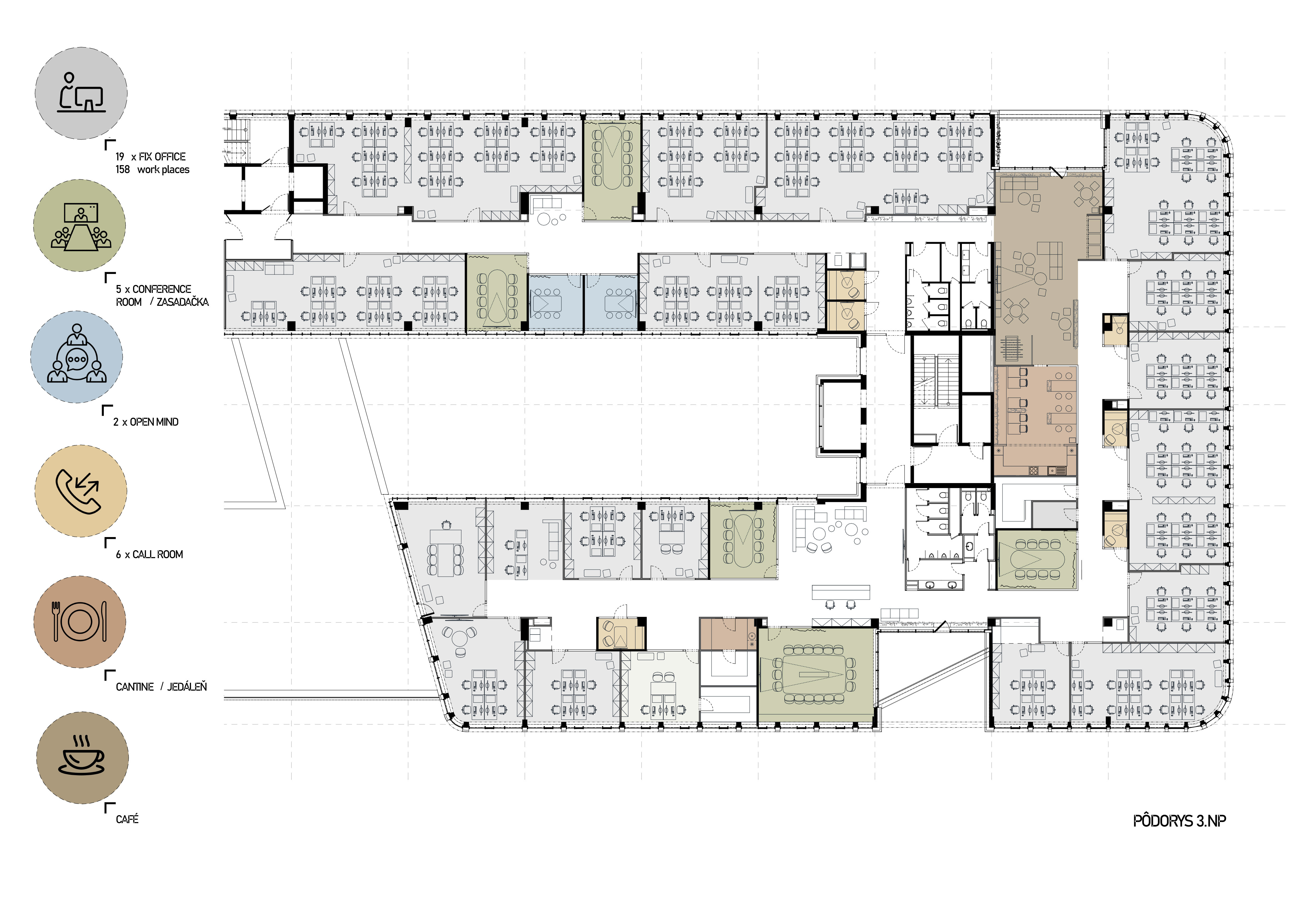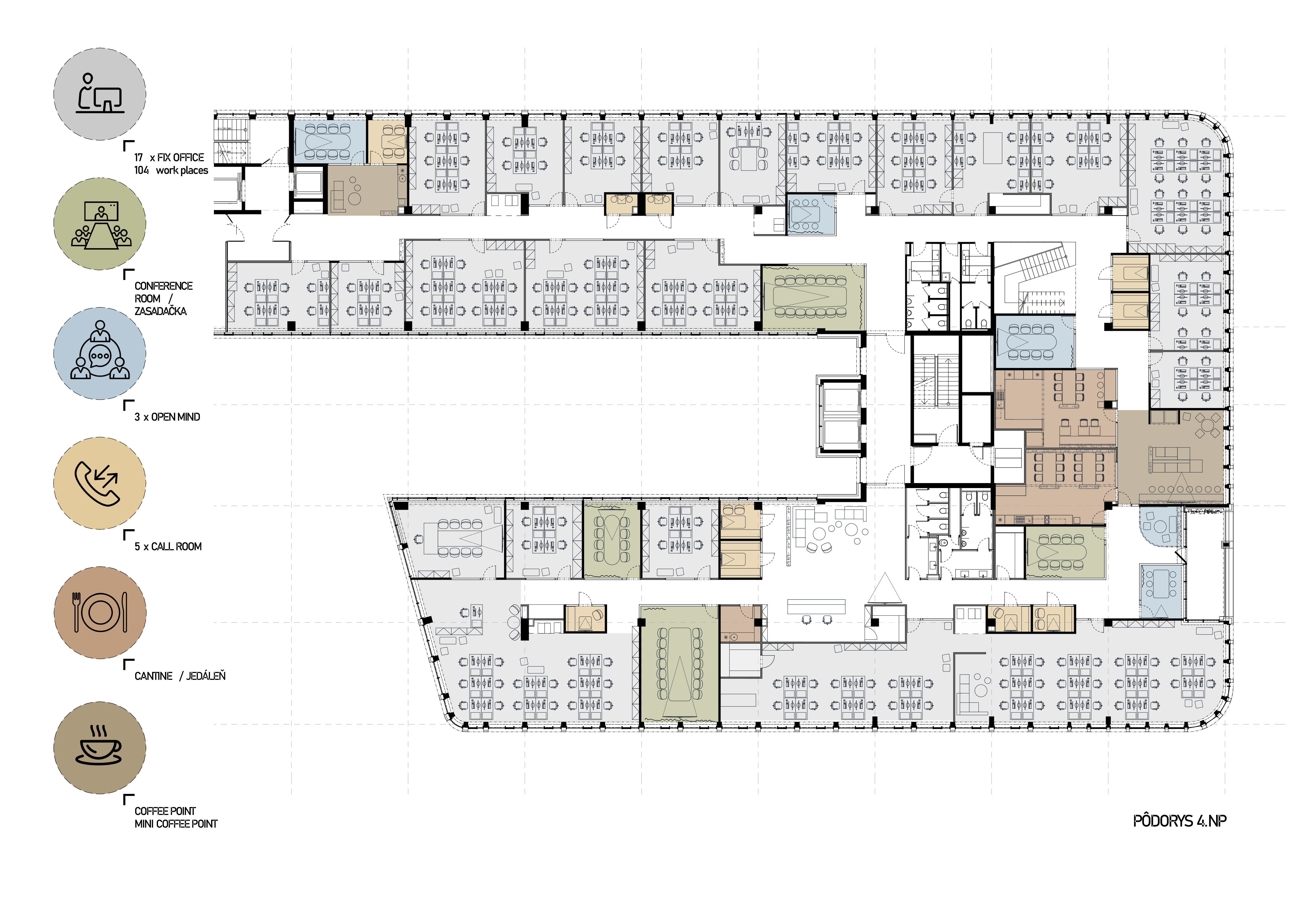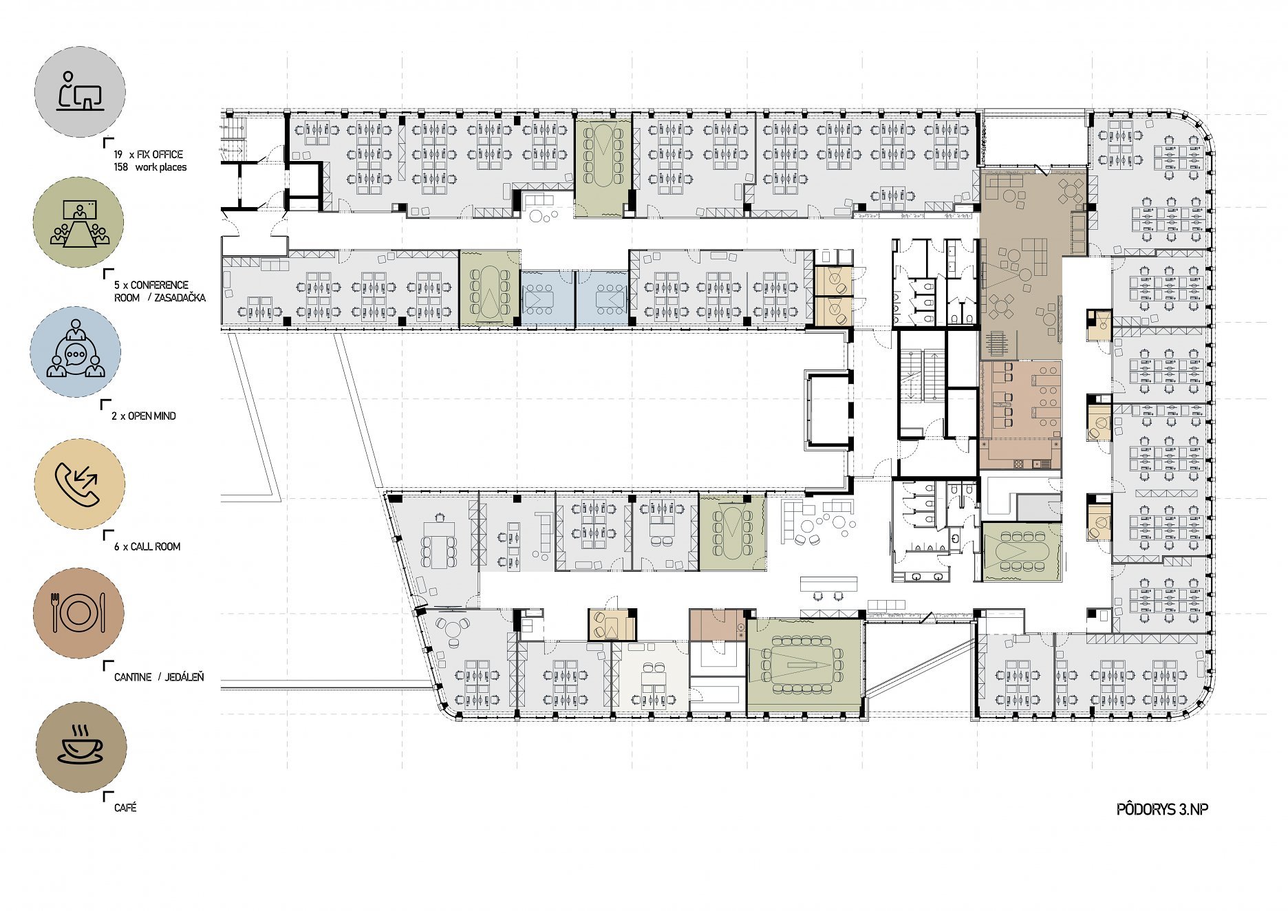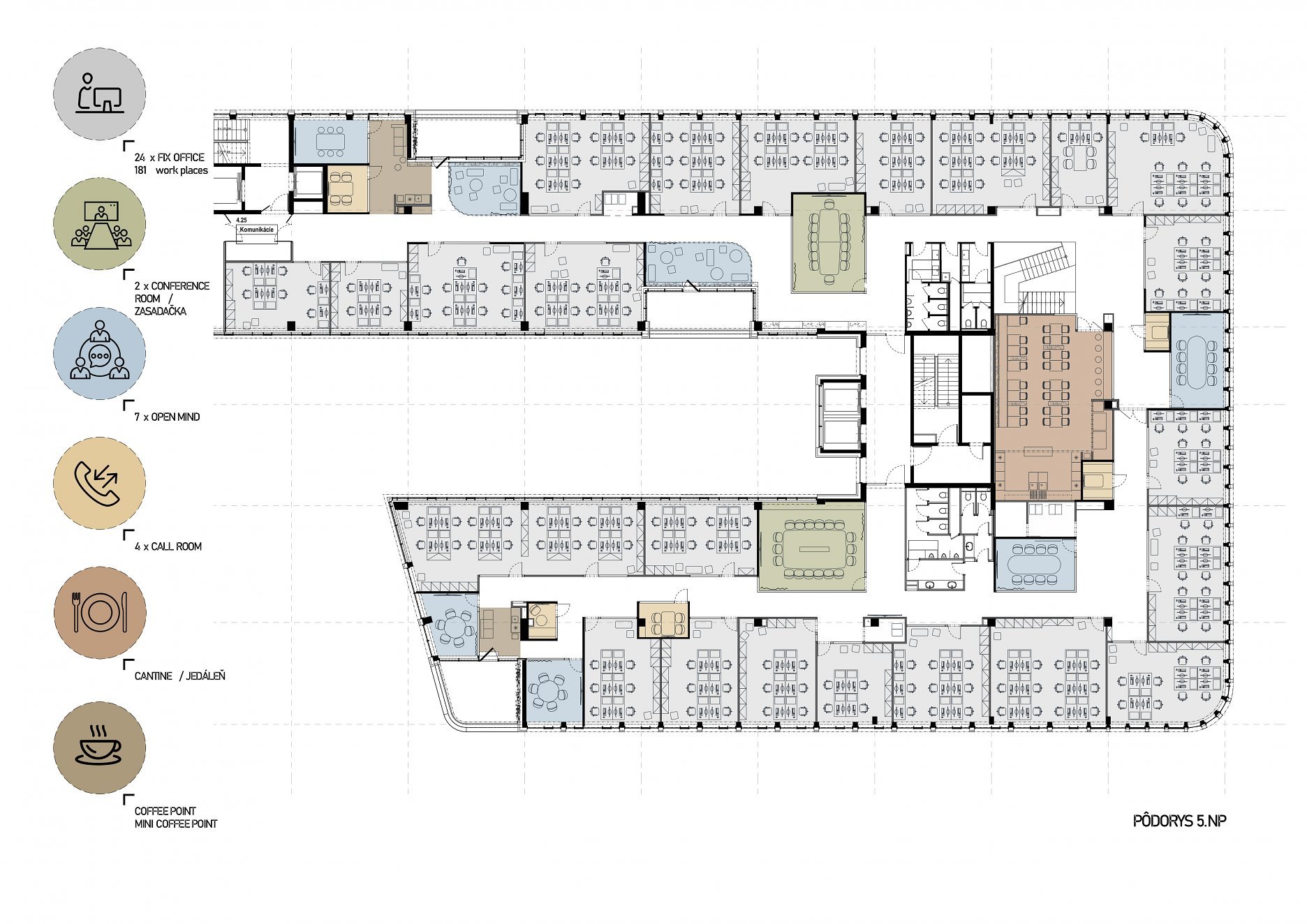 Dispozícia pracovných priestorov je efektívna a prehľadná, no zároveň funkčne, priestorovo a vizuálne bohatá. Namiesto tradičných chodieb vytvárame multifunkčný, pôdorysne členitý (a skutočne) komunikačný priestor, ktorý tvorí chrbticu celej prevádzky. Vznikajú v ňou "zálivy", naplnené pracovnými či oddychovými mikropriestormi, ktorých úlohou je spájať ľudí, podporovať sociálny a pracovný kontakt medzi kolegami. Vďaka internému schodisku prestávajú byť podlažia bariérou pre tento kontakt. Dôraz sme kládli aj na oddychové priestory, najmä ich správnu funkčnú segregáciu. Gastro zariadenia sa členia od malých coffee pointov, cez uzatvorené kuchyne s jedálňou až po firemnú kaviareň.