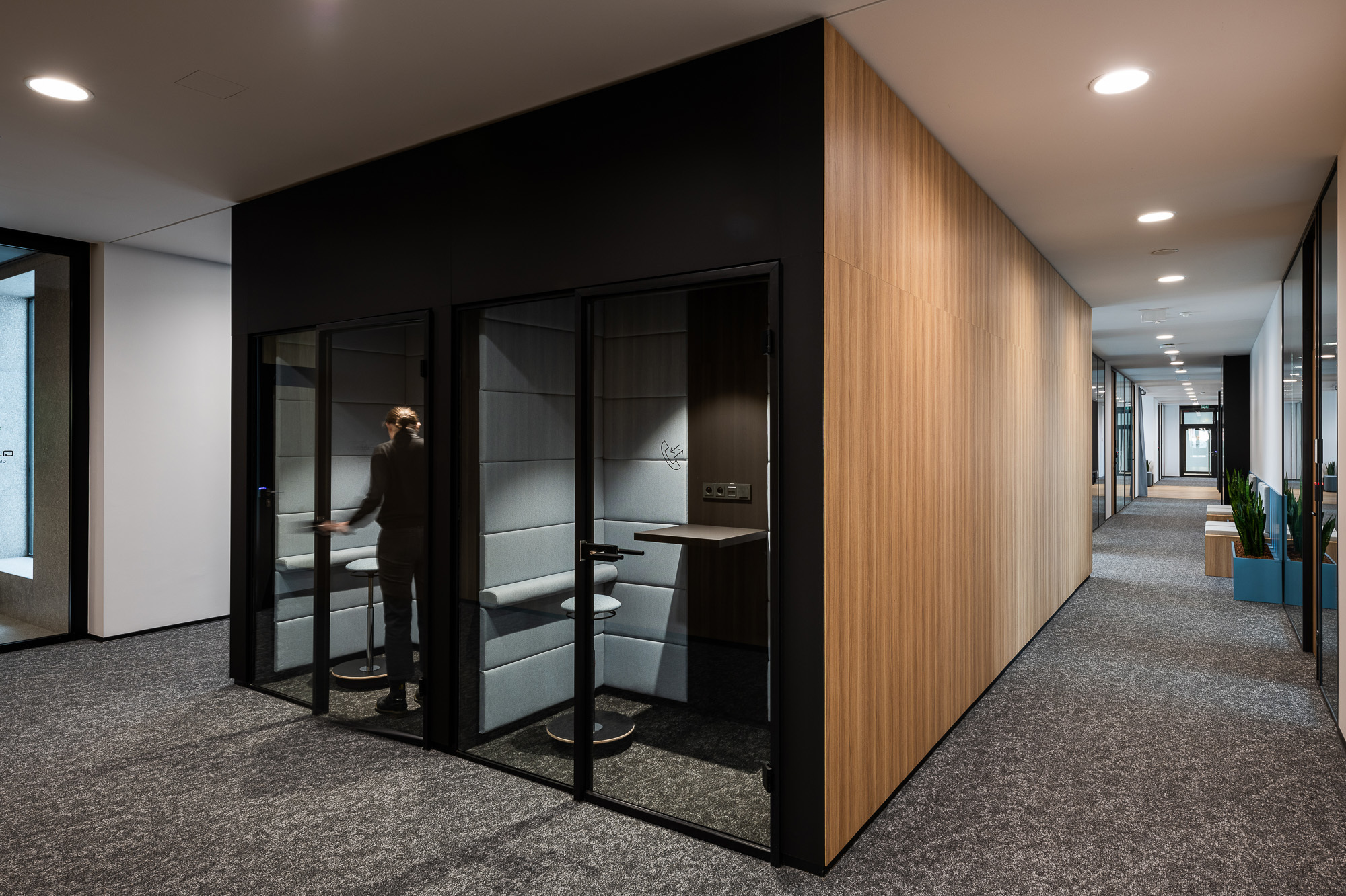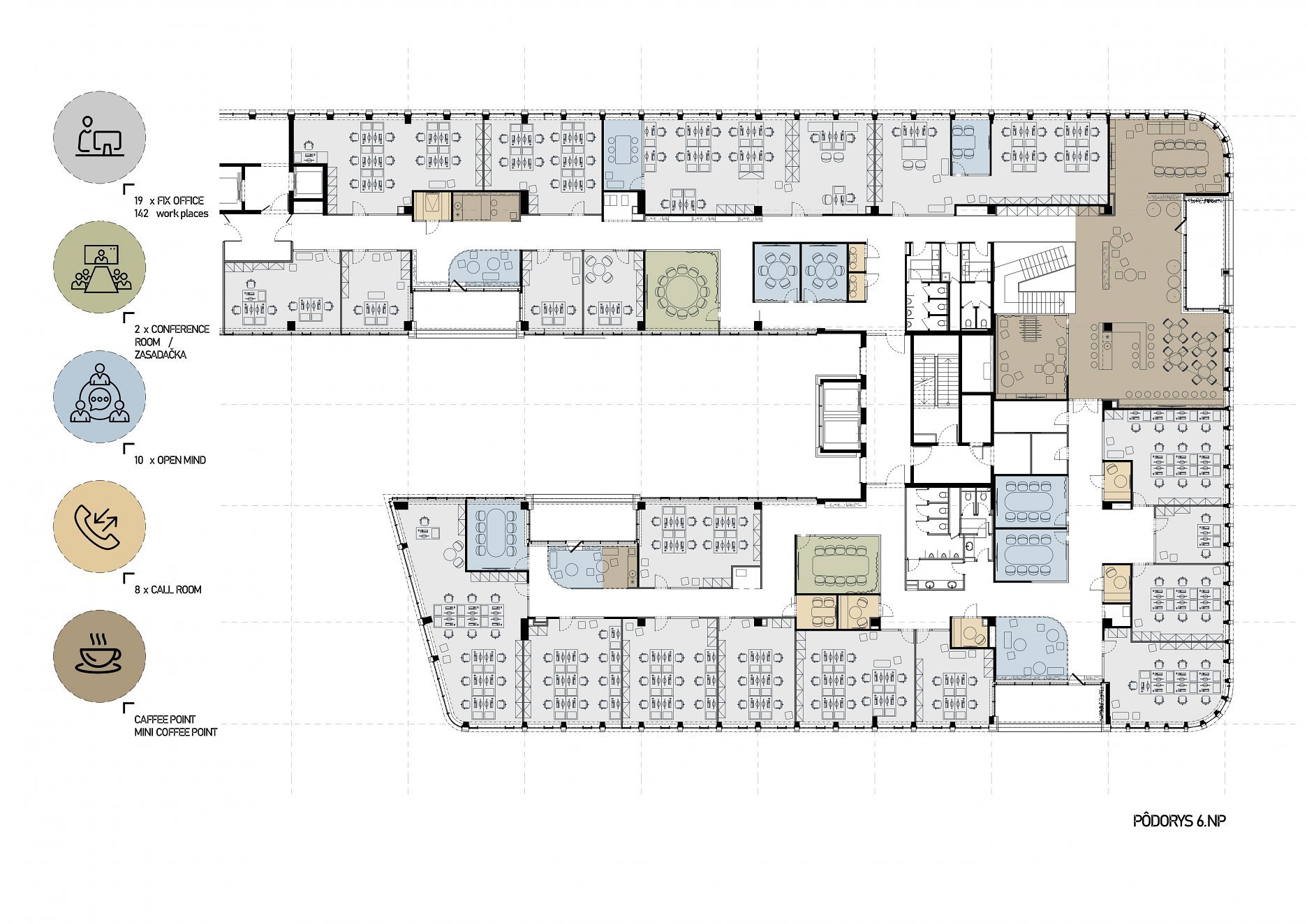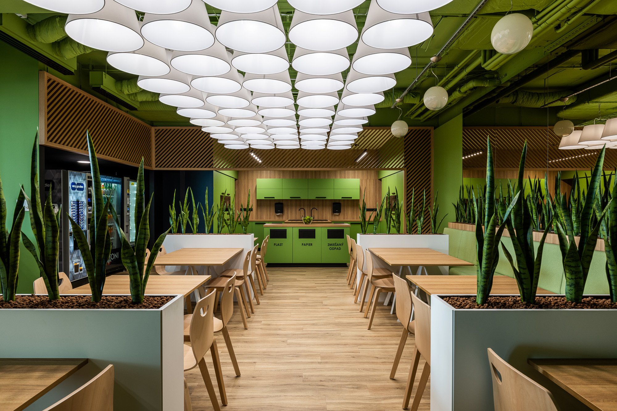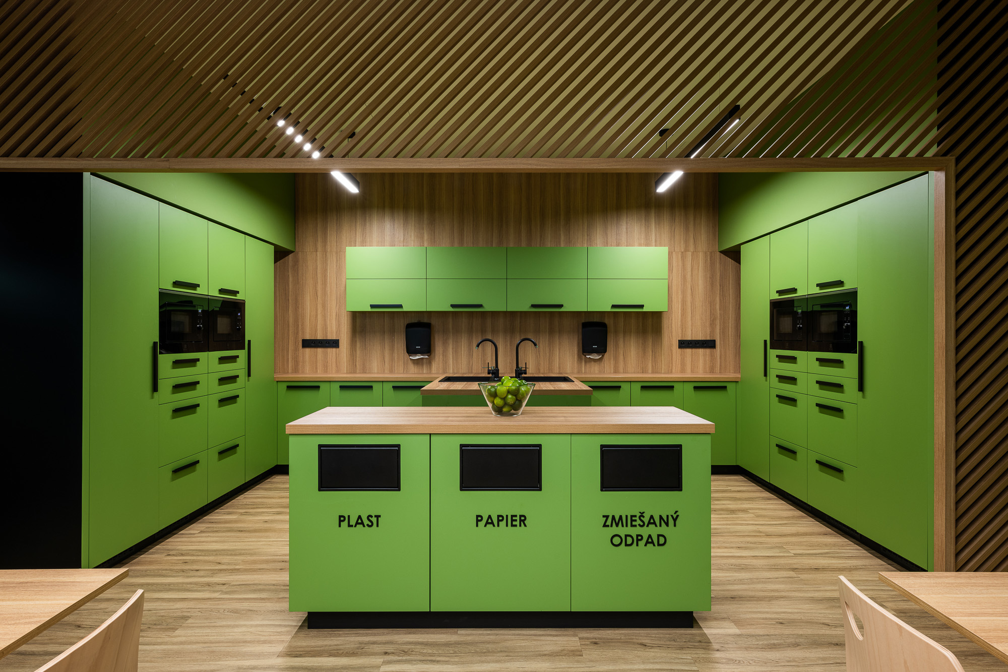 Dispozícia pracovných priestorov je efektívna a prehľadná, no zároveň funkčne, priestorovo a vizuálne bohatá. Namiesto tradičných chodieb vytvárame multifunkčný, pôdorysne členitý (a skutočne) komunikačný priestor, ktorý tvorí chrbticu celej prevádzky. Vznikajú v ňou "zálivy", naplnené pracovnými či oddychovými mikropriestormi, ktorých úlohou je spájať ľudí, podporovať sociálny a pracovný kontakt medzi kolegami. Vďaka internému schodisku prestávajú byť podlažia bariérou pre tento kontakt. Dôraz sme kládli aj na oddychové priestory, najmä ich správnu funkčnú segregáciu. Gastro zariadenia sa členia od malých coffee pointov, cez uzatvorené kuchyne s jedálňou až po firemnú kaviareň.