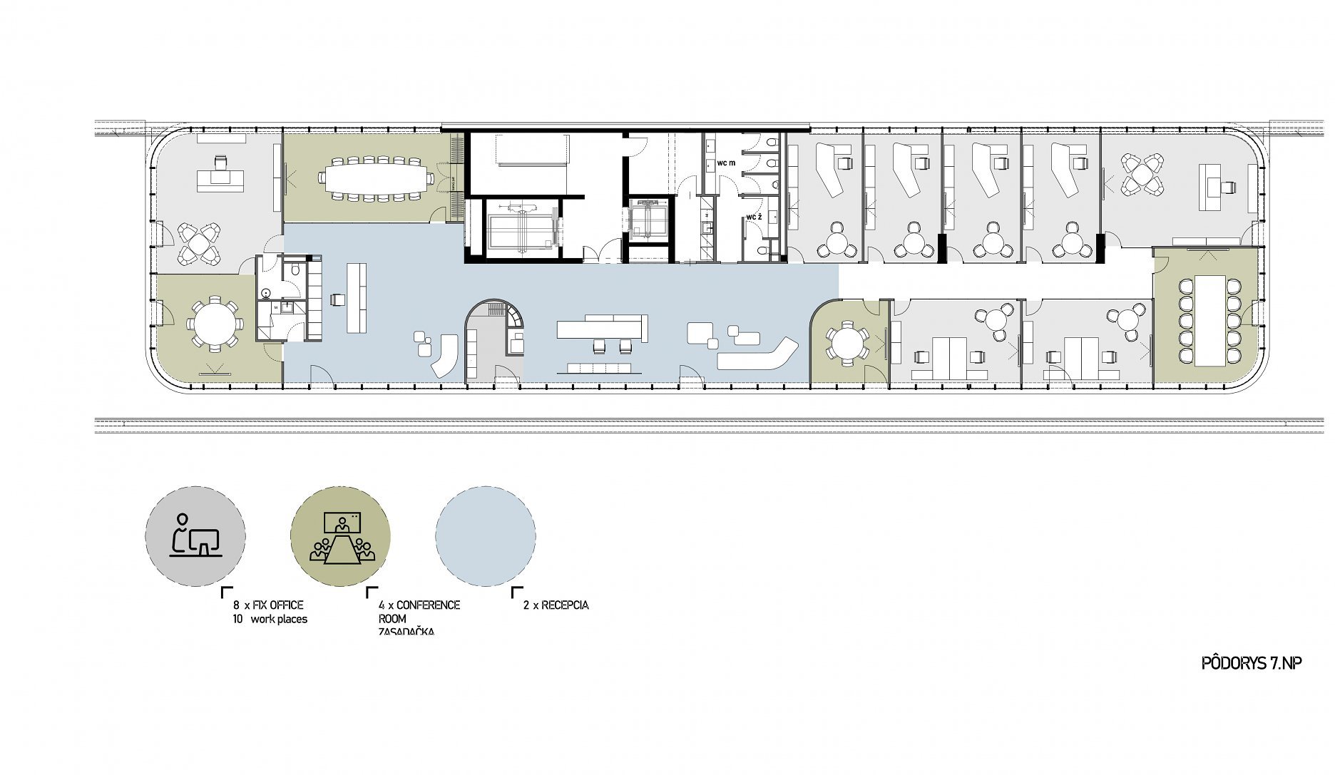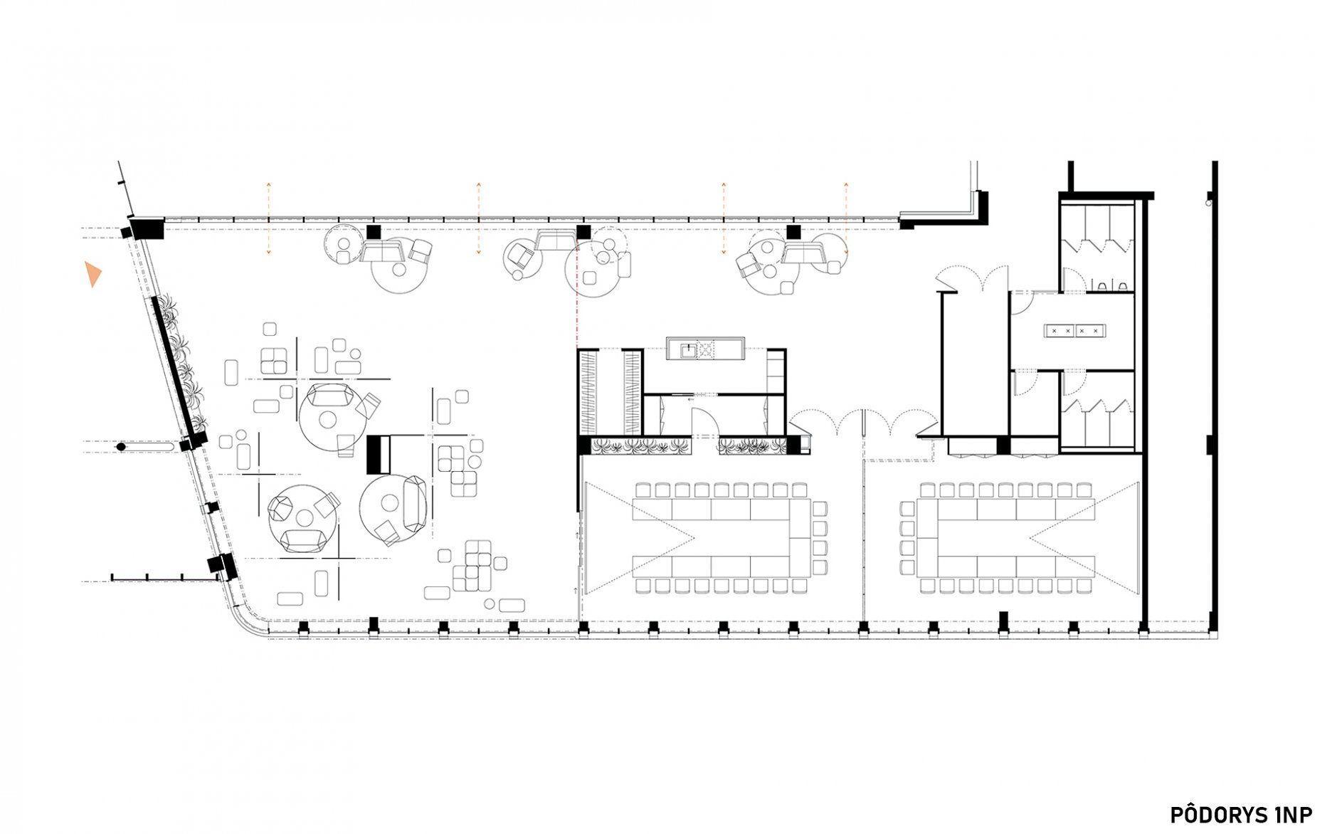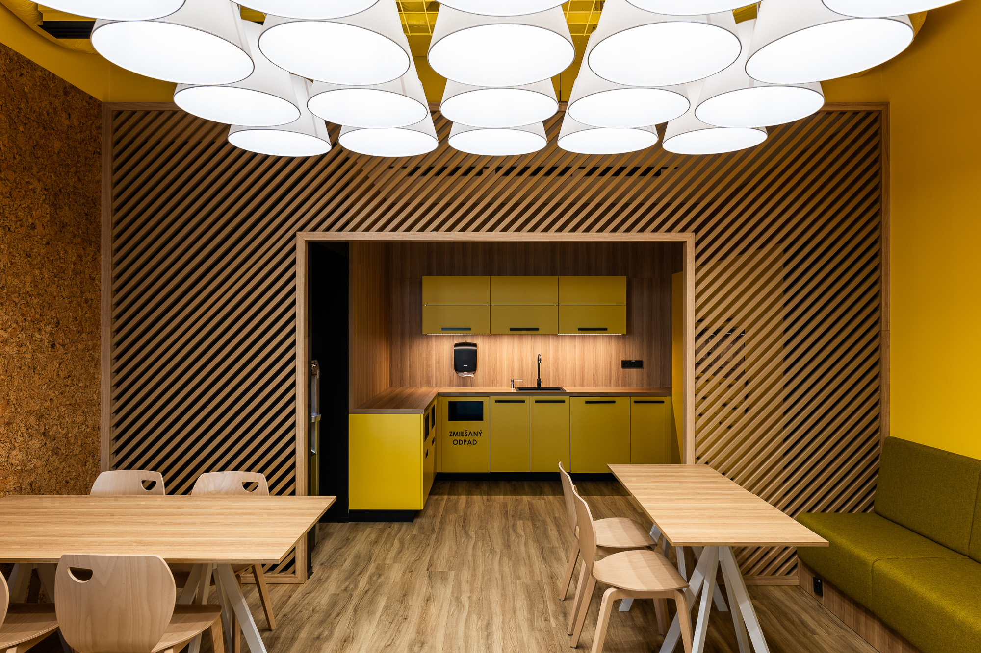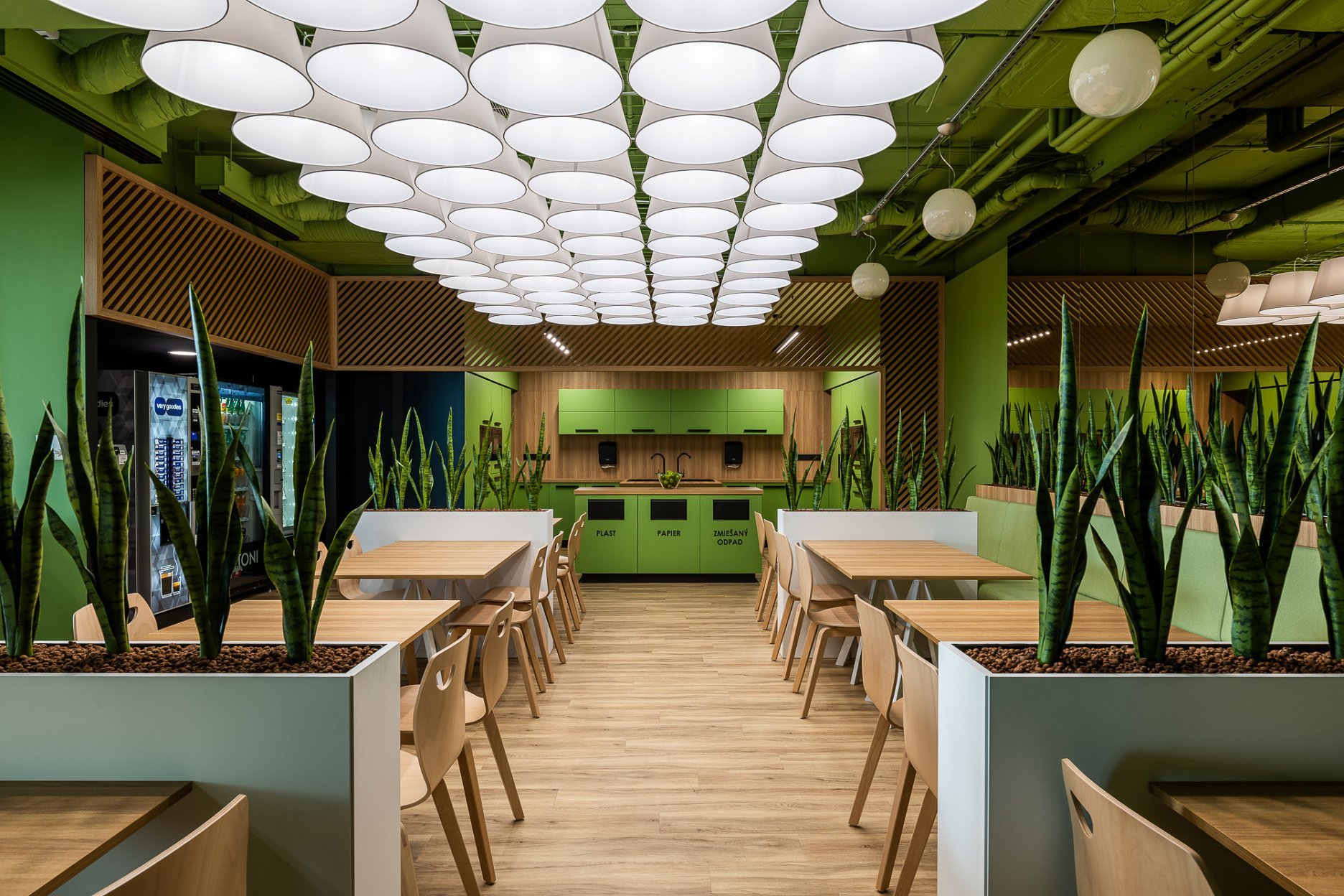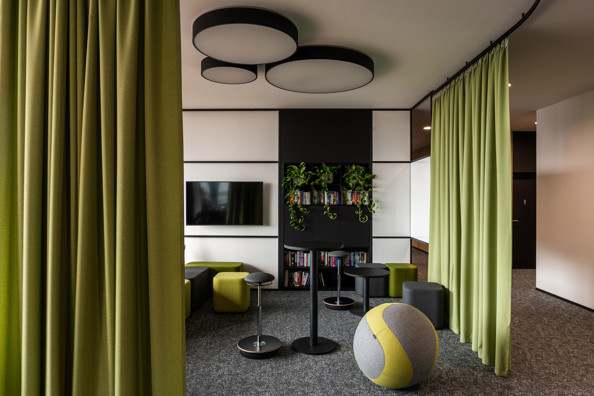 Dispozícia pracovných priestorov je efektívna a prehľadná, no zároveň funkčne, priestorovo a vizuálne bohatá. Namiesto tradičných chodieb vytvárame multifunkčný, pôdorysne členitý (a skutočne) komunikačný priestor, ktorý tvorí chrbticu celej prevádzky. Vznikajú v ňou "zálivy", naplnené pracovnými či oddychovými mikropriestormi, ktorých úlohou je spájať ľudí, podporovať sociálny a pracovný kontakt medzi kolegami. Vďaka internému schodisku prestávajú byť podlažia bariérou pre tento kontakt. Dôraz sme kládli aj na oddychové priestory, najmä ich správnu funkčnú segregáciu. Gastro zariadenia sa členia od malých coffee pointov, cez uzatvorené kuchyne s jedálňou až po firemnú kaviareň.